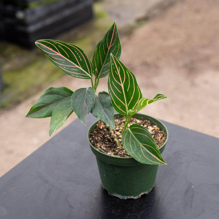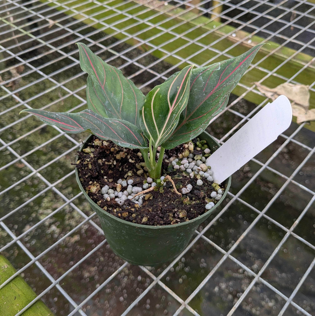 Aglaonema 'Red Veins' has lush, glossy leaves of deep green hues adorned with intricate red veins. For best color and growth provide with bright indirect light, Aglaonema will also grow well in medium to low light conditions. Allow top 2" of soil to dry between watering, but is a very forgiving plant if you forget to water occasionally - perfect plant for beginners! Keep above 60F.