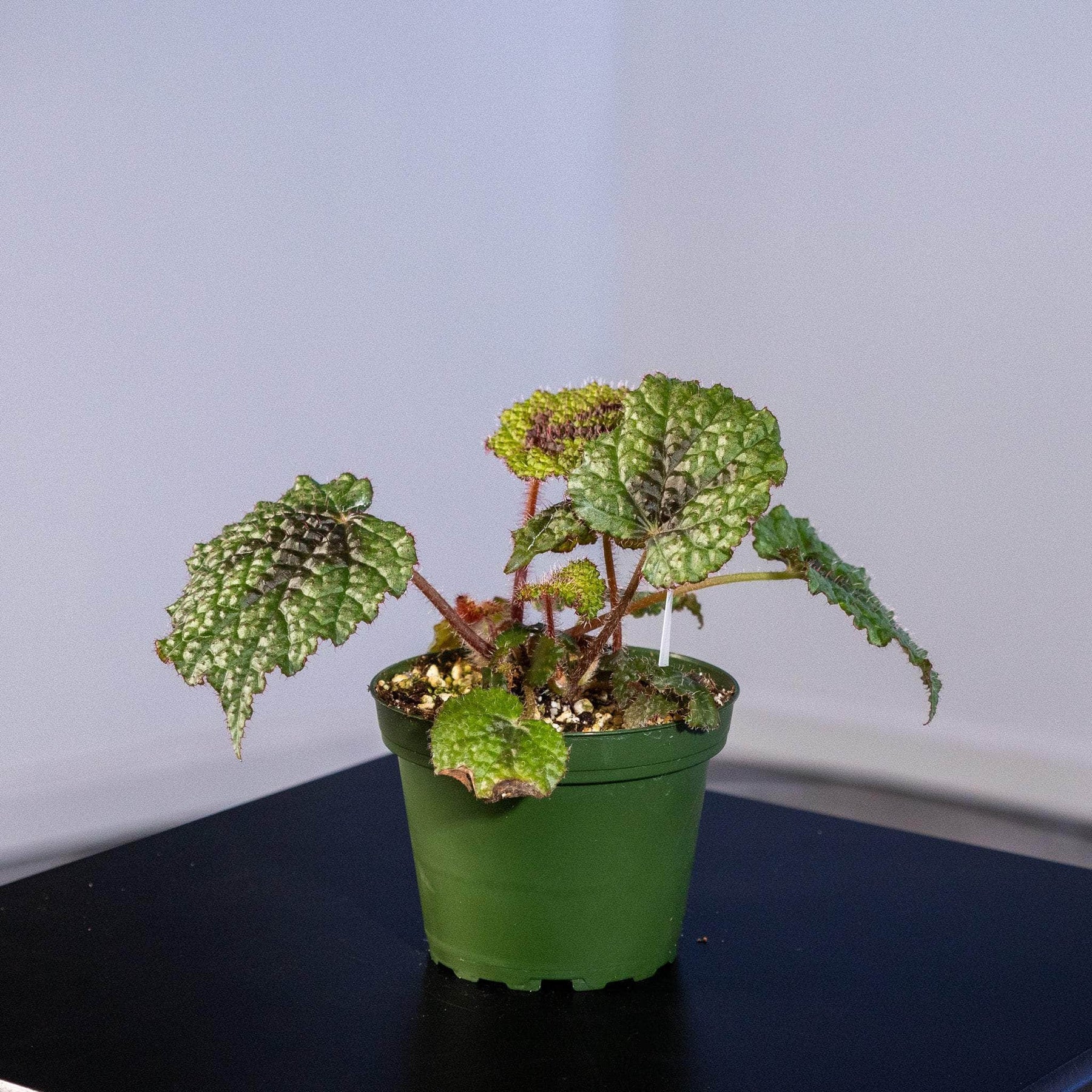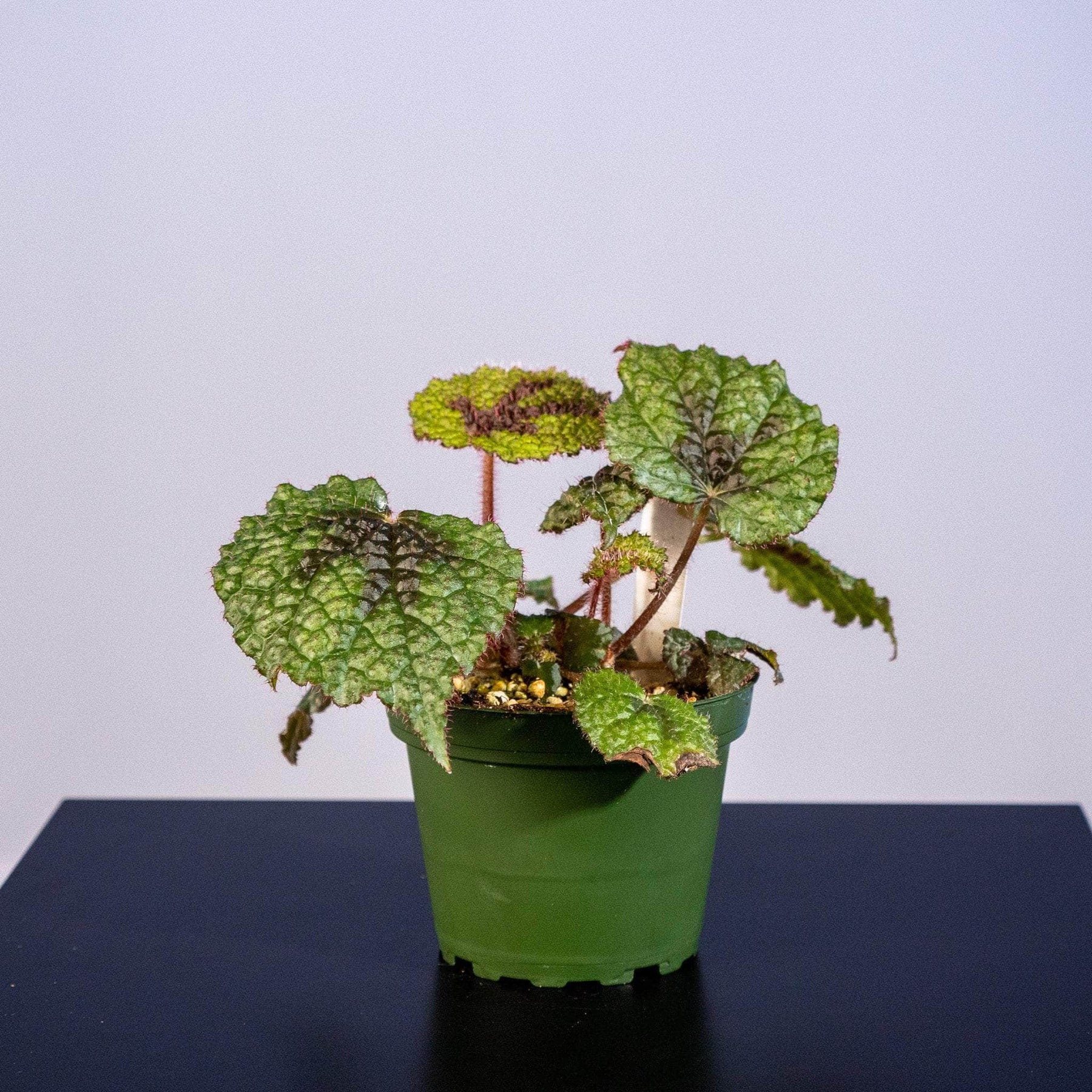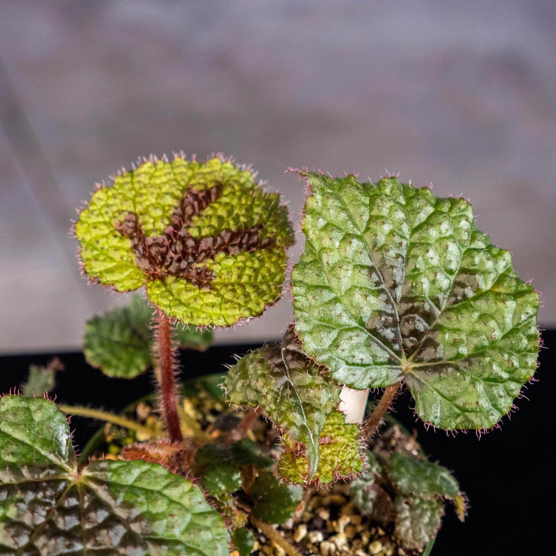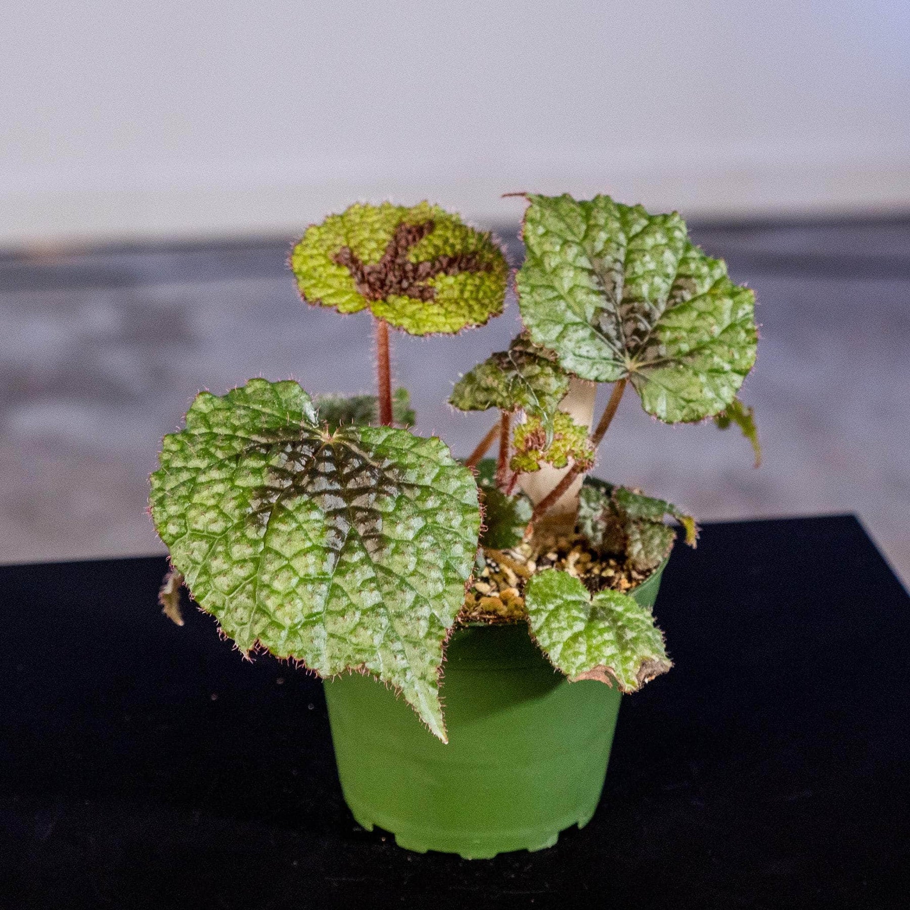 Begonias enjoy lots of bright indirect light, but no direct sun. These can grow in artificial light like fluorescent, although experiences vary. Let the top of the soil dry before watering again. They enjoy a good soak, but need to dry out mostly between watering. They like warmer temperatures and should not be subjected to under 60 degrees. Although Begonias like humidity, they do not like being misted. Because of their textured surface, molds and mildew can form if the plant leaves are overly wet.