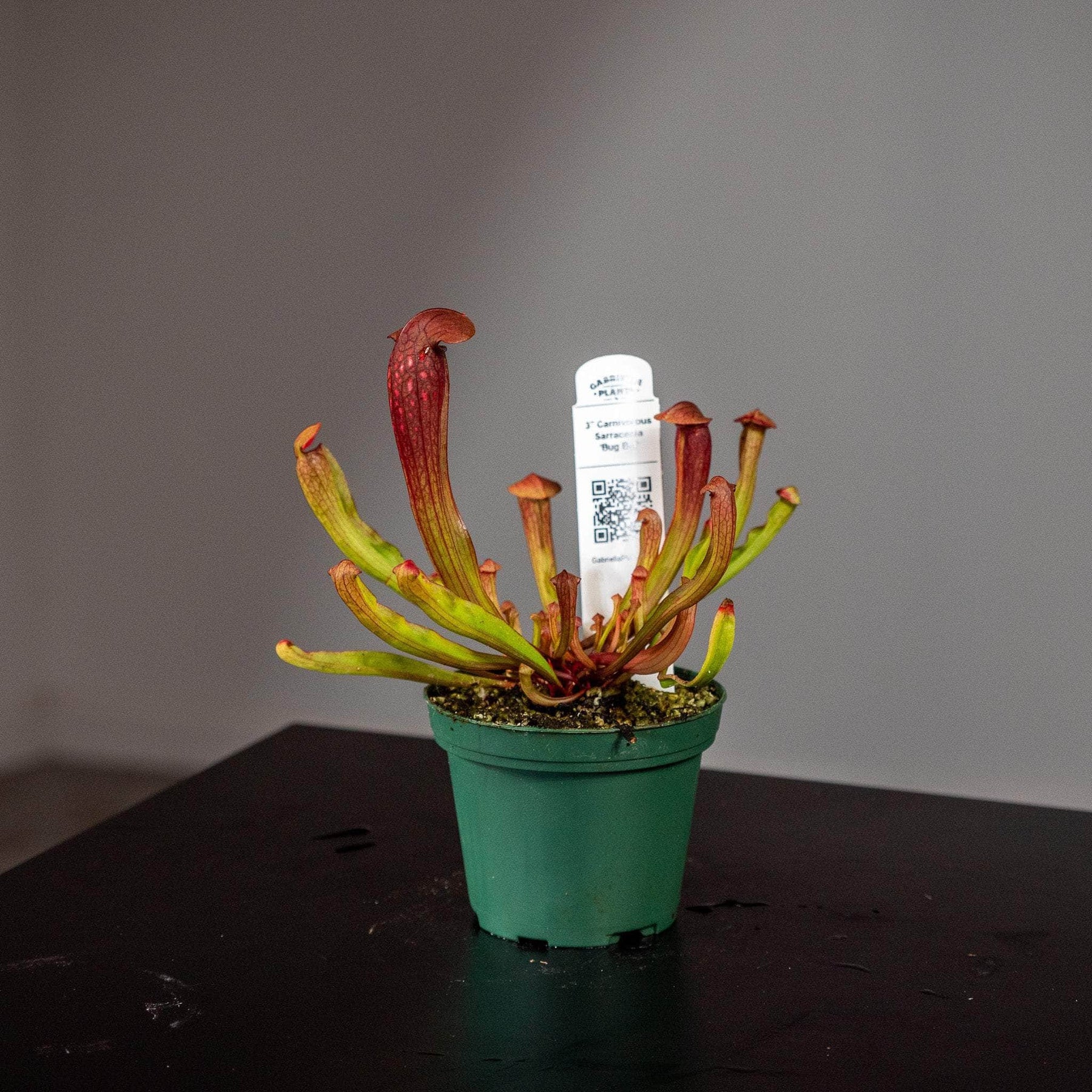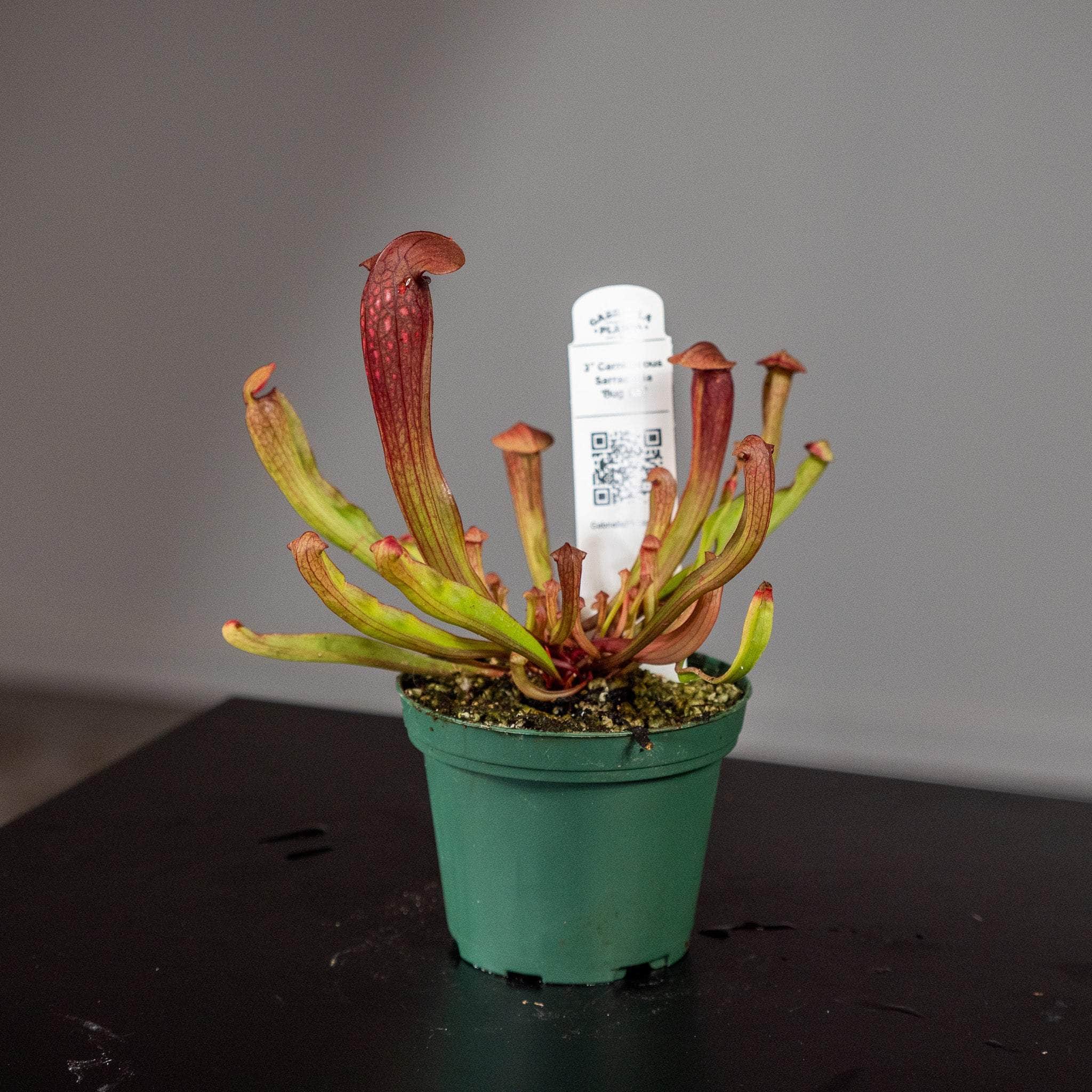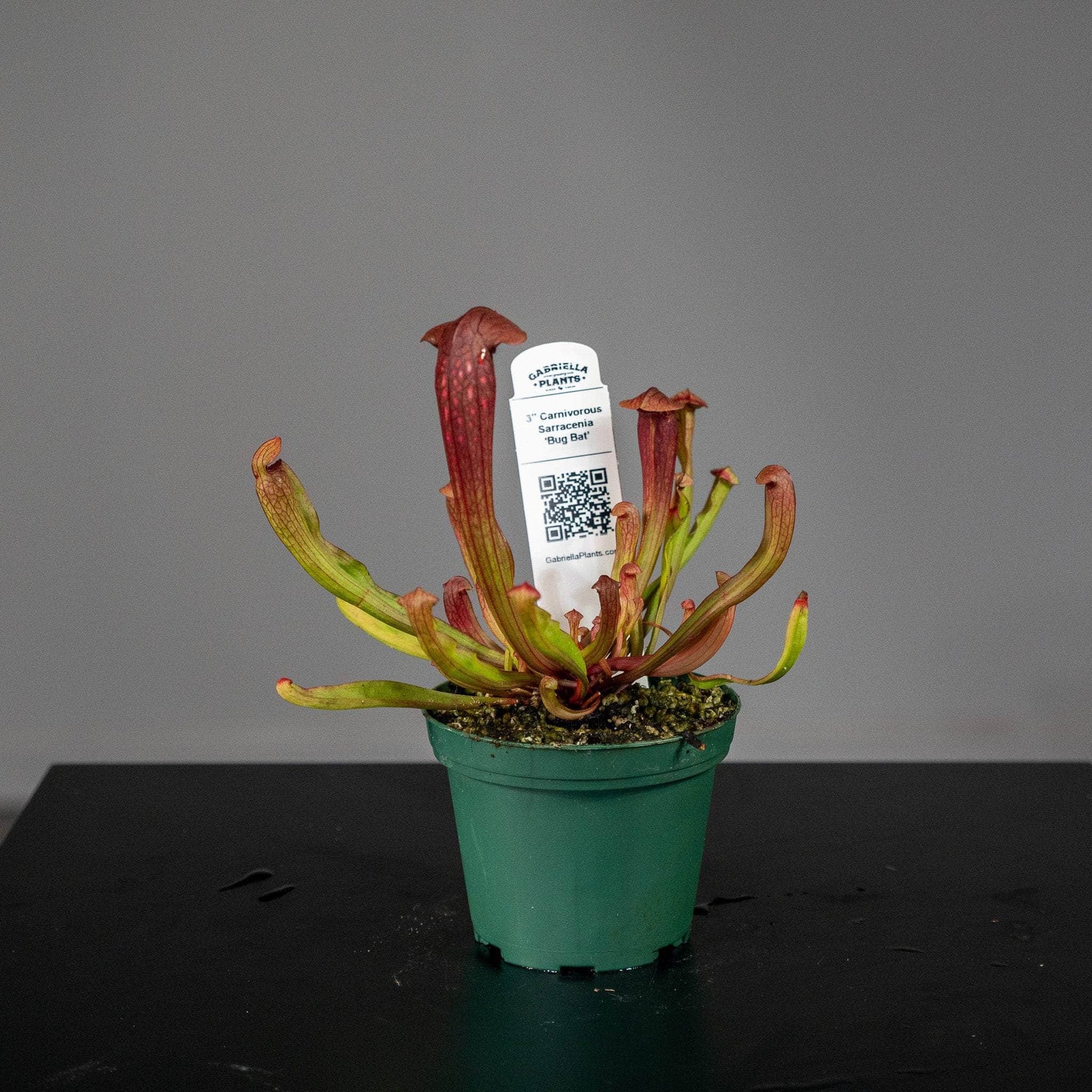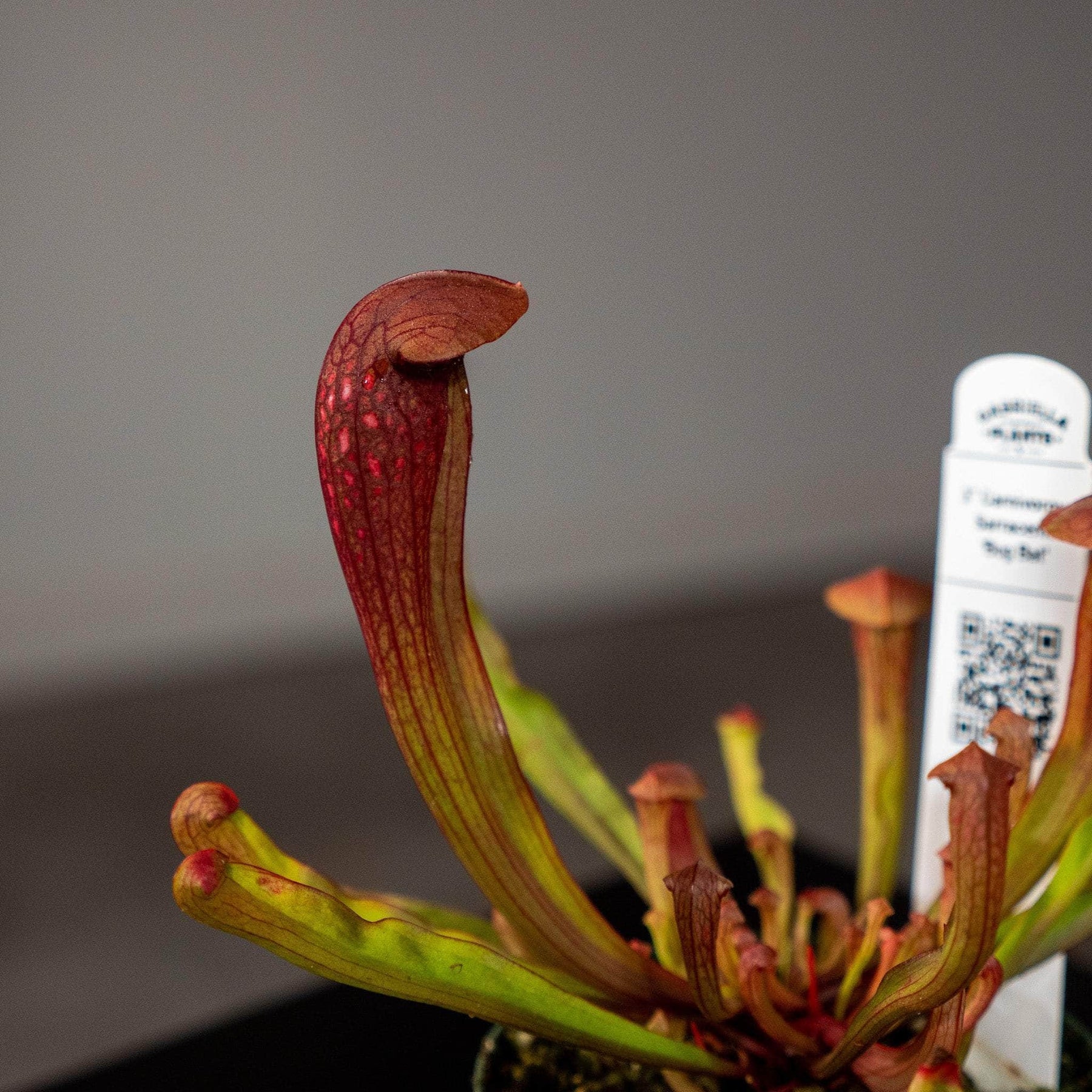 This American Pitcher Plant features tall copper-red pitchers and white spots with rounded hoods! Sarracenia 'Bug Bat' is believed to be a complex hybrid of (S. alata x psittacina) x minor.