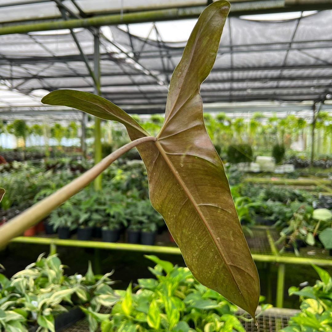 Philodendron mexicanum is an easy climber that grows both as a terrestrial plant and as an epiphyte on the sides of trees. Foliage gets very large as it matures, approximately 2' long and 1' wide! The leathery arrow shaped dark green leaves with magenta to maroon undersides have unequal basal lobes, making it appear to be three leaves due to the upper dog-eared lobes.