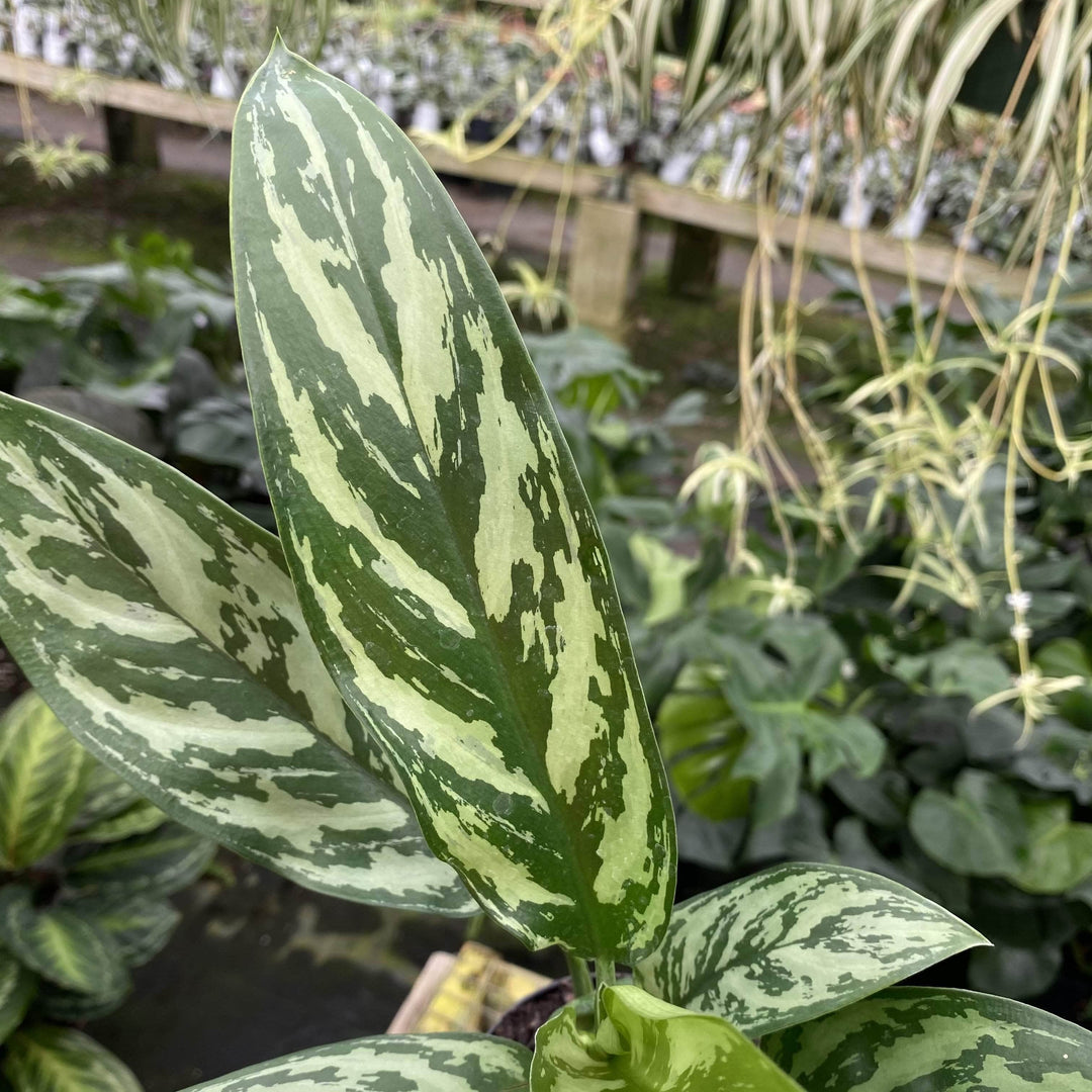 Aglaonema 'Tigress' has vividly striped leaves and is a great, easy houseplant! Aglaonema will grow well in medium to low light conditions, for best color and growth provide with bright indirect light. Allow top 2" of soil to dry between watering, but is a very forgiving plant if you forget to water occasionally - perfect plant for beginners! Keep above 60F.