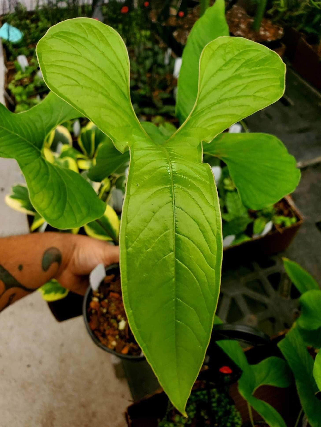 Anthurium draconopterum is a rare and beautiful species that develops deeply trilobed foliage reminiscent of a flying dragon. The leaf blades develop profound lobes with the base of the anterior lobes constricted, has numerous veins that give it a lightly textured feel.