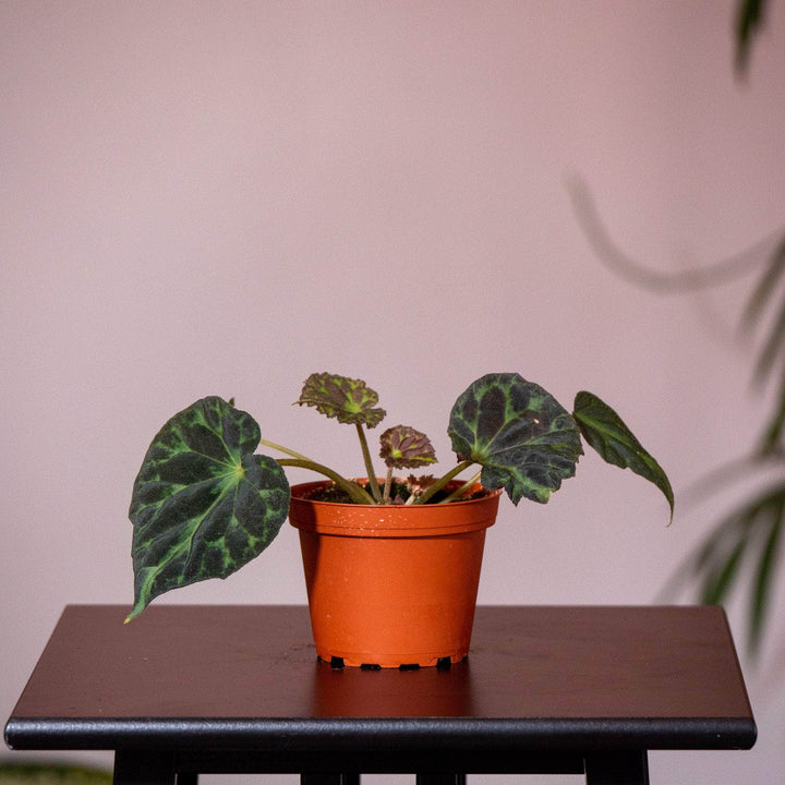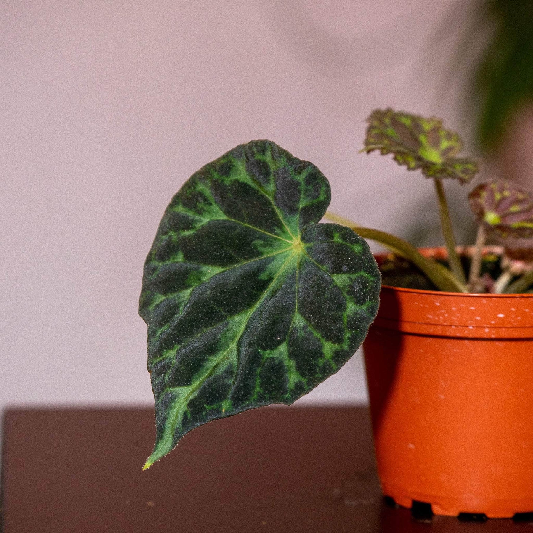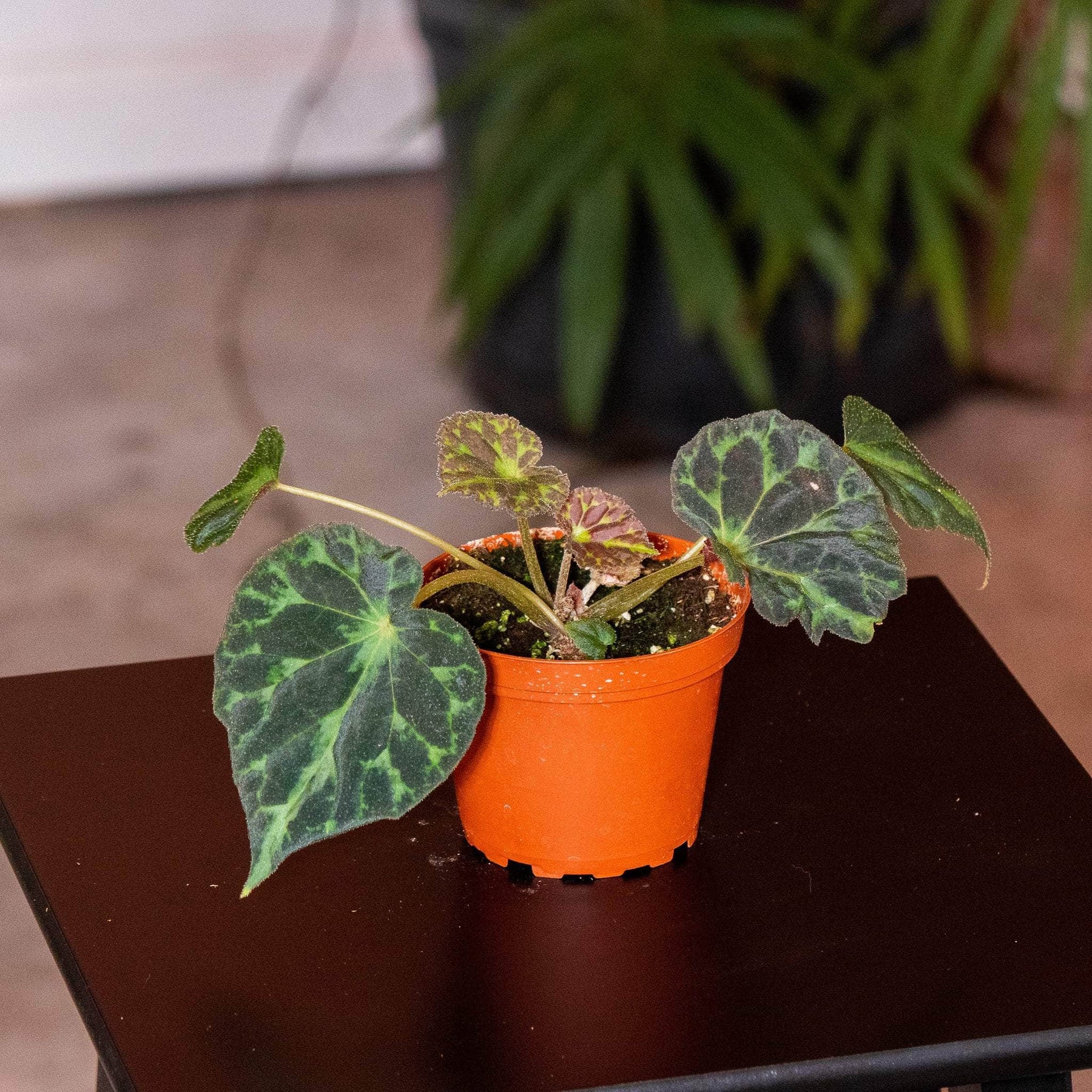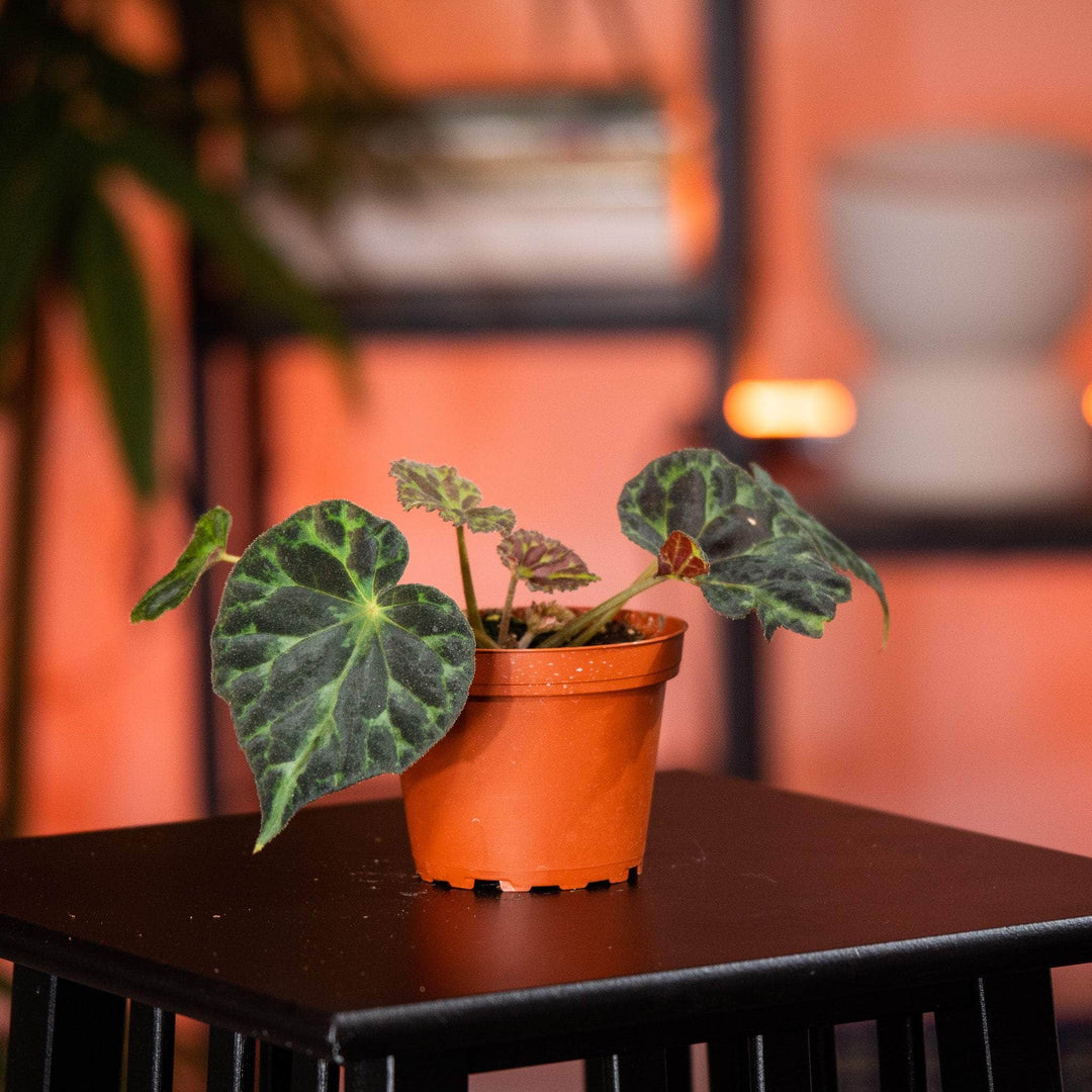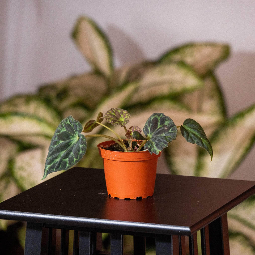 Begonias enjoy lots of bright indirect light, but no direct sun. These can grow in artificial light like fluorescent, although experiences vary. Let the top of the soil dry before watering again. They enjoy a good soak, but need to dry out mostly between watering. They like warmer temperatures and should not be subjected to under 60 degrees. Although Begonias like humidity, they do not like being misted. Because of their textured surface, molds and mildew can form if the plant leaves are overly wet.