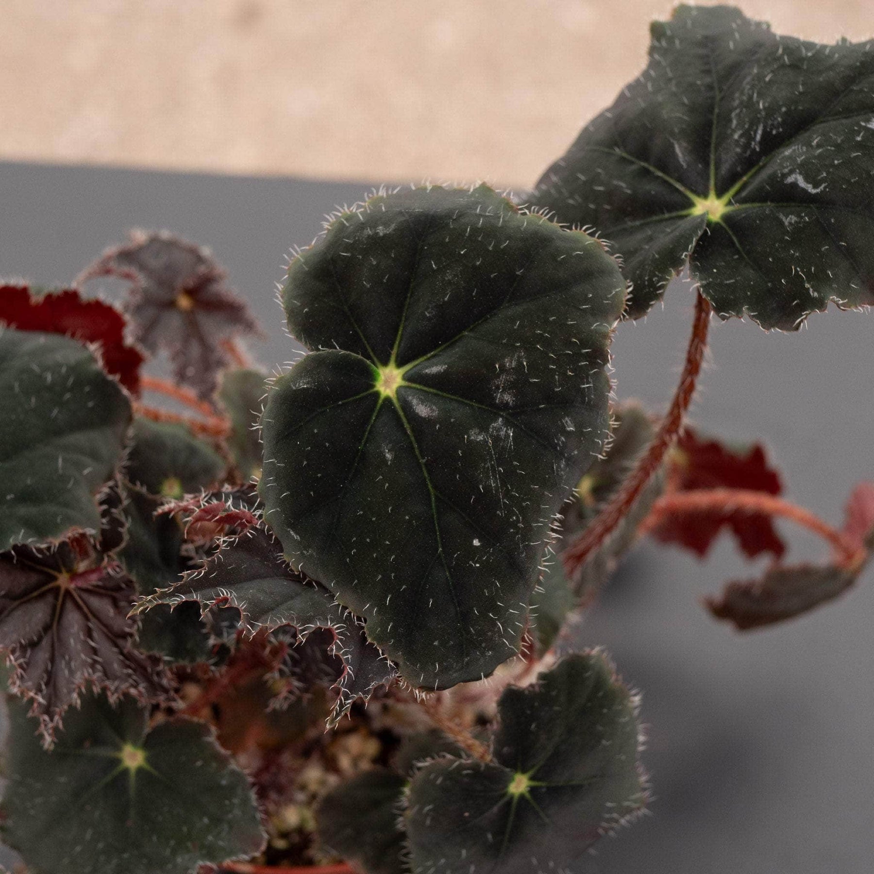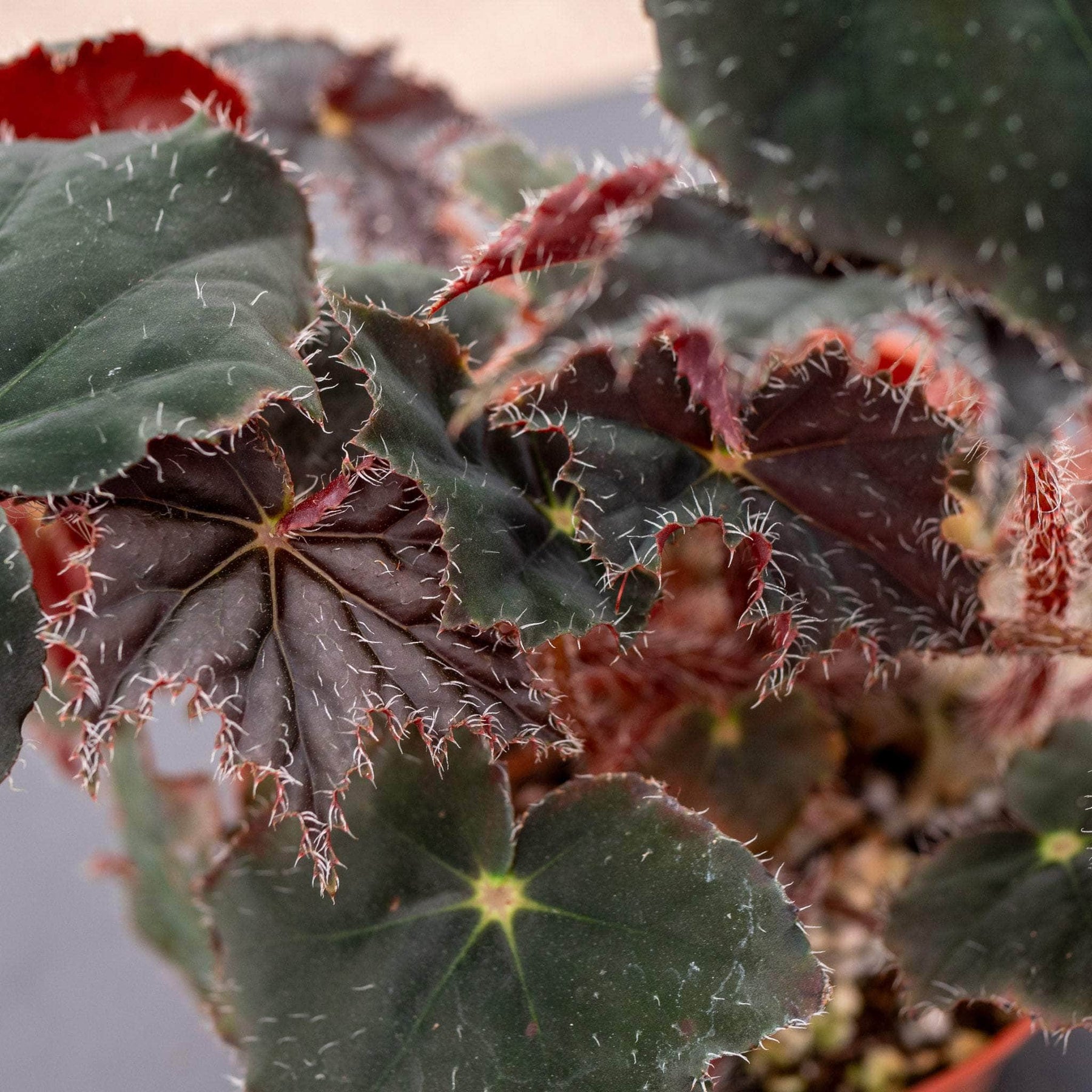 Begonia 'Black Velvet' foliage has serrated edges that grow to be maple-shaped over time. Leaves sit atop hairy stems, and are studded with wisps of fine, eyelash-like hairs, consistent with its common name, the “eyelash begonia”.
