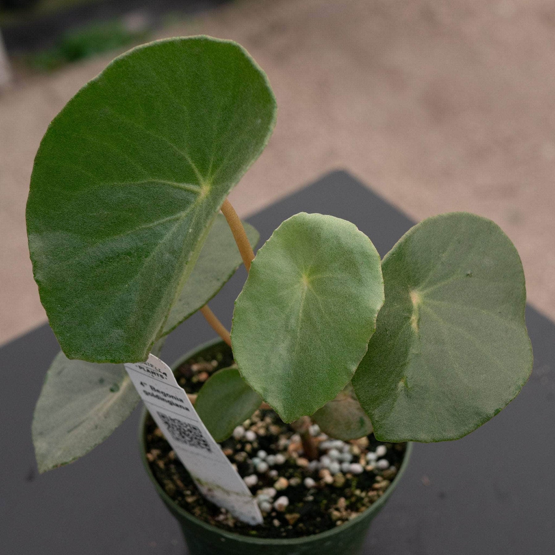 This Begonia has leaves that are covered in fine hairs like felt that helps slow water loss from the leaves and will rub off if handled too much. This Begonia likes to be dry to be sure not to over water!