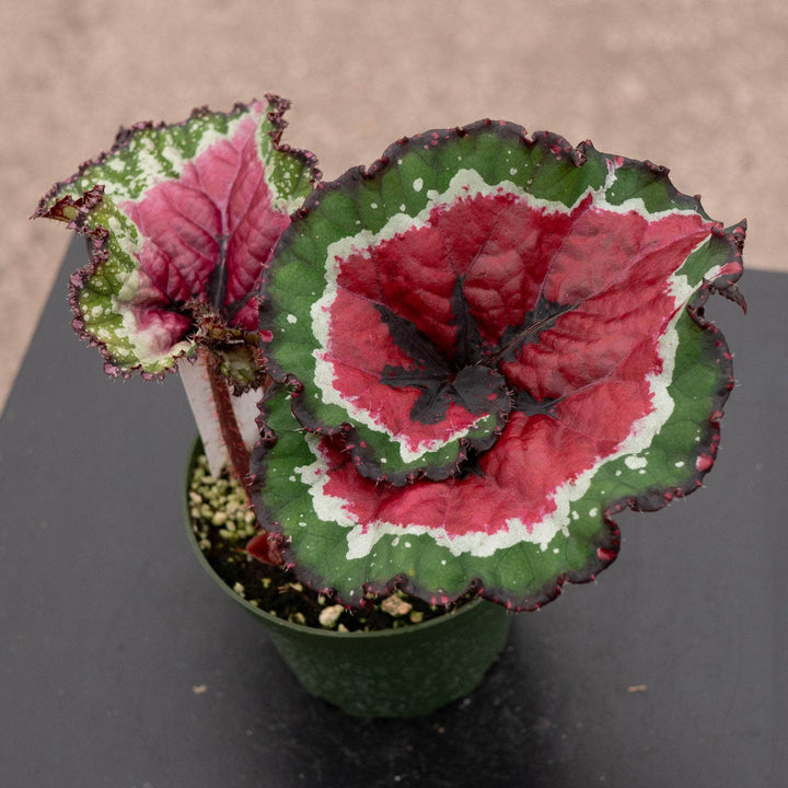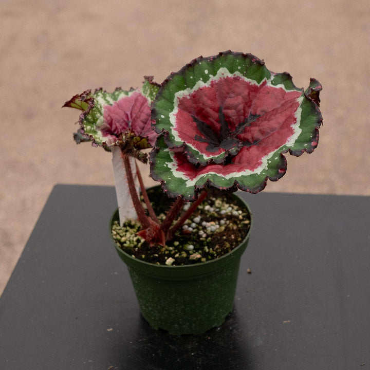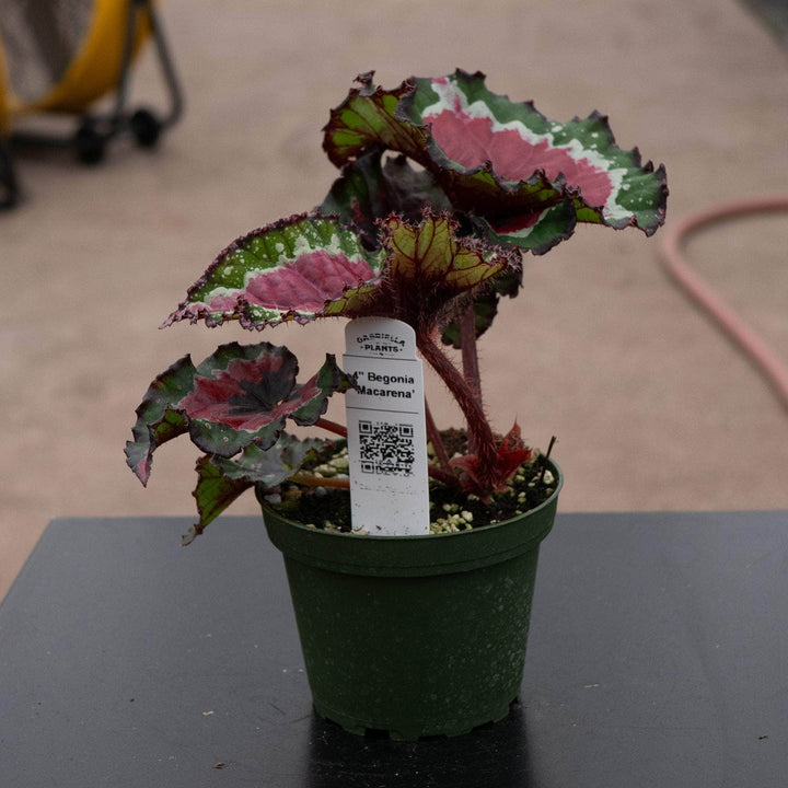 Begonia 'Macarena, also known as the Painted-Leaf Begonia or King Begonia, is a popular indoor plant prized for its vibrant and colorful foliage in a striking combination of pink, green, and white, with the pink and green colors appearing in distinct sections and the white as spots over the green as it matures