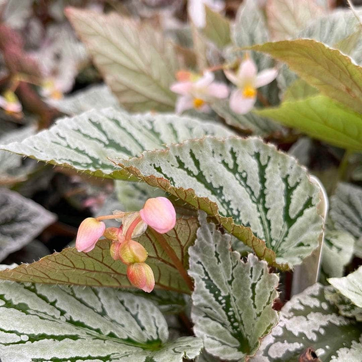 NEW Begonia Rex cultivar 'Jurassic Dino Greenie' has a compact growth habit and small to medium sized foliage in minty green with a silver sheen and dark green veins.
