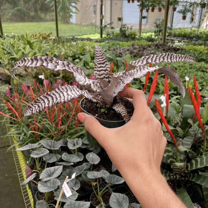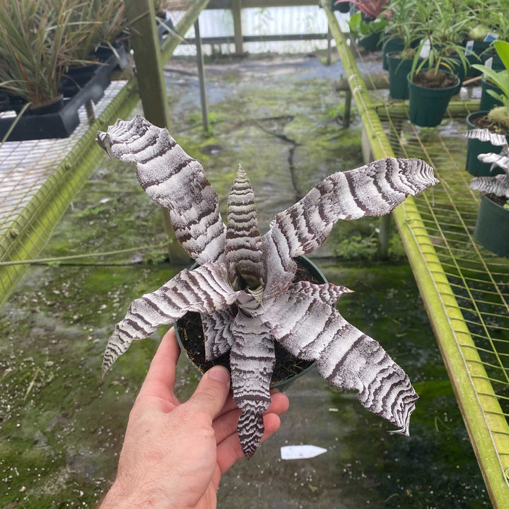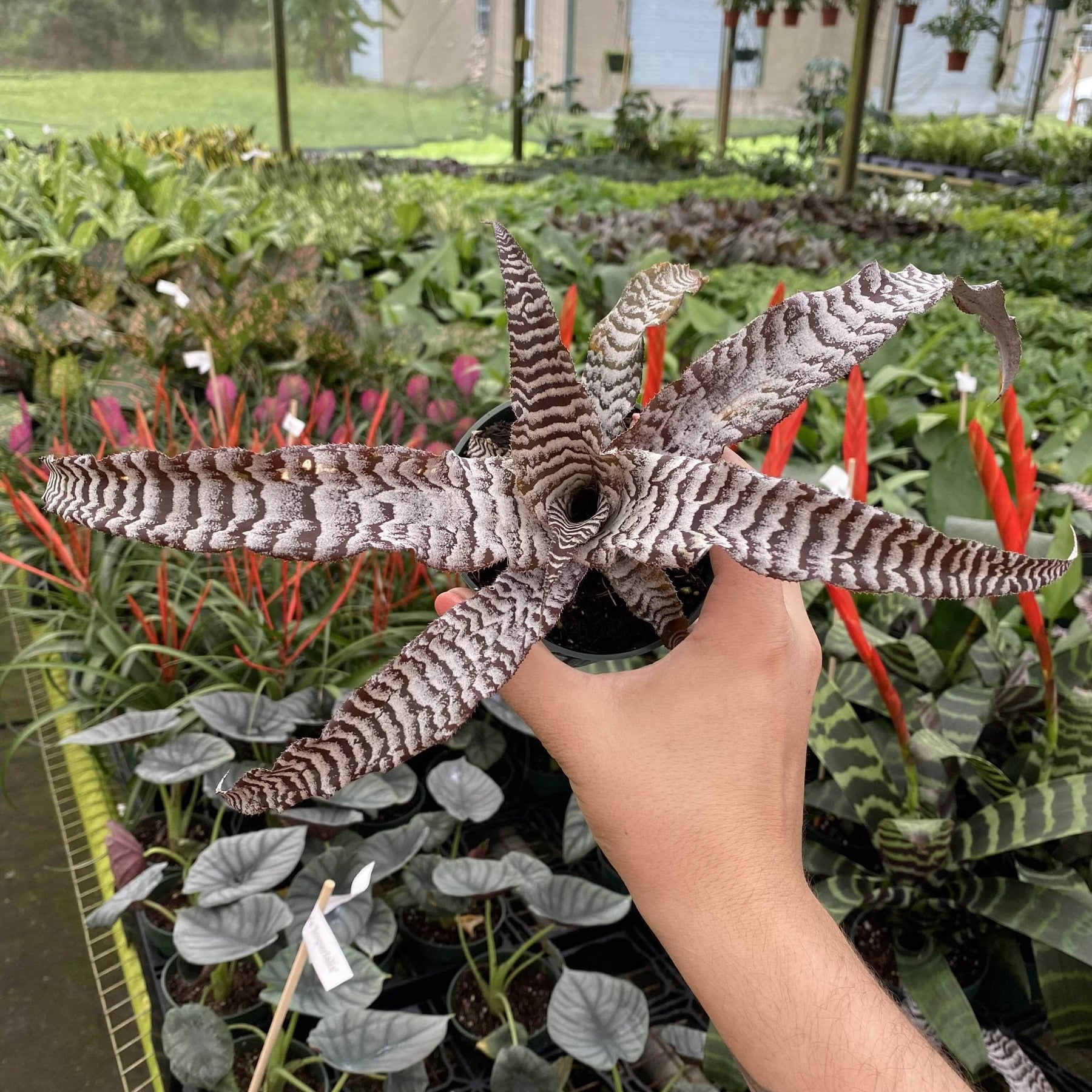 Cryptanthus 'Absolute Zero' has dramatic dark brown to almost black base color with striking silver bars across each leaf.