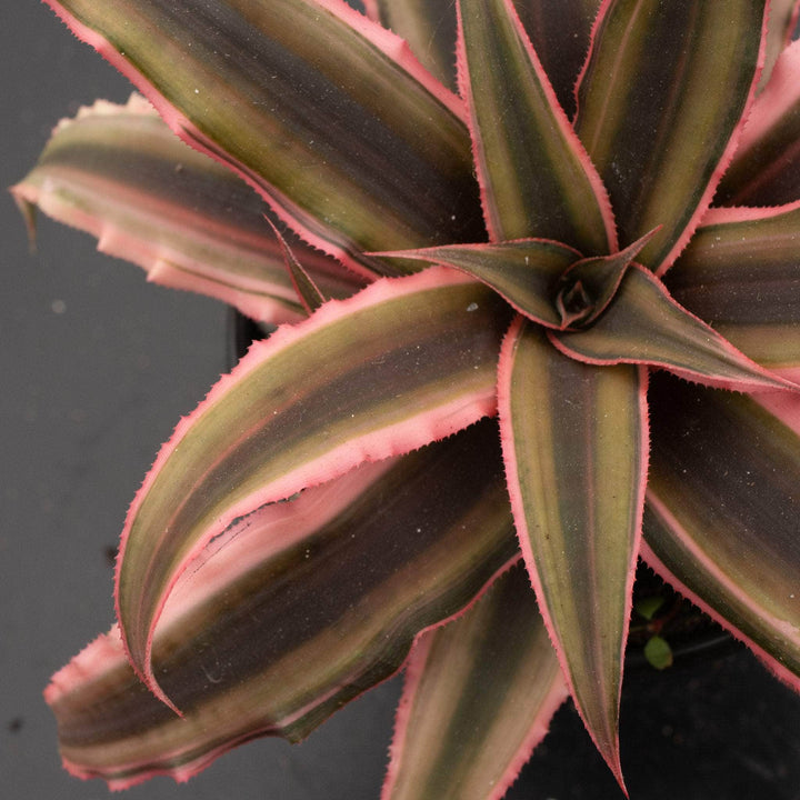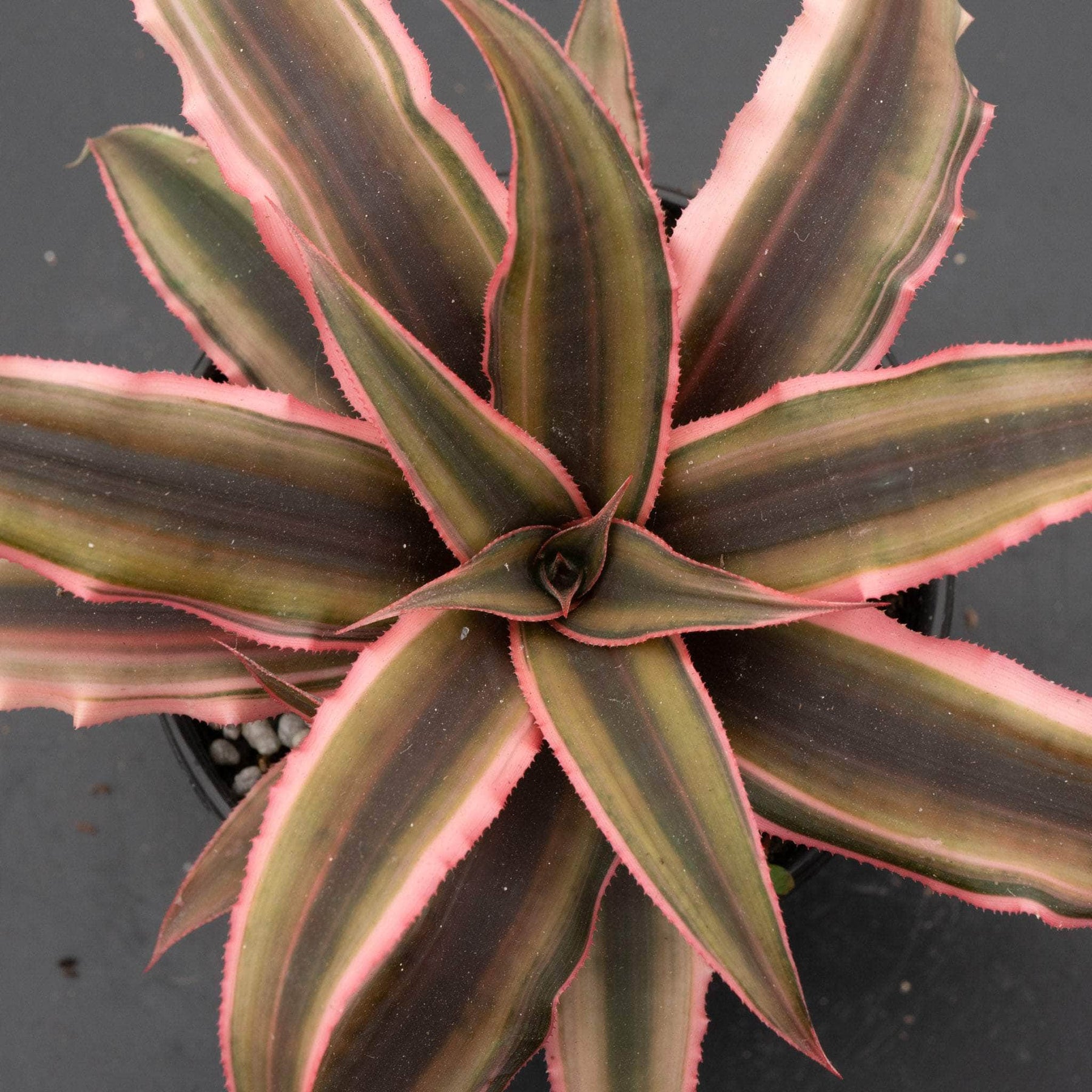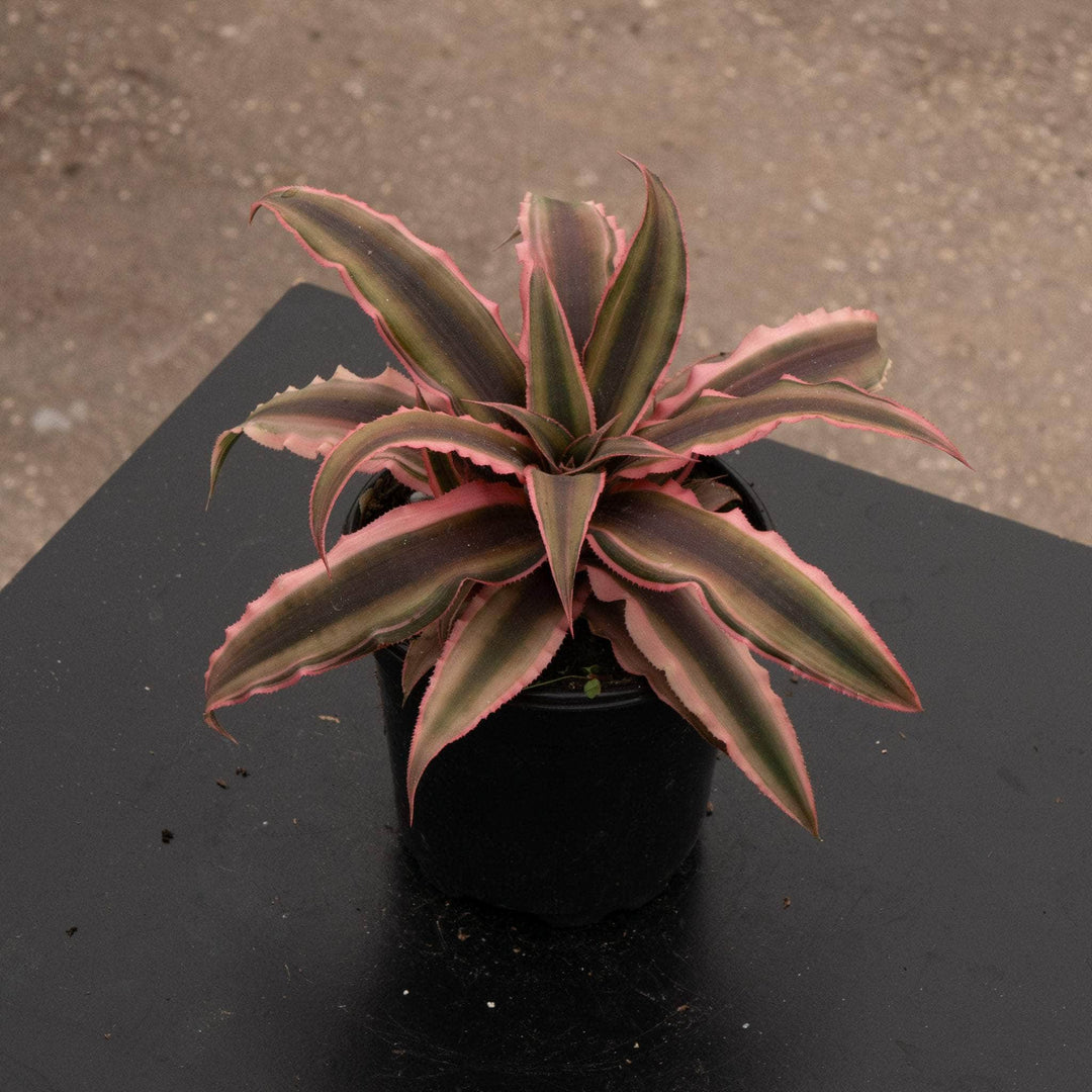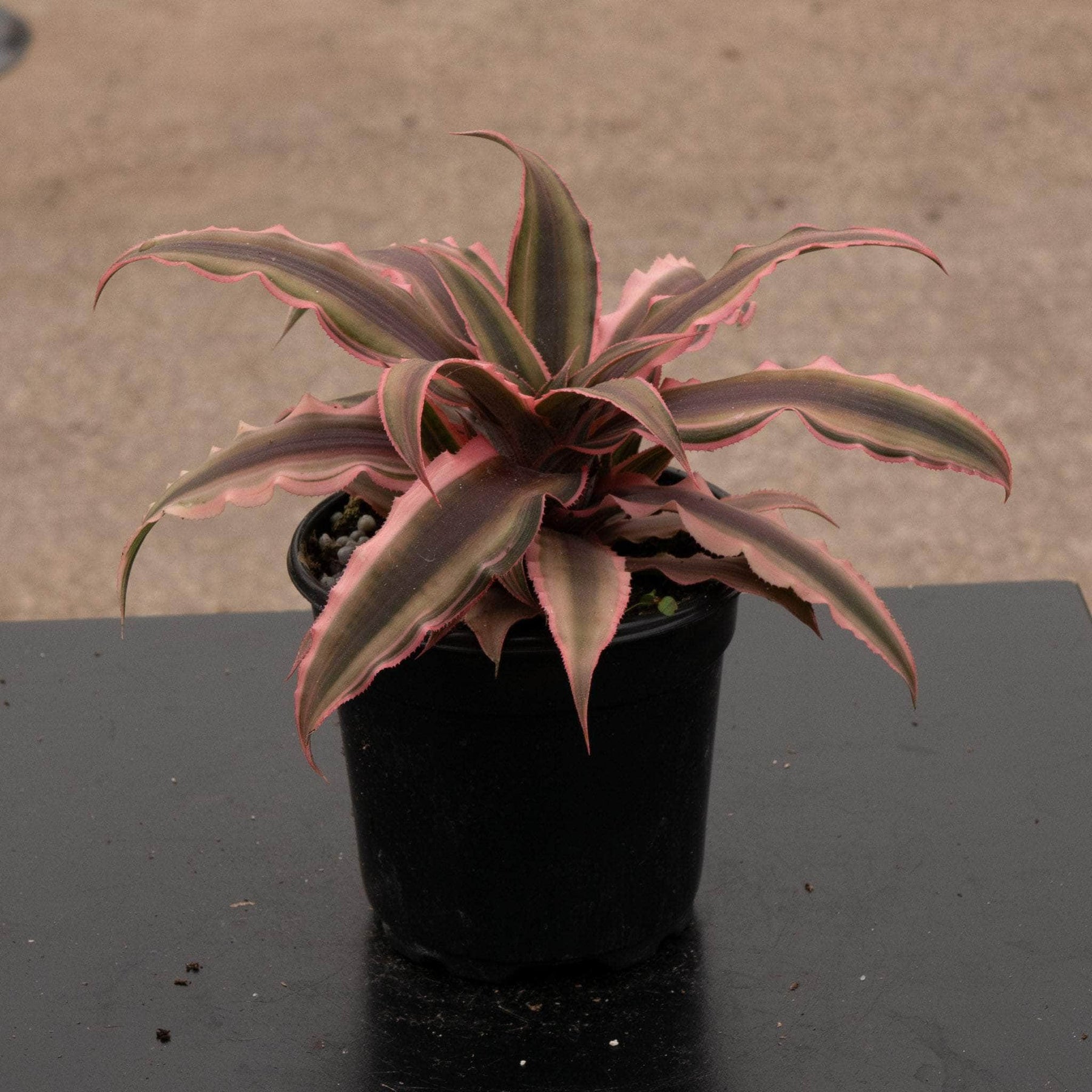 Cryptanthus are commonly referred to as “Earth Stars”. Keep the soil damp at all times during the growing season, minimize water in winter. Prefers bright indirect light, will tolerate a bit of early morning or late afternoon direct sun, midday sun can scorch the leaves. Protect from temps below 40F.