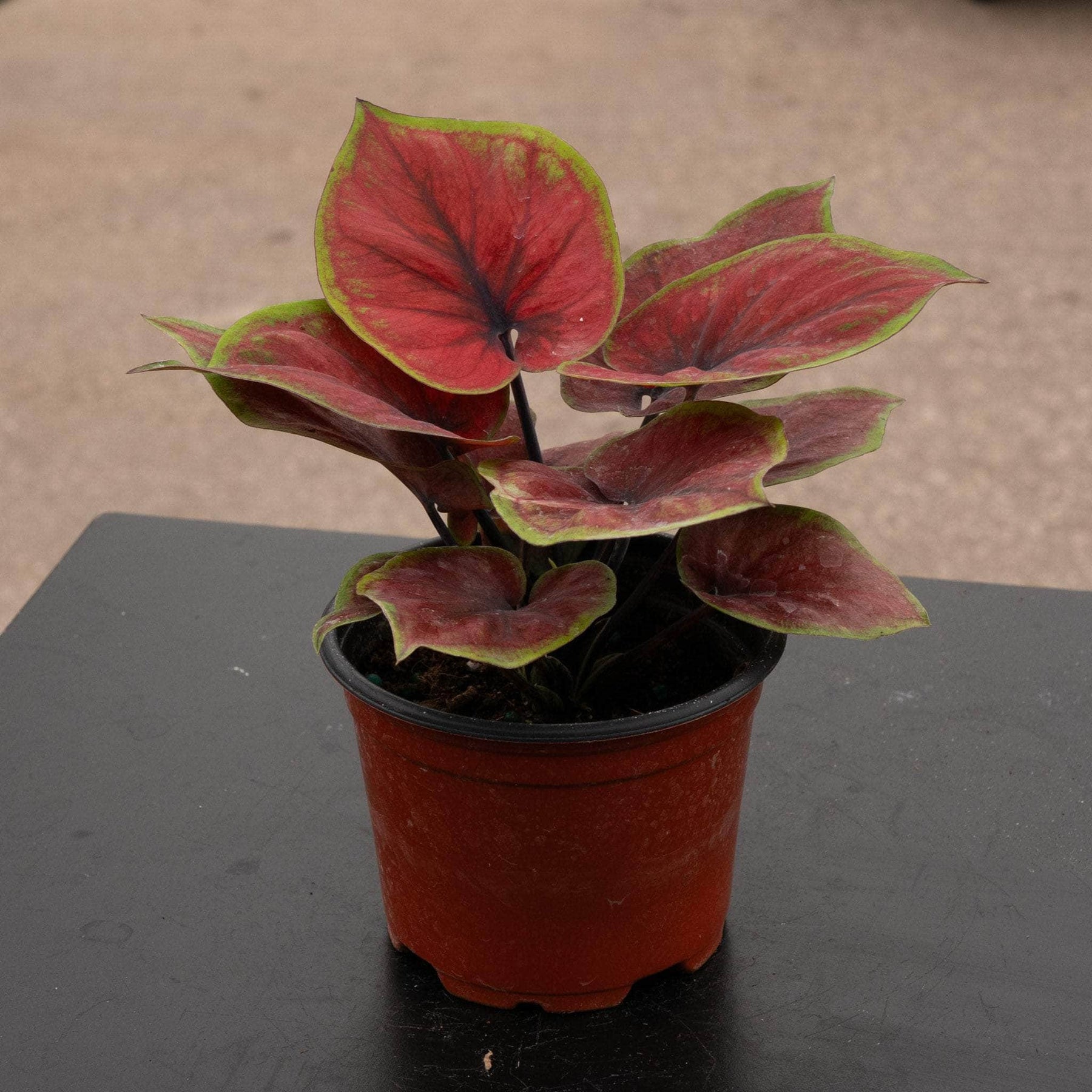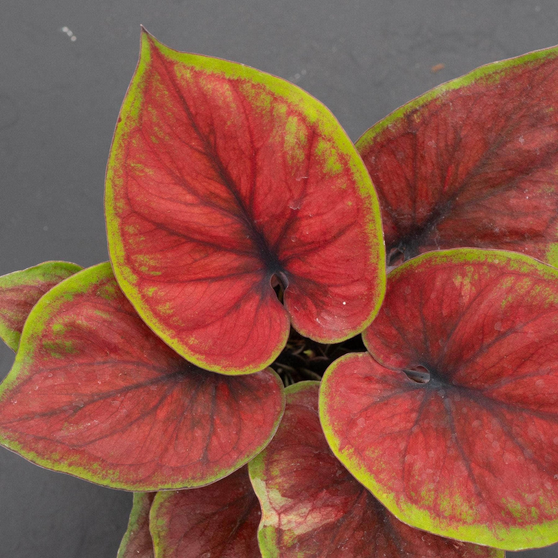 Caladium is a genus of plants in the Araceae family, there are over 1000 named cultivars of Caladium bicolor from the original South American plant. In their natural habitat they go dormant during the dry season. Prefers bright indirect light to moderate shade, water when the top of soil feels dry to touch.