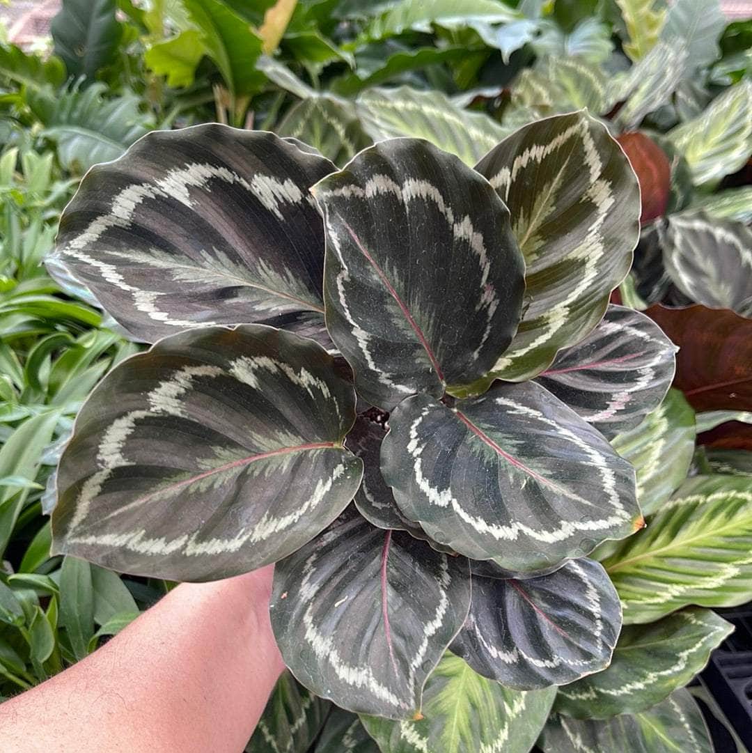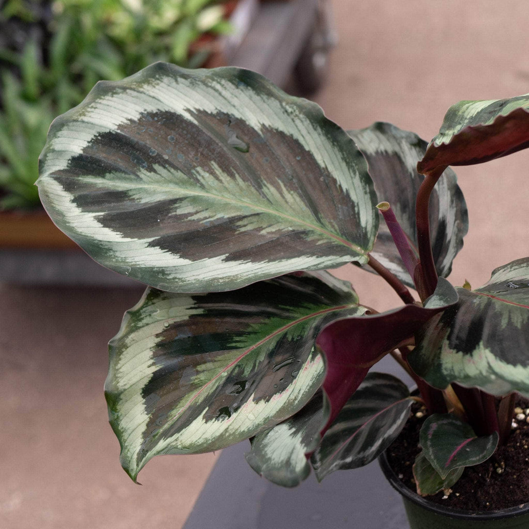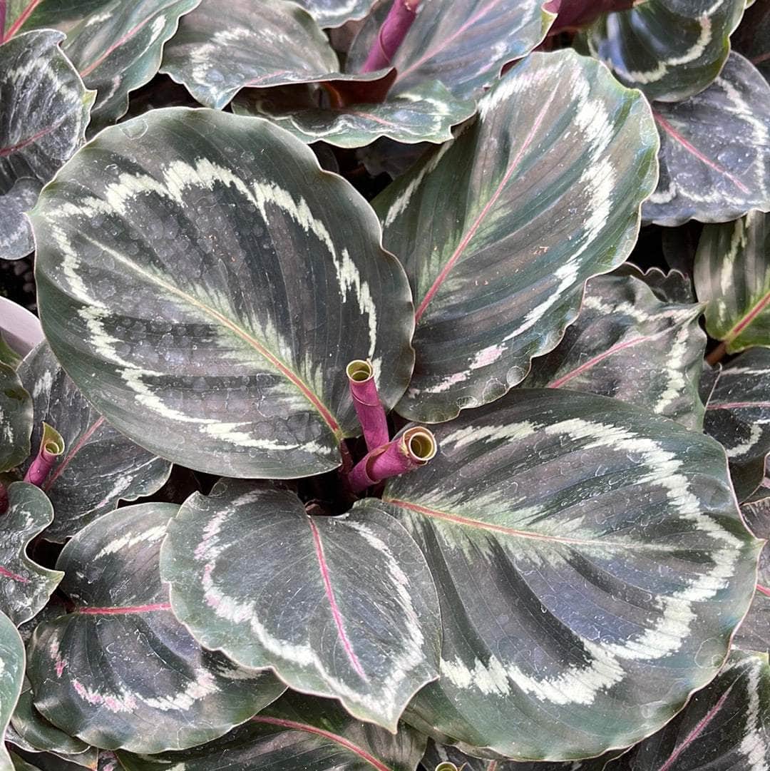 Calathea roseopicta 'Marion' foliage is round, dark green with a bold silvery green band lining the edges of leaves and dark burgundy undersides.