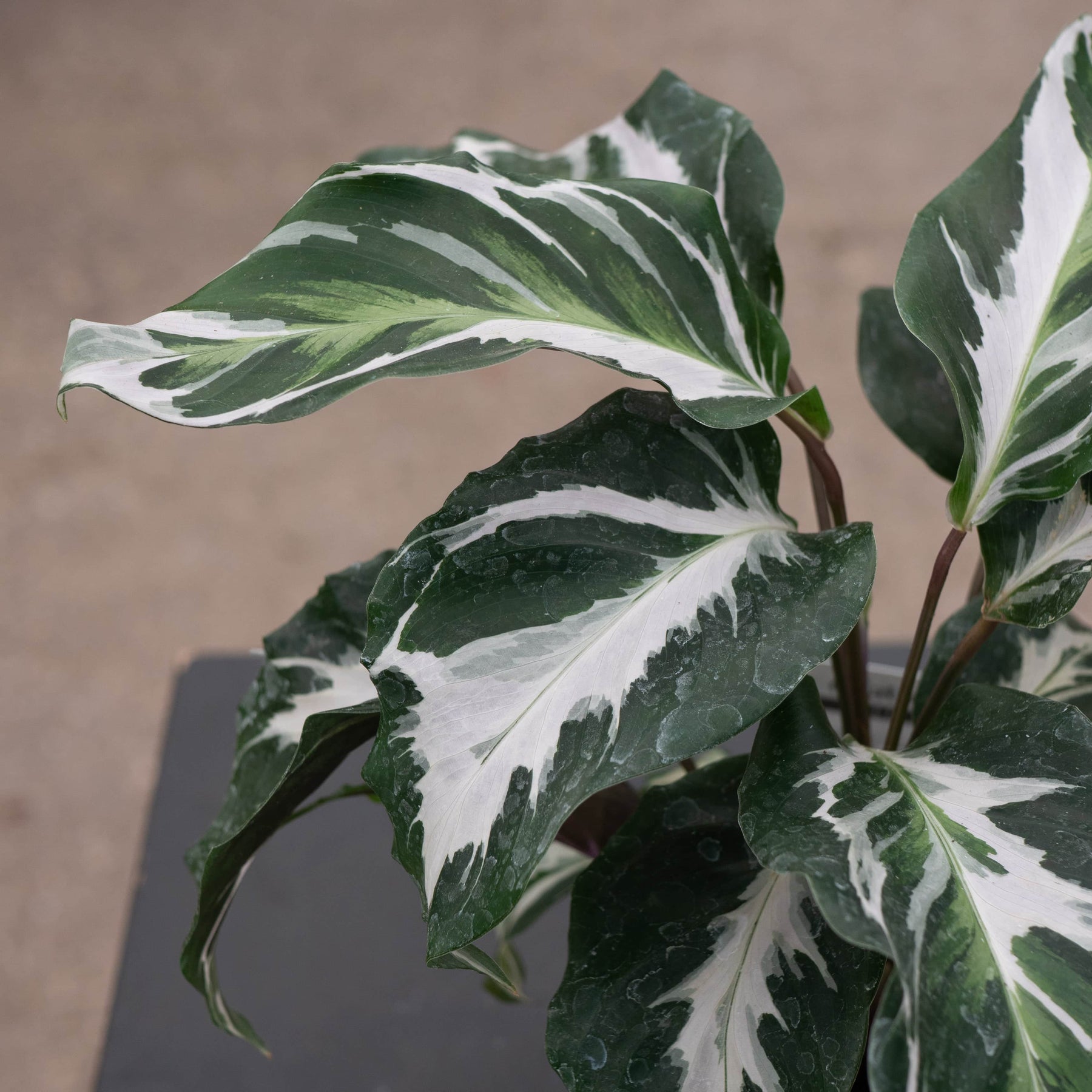 This new Calathea hybrid has beautiful white and green variegated foliage with purple undersides similar to 'White Fusion' but has a faster growth rate and is able to adapt to lower light conditions!