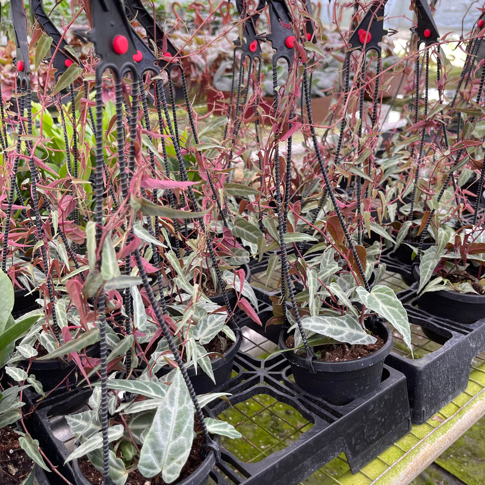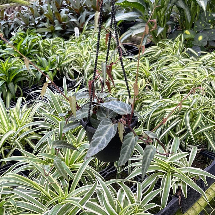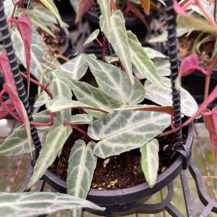 Cissus amazonica has small lance shaped, silver green leaves with brightly colored veins and pink to burgundy undersides. A native to the Brazilian rainforest, it is commonly referred to as Amazon Jungle Vine. It is a fast grower that will cascade over the edge of the hanging basket or if provided with a support will quickly climb and wrap itself around with its long tendrils. As a climber it makes the perfect addition to your climbing philodendrons, filling in the spaces between with its small contrasting leaf shape and color!