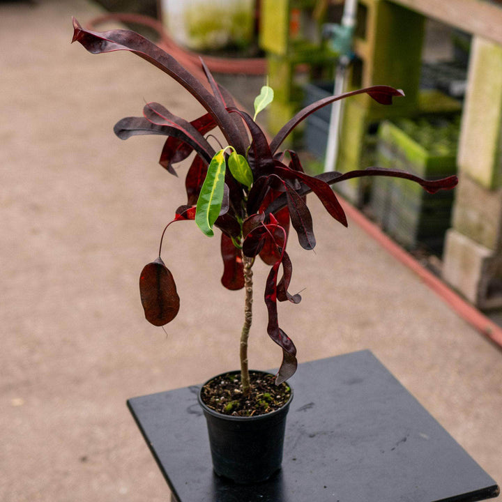 Croton ‘Jester’ thrives with moderate water and bright indirect light. A Jester symbolizes humor, irreverence, challenging societal norms, and embracing the unexpected. This cultivar embodies all those qualities with it’s large, thick, leathery foliage that can be linear, oval, lobed, or wavy, and variegated in shades of white, pink, orange, red, yellow, and purple, like a jester’s brightly colored clothing; and it even develops curious shaped leaf tips that resemble the bells on a jester’s cap!