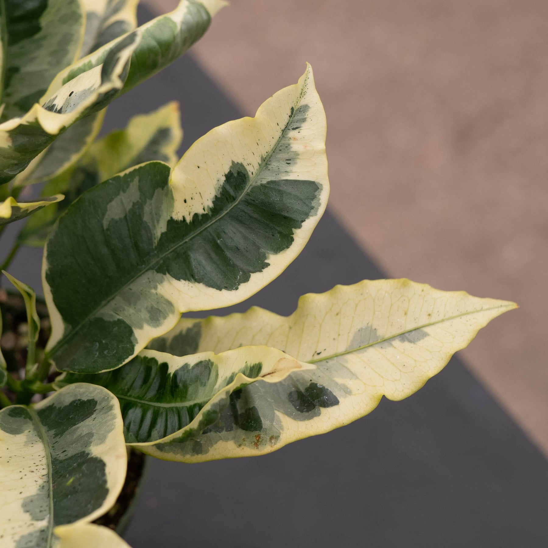Croton 'Tamara’ is a true show stopper! This tender evergreen has an upright and compact growth habit, making it perfect for indoor cultivation. Pearly white and jade variegation pattern on this cultivar is just spectacular. Do not re pot right away, wait until roots fill the pot! Thrives with moderate water, and bright indirect light.