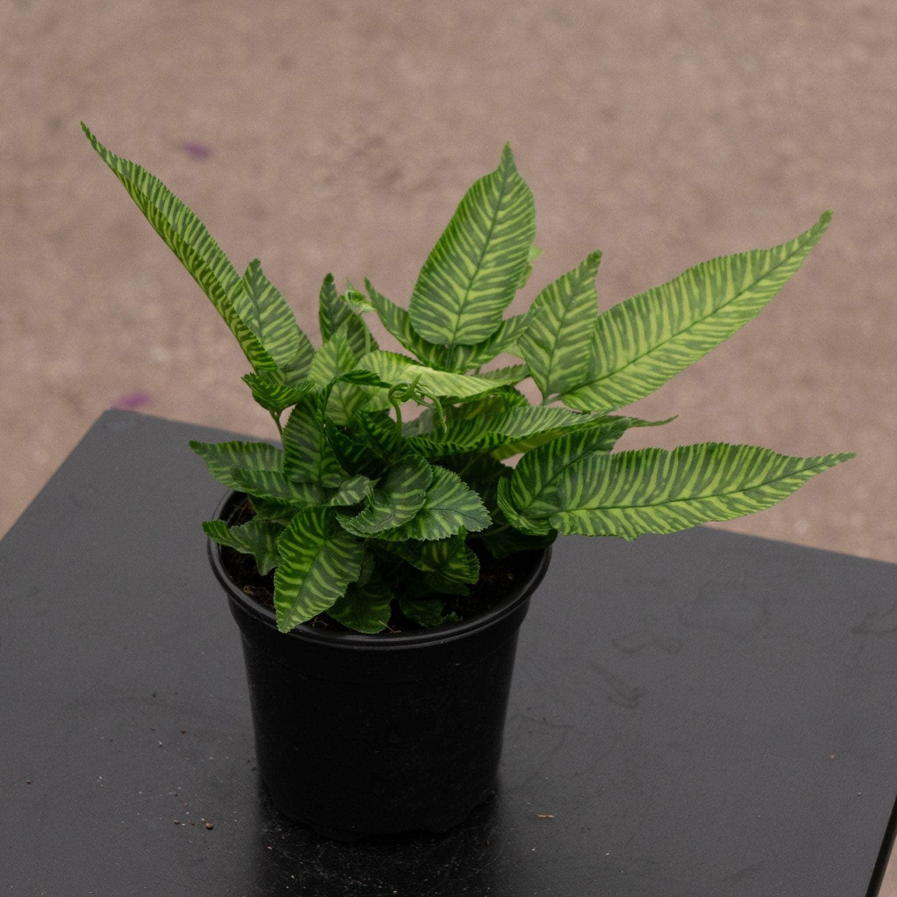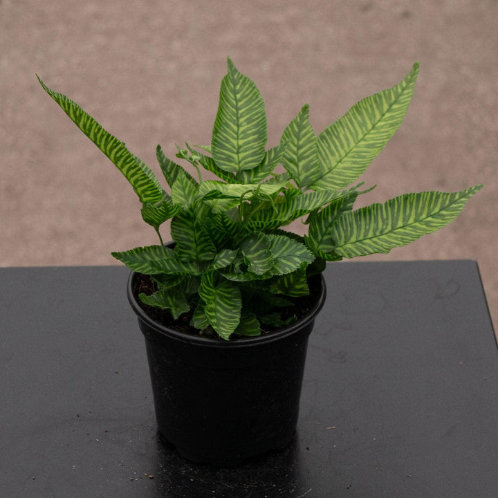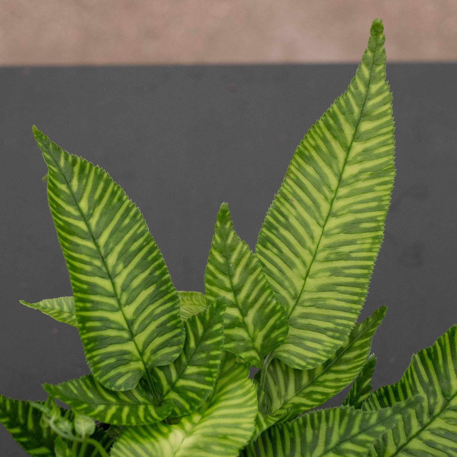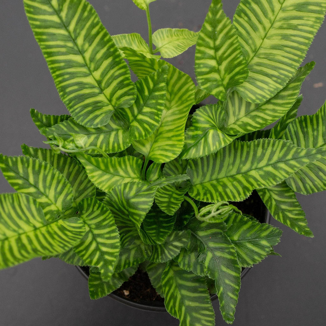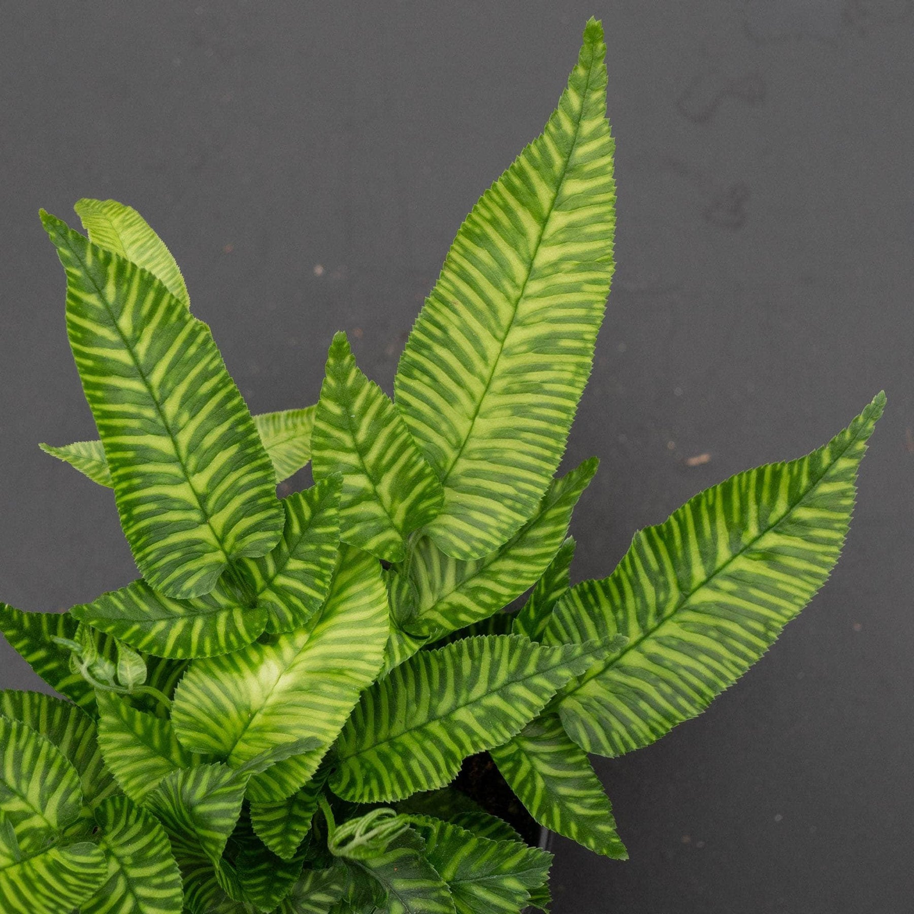 These gorgeous ferns have broad, undivided deep green pinnae interspersed with regular yellow striations with slightly arching fronds. These plants enjoy bright, indirect light. This plant does not like to dry out, so water it often but make sure the soil does not become soggy either