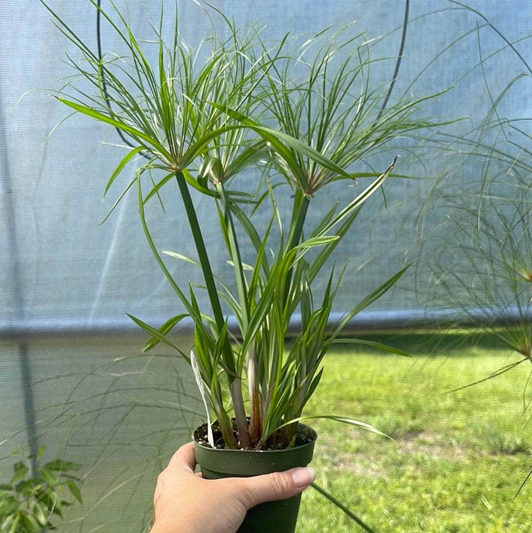 'Little Tut' is a dwarf papyrus perfectly suited for containers with smooth, triangular stalks topped with rounded umbels of grassy green foliage. Can get between 1-2' tall and wide. Looks beautiful on its own or as the thriller in an arrangement of moisture loving pants. Loves full sun and thrives with its roots in water, where it spreads quickly by rhizomes.