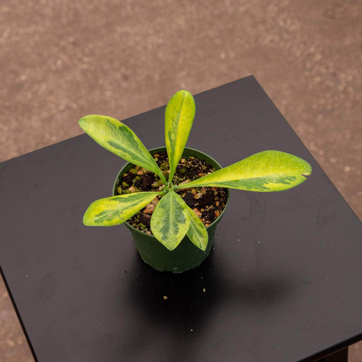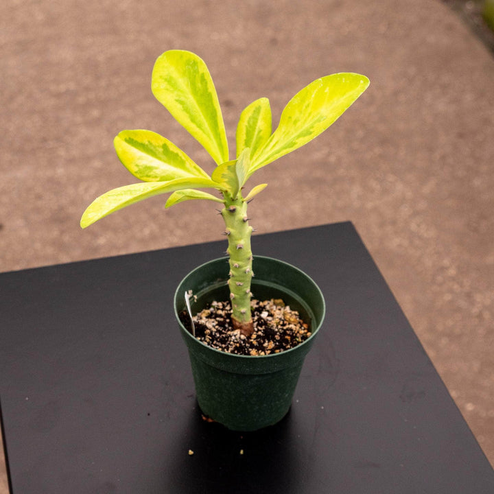 Beautiful variegated foliage crowded at the branch tips, horny triangular spine-shield at the base of petioles bearing short spines and minute stipules almost enclosing the flowering eye above. As it matures, small brownish yellow cup-like flowers give way to rounded fruit of varying sizes anywhere between a cherry to a walnut. Slow grower, can reach an average of 20' tall and even larger given enough space with a gorgeous rounded canopy. Likes regular watering during active growth season, decrease water in winter but do not allow soil to completely dry out.