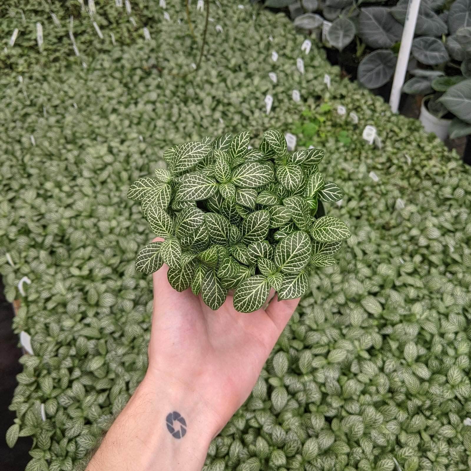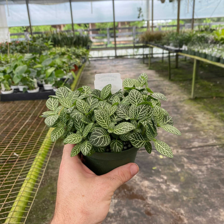 Fittonia albivenis White, is commonly referred to as Nerve Plant. Its deep, olive-green, ovate foliage can reach up to 4" long and has contrasting white veins. The upright inflorescences can reach up to 3" long are made up of densely packed bracts. Small, creamy white, tubular flowers are held between the bracts. The genus name honors the sisters Elizabeth and Sarah Mary Fitton, authors of Conservations on BotanyThe specific epithet albivenis means "with white veins", in reference to the color of the leaf veins of this species. Provide bright indirect light  or dappled part sun. Avoid direct sun. Water regularly, but moderately. Showcase its trailing habit spilling from edge of containers and hanging baskets indoors, can also be grown as a ground cover outdoors in temperate climates.