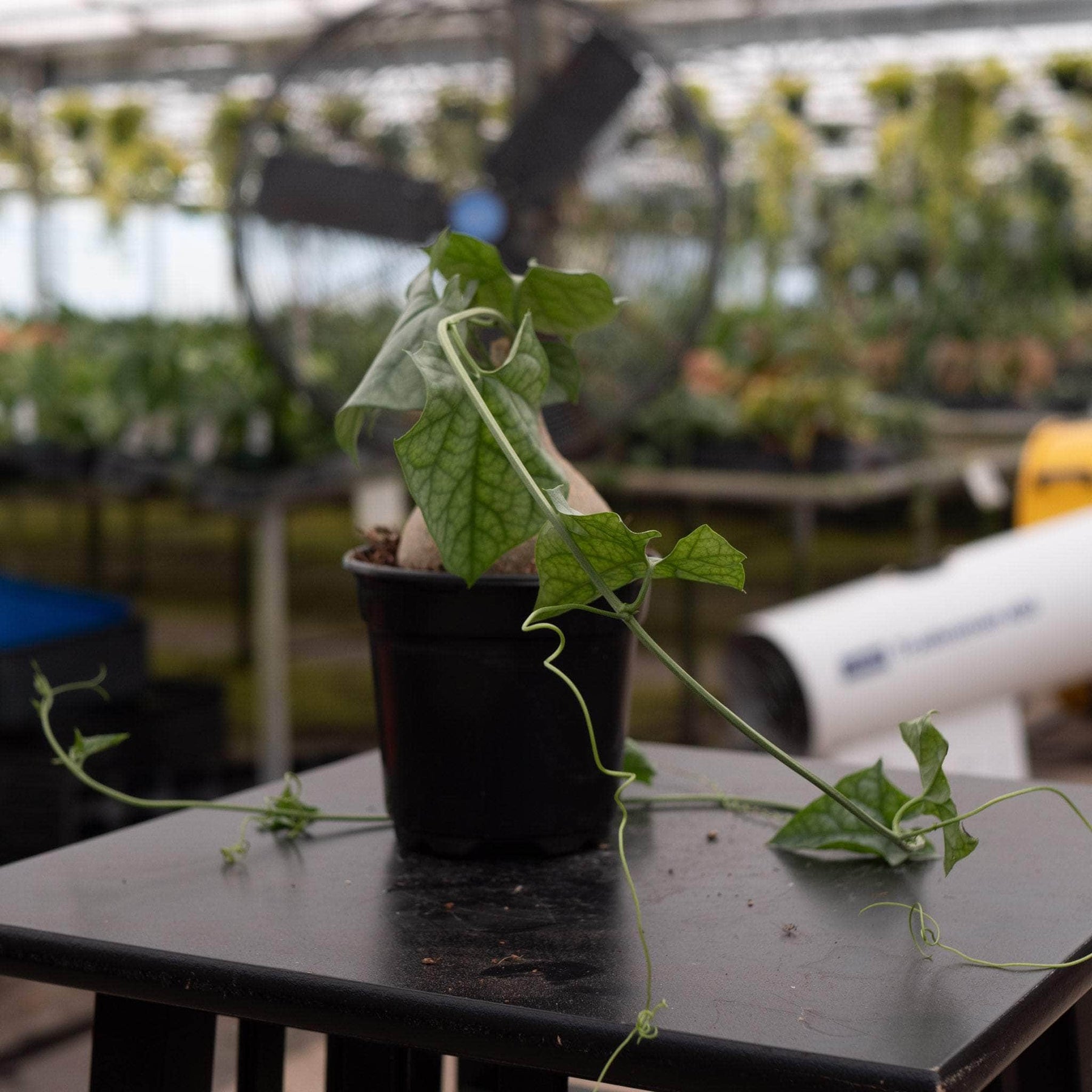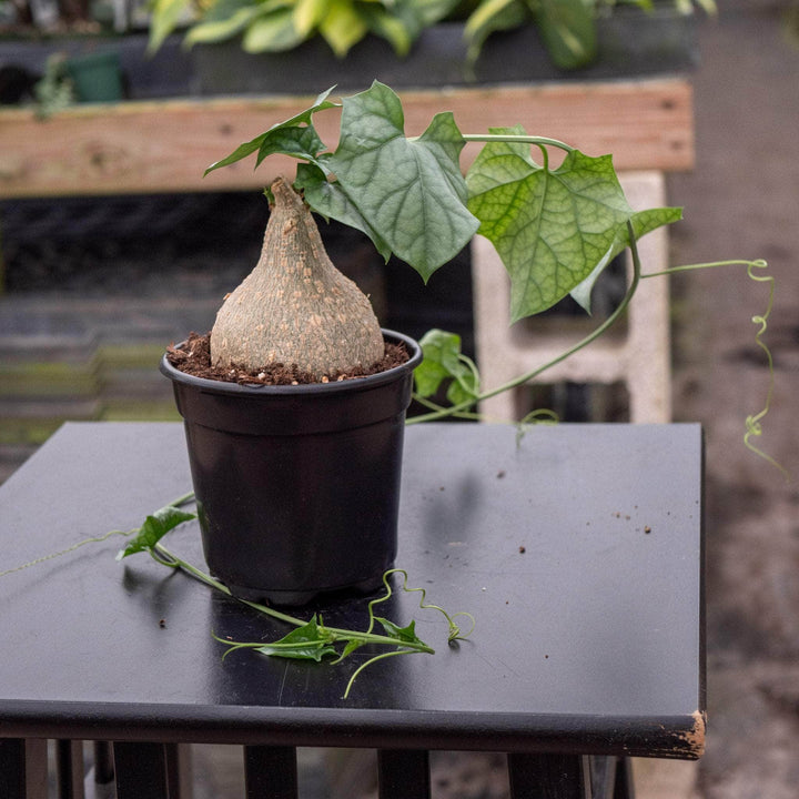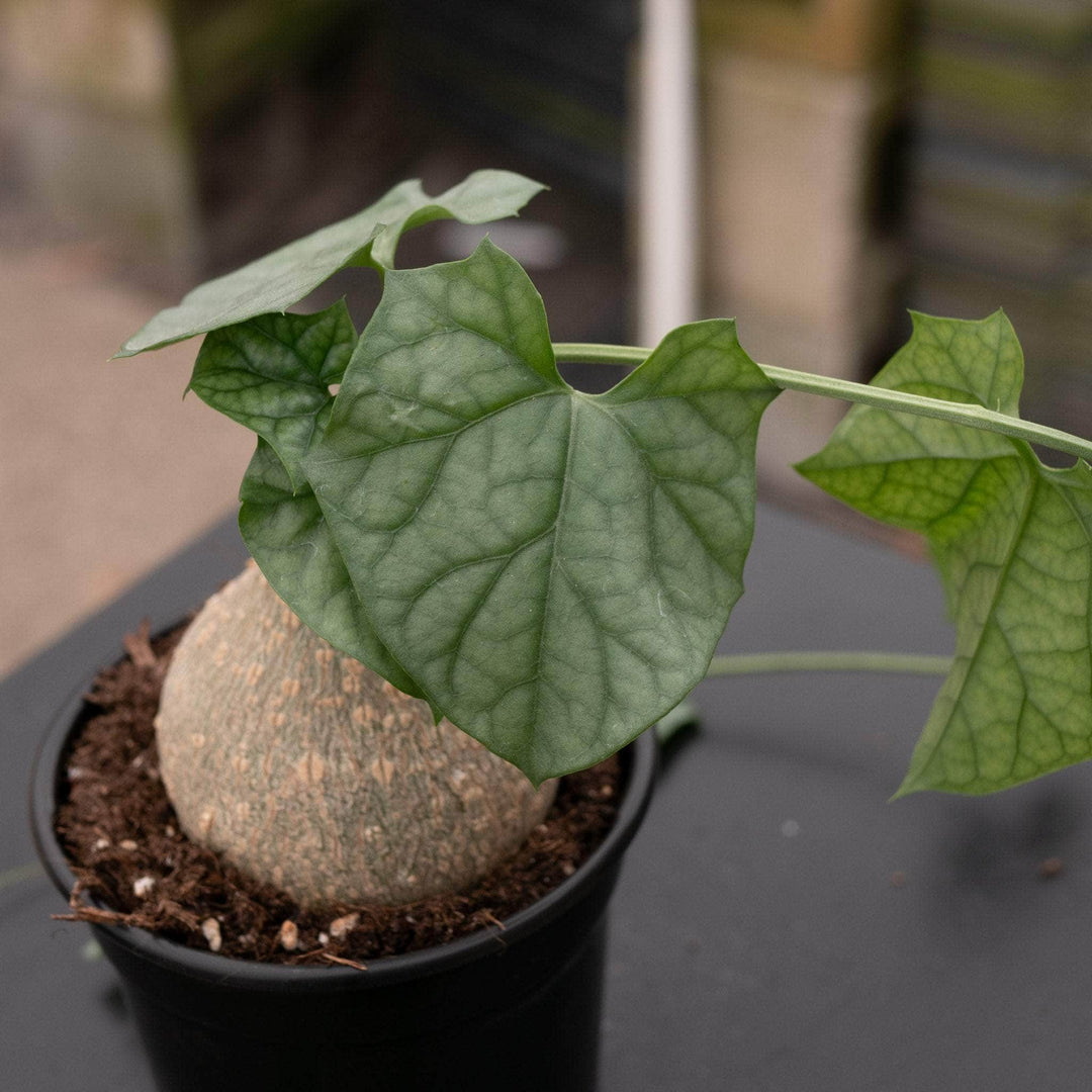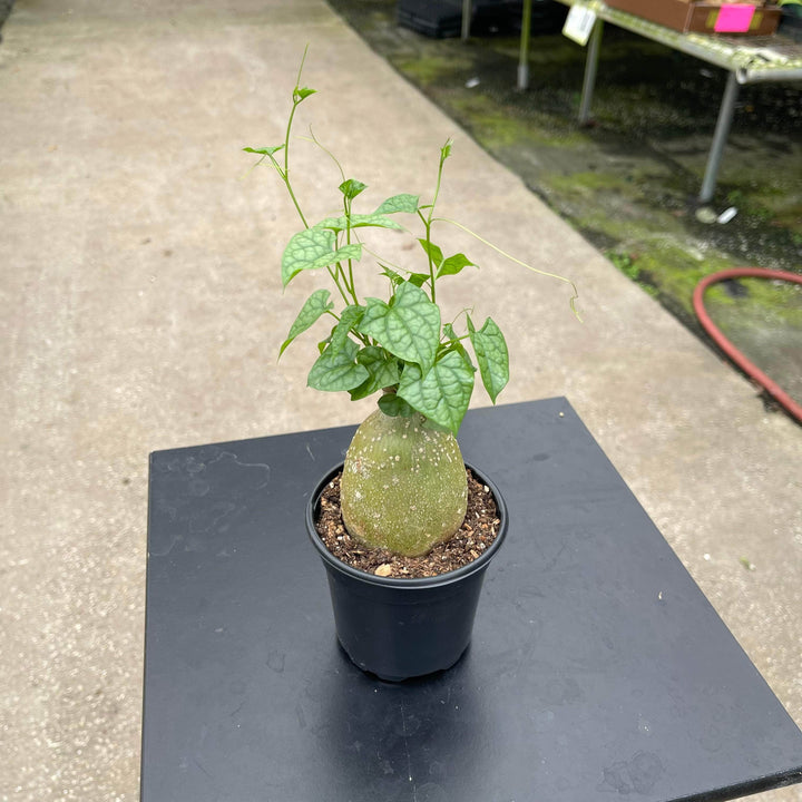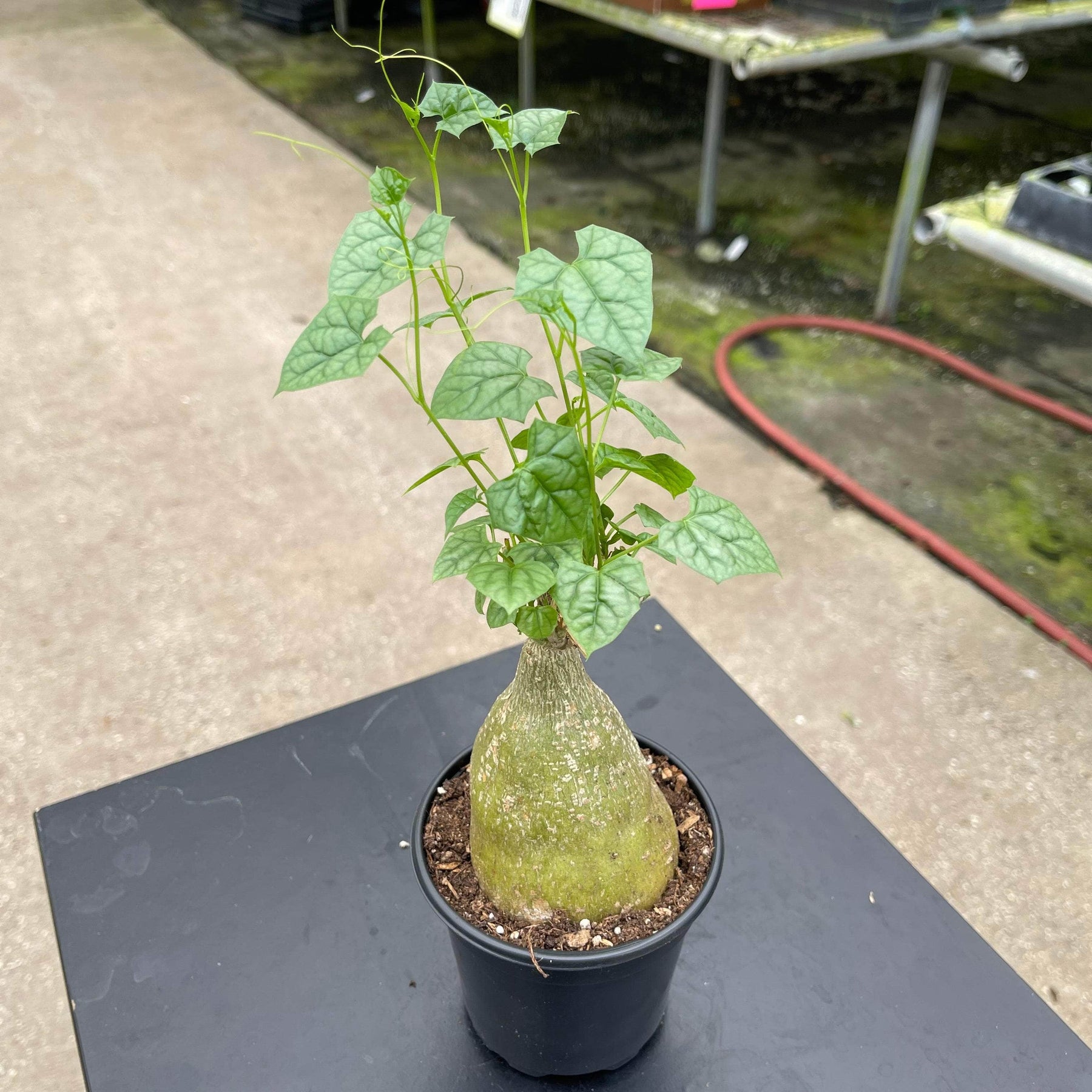 A perennial climber with woody stems that arise from the flattened tuberous rootstock. The smooth, shiny, dark green leaves are prominently veined and somewhat succulent, and can measure up to 3.2 inches long and wide at maturity. These have been grown in a shade house, can be acclimated to direct sunlight, but the caudex should stay in the shade. If grown outdoors, place 'Bigfoot' under a shelter to keep it out of the rain and bring it inside when it gets too cold. Requires excellent drainage. This is a very hardy plant once established, will survive temps from 30F to 95F, and prolonged periods of drought.