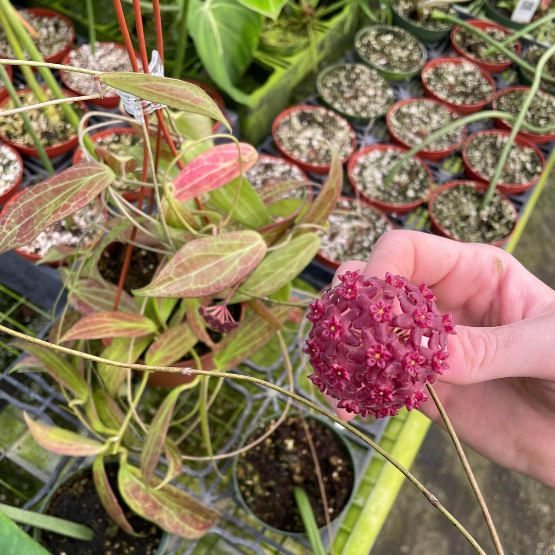 Hoya butleriana comes from Philippines, its elliptical green leaves take on a bright cherry red hue in high light, contrasting beautifully with chartreuse veins, and clusters of fragrant, burgundy star shaped blooms!