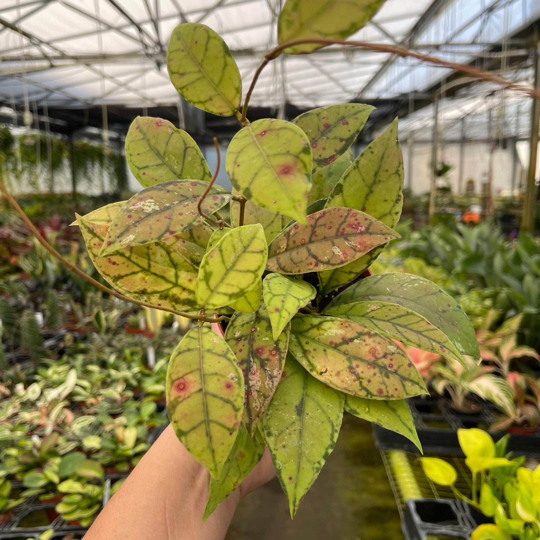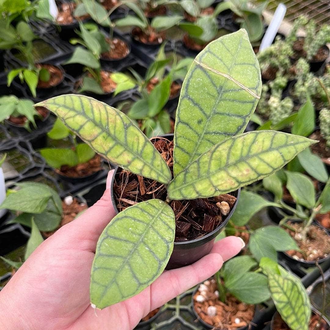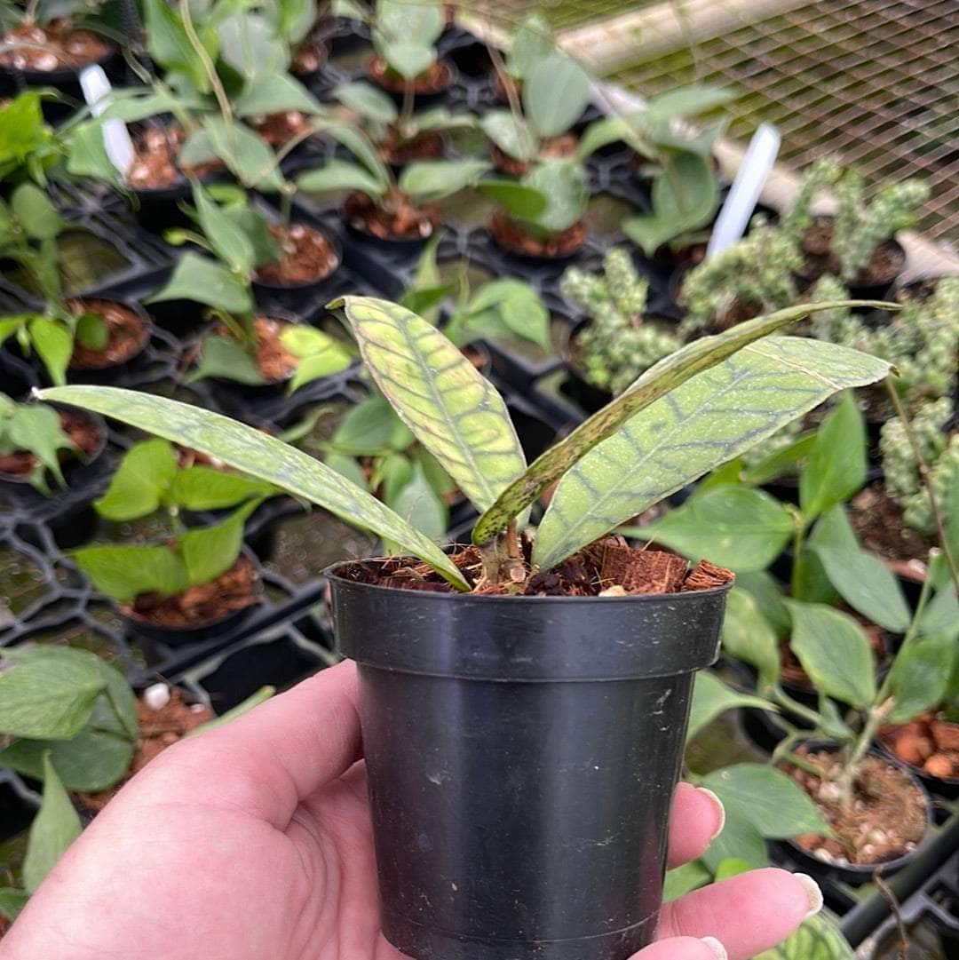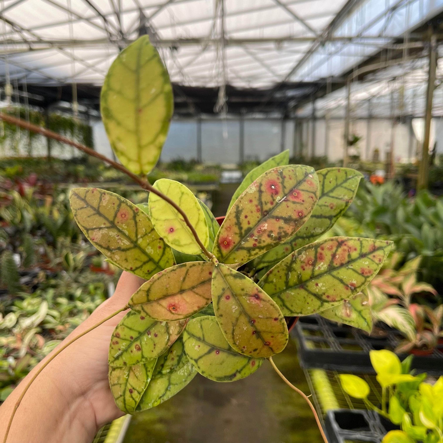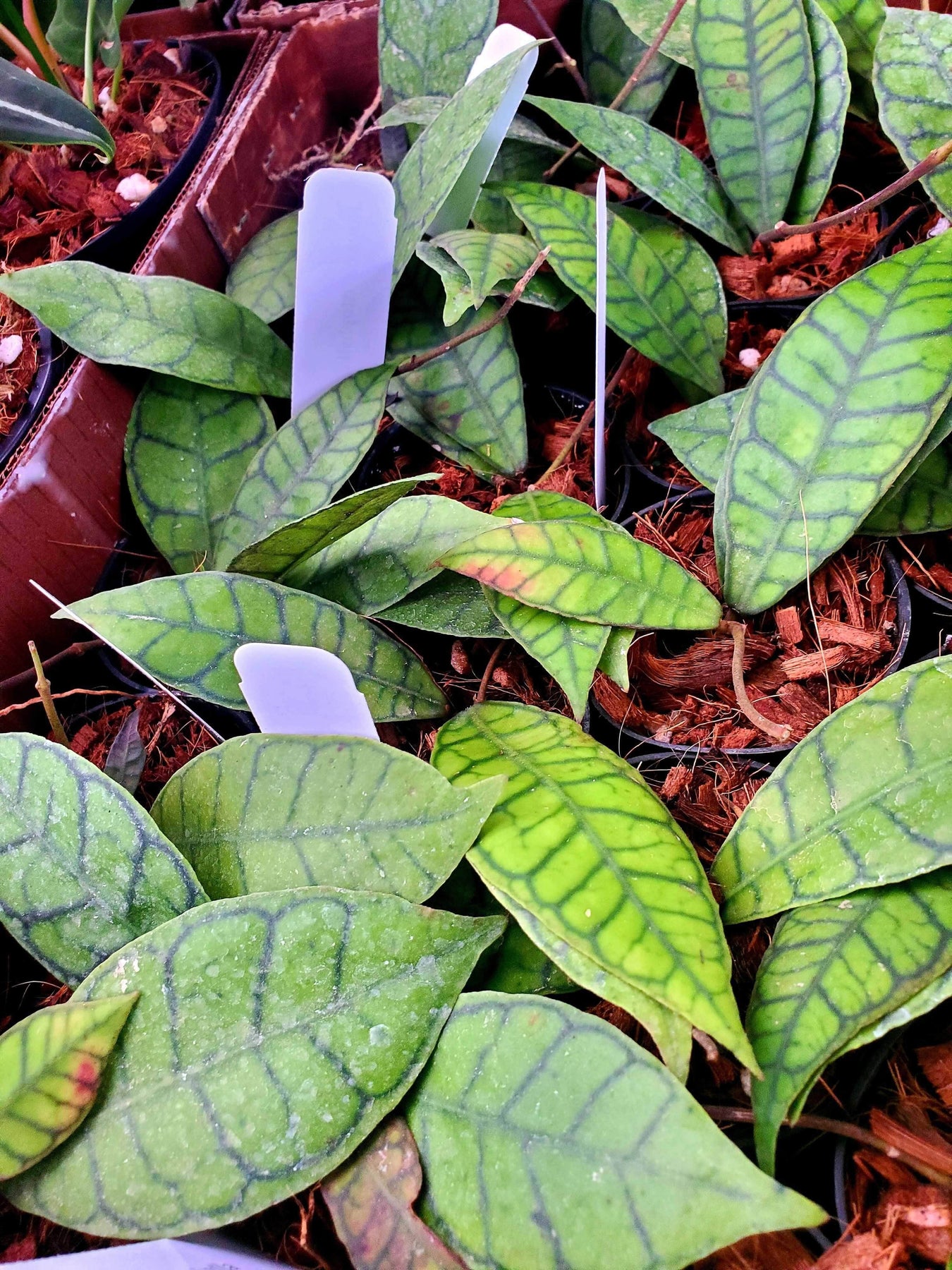Hoya callistophylla has lanceolate, thick emerald green leaves with dark green pinnate venation and an irregular, rough margin. The flowers are borne on clusters of 20-40 pale yellow to brownish gold with orange to red edges, and have a pleasant fragrance.