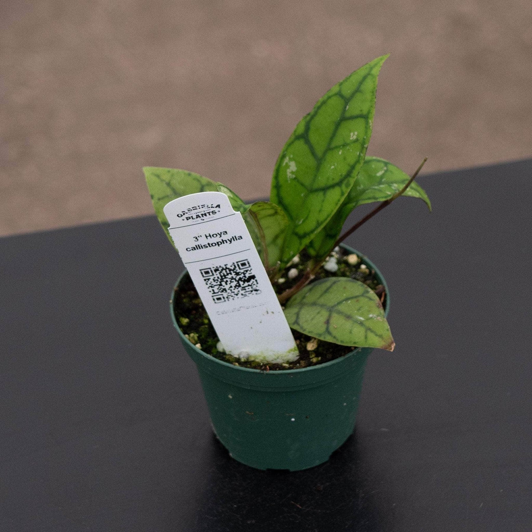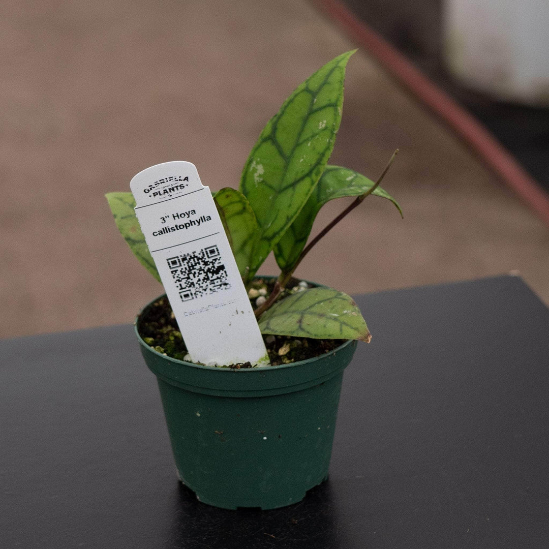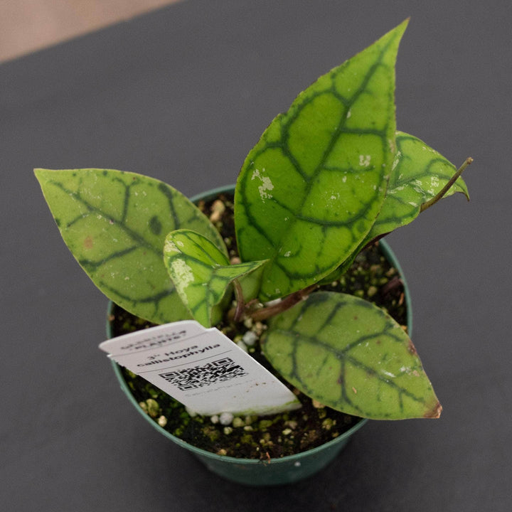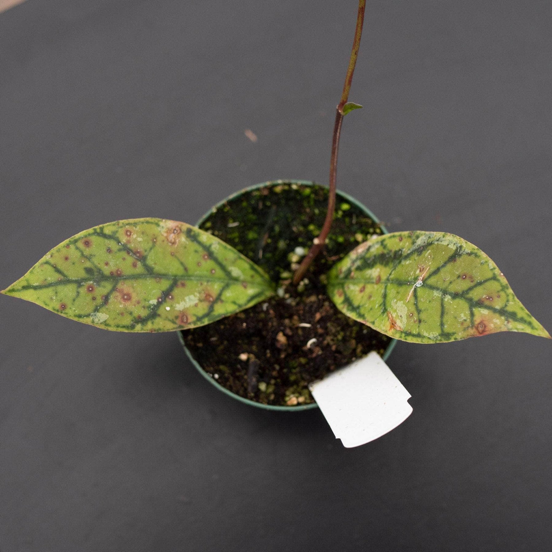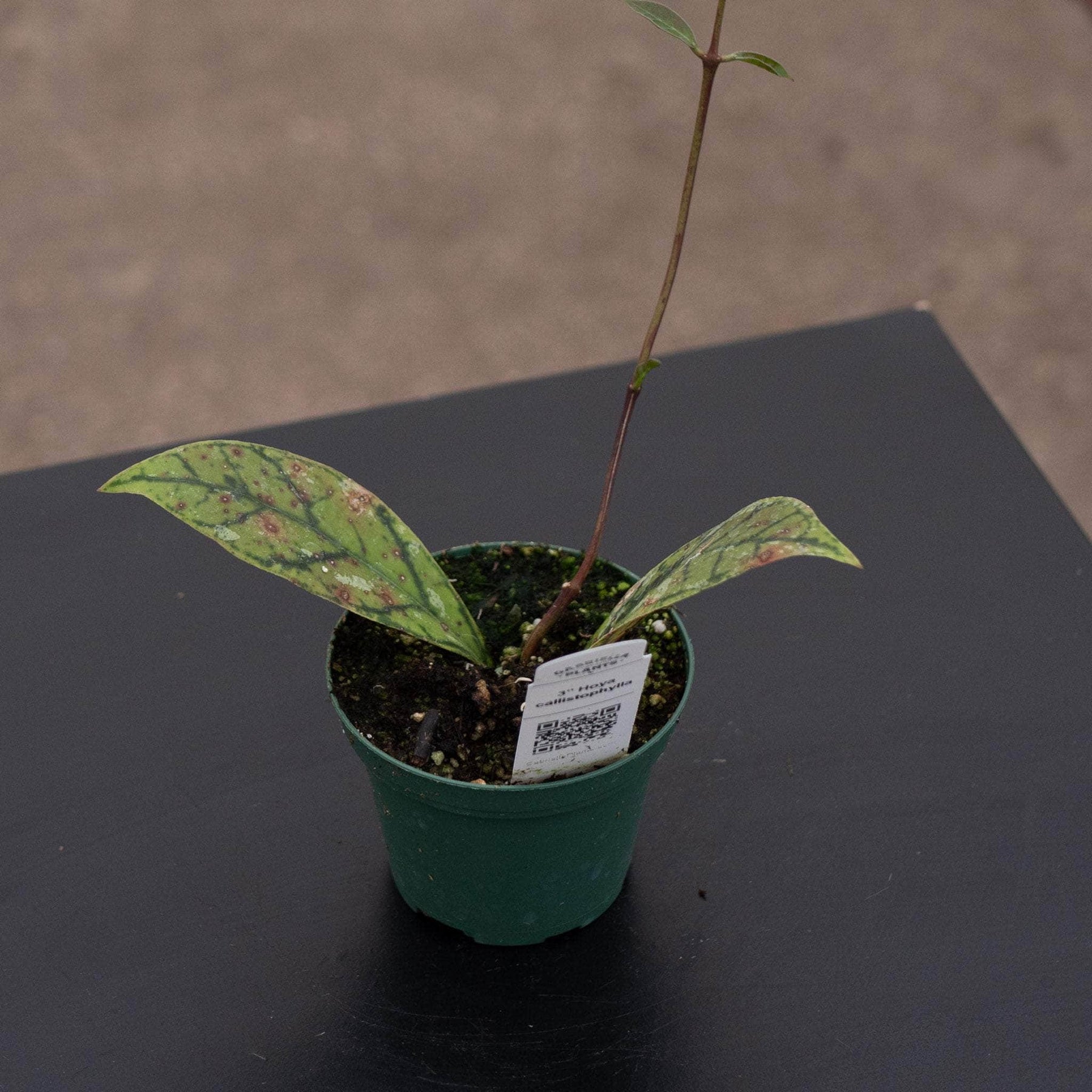 Hoya callistophylla has lanceolate, thick emerald green leaves with dark green pinnate venation and an irregular, rough margin. The flowers are borne on clusters of 20-40 pale yellow to brownish gold with orange to red edges, and have a pleasant fragrance.