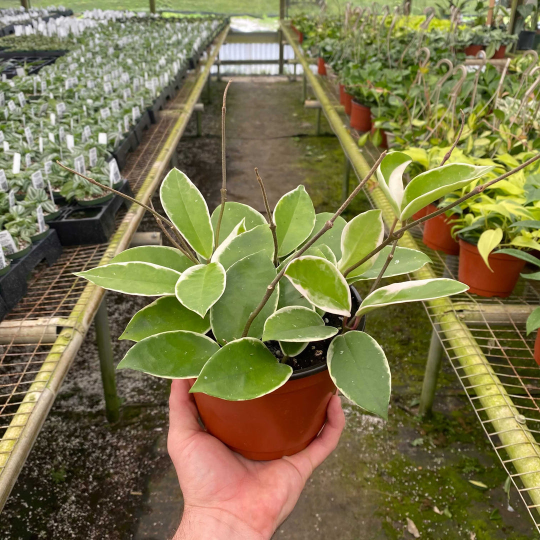 'Krimson Queen' is a stunning variation of one of the best known of all the Hoya species, the fabulous Hoya carnosa. Its thick succulent foliage has dark blue green centers edged in pink or white. New leaves are often a very bright pink and some leaves can be entirely white. Blooms in small round clusters consisting of up to 30 waxy flowers that are white to pink with red centers. Flowers are very fragrant and smell like chocolate, vanilla and honey. Hoya carnosa are tolerant of light frost, but are happiest when kept above 40F.