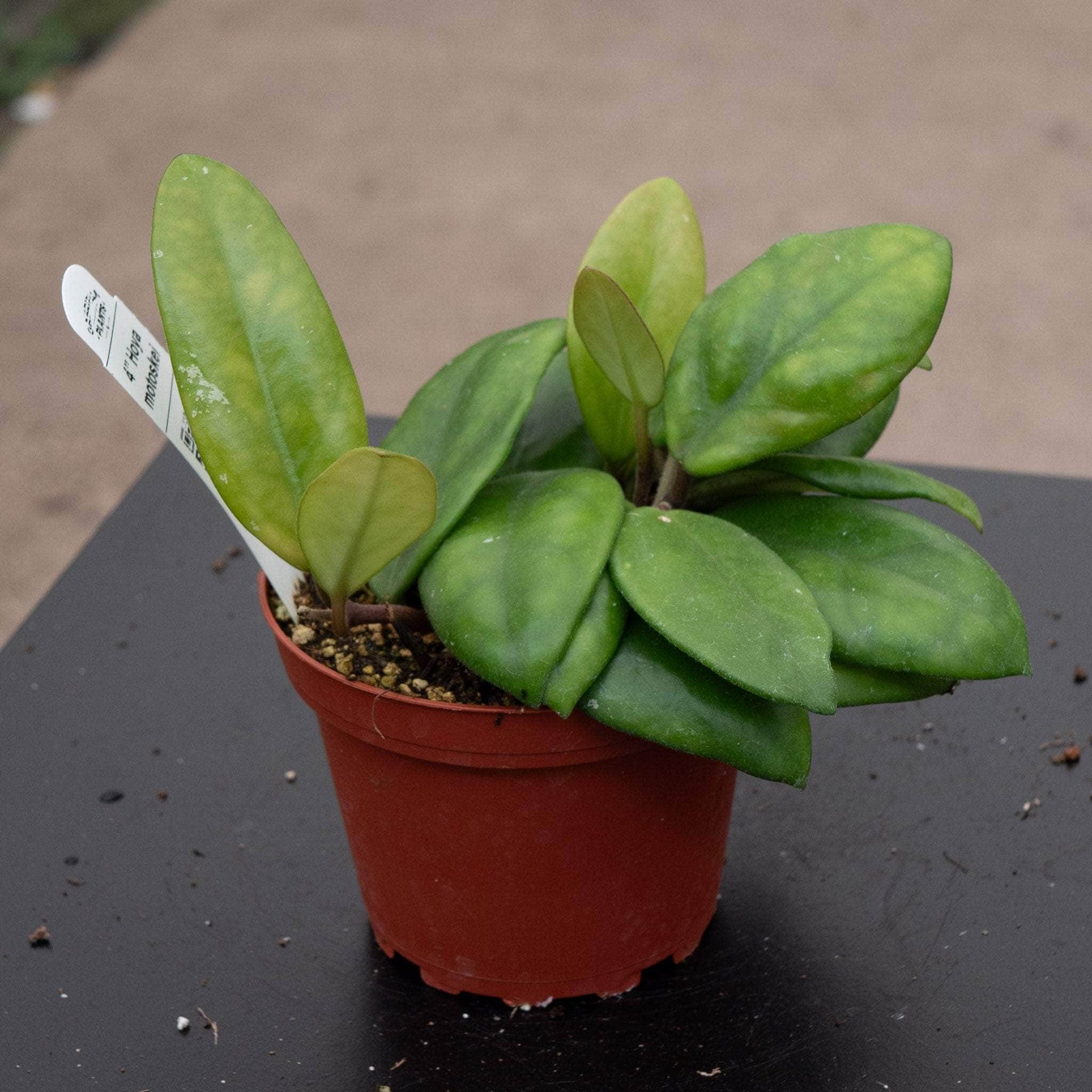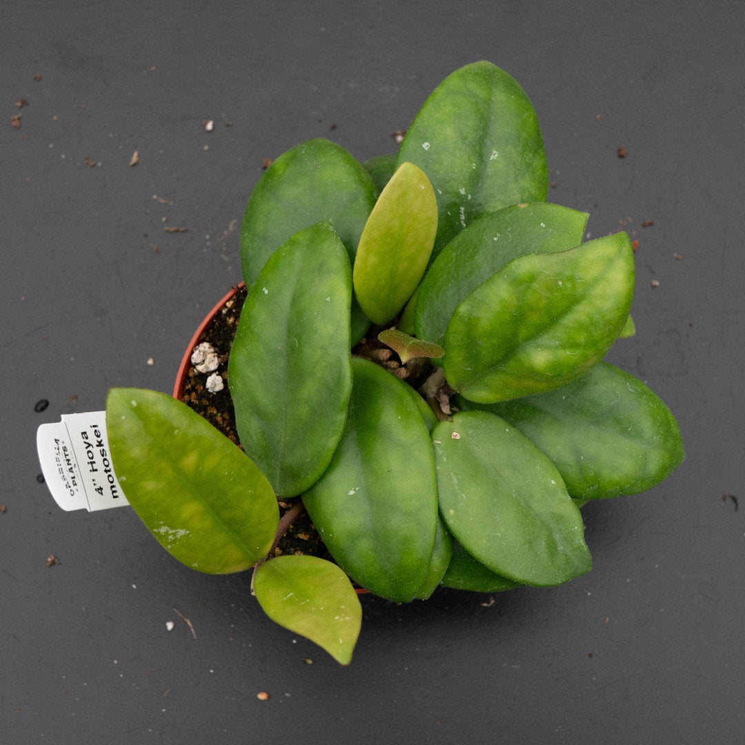 Hoya motoskei has thick, glossy green leaves, sometimes dotted with silver specks. It produces fragrant, star-shaped flowers are white to pale pink with dark pink center.