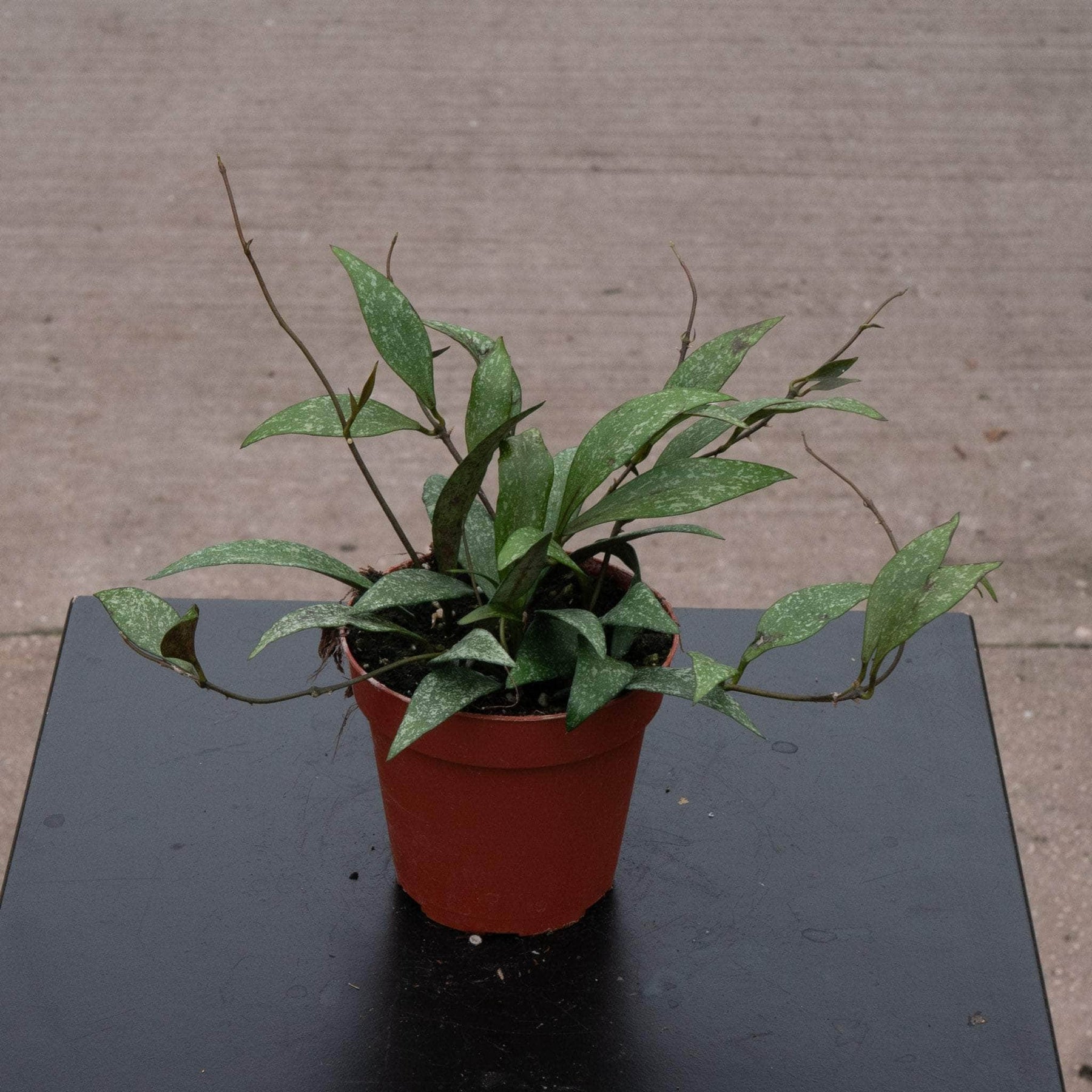 Hoyas are mostly epiphytic creeping, twining or vining plants that have a vast array of different leaf shapes, sizes, textures & colors! If provided with the desired conditions Hoyas can bloom, their flowers varying widely species-to-species with many different colors, sizes & even scents! Many Hoya develop purple spots, streaks or patches on the leaves as a response to light exposure. This is commonly referred to as sun stress, it is completely natural and normal - sometimes the entire leaf can turn various shades of purple/red. This is not disease and is actually a sign that the plant is healthy. Hoya sun stress is generally reversible, the pink, red, or purple swaths/freckles/spots on leaves from bright light is different from sunburn, which causes permanent crispy, white/brown patches. With less light, sun stressed leaves often revert to green, but damaged, burnt spots will not heal - however, the plant can grow new, healthy foliage if conditions are improved gradually.
