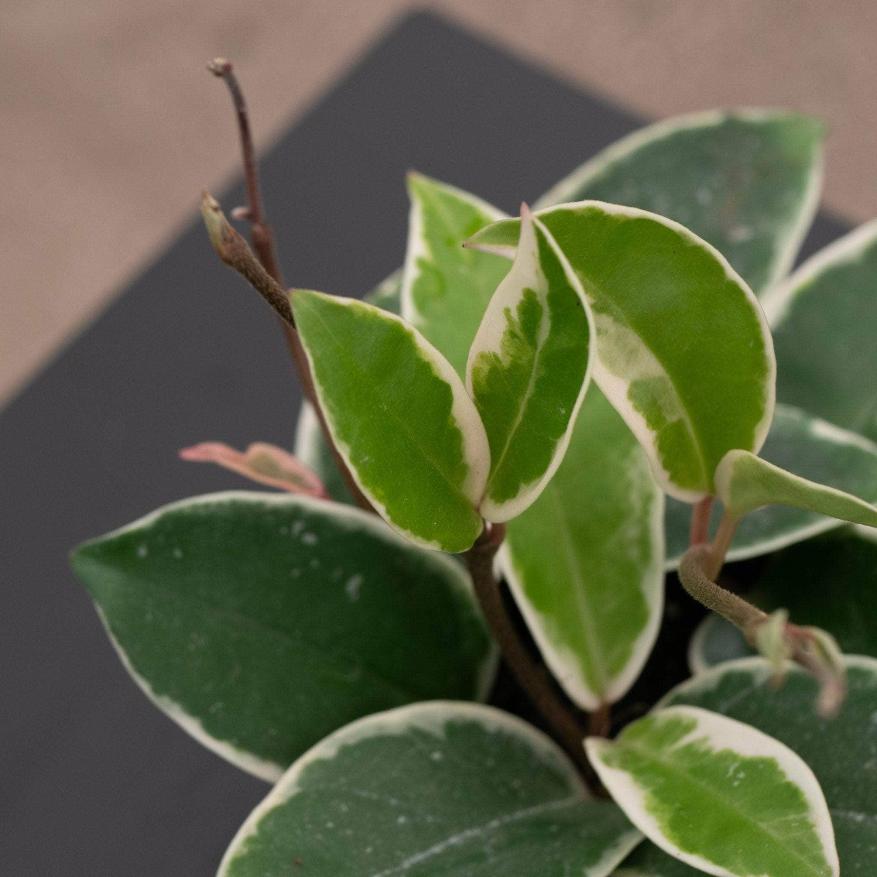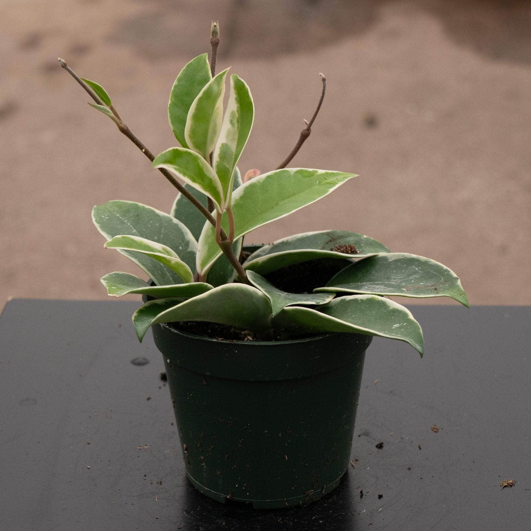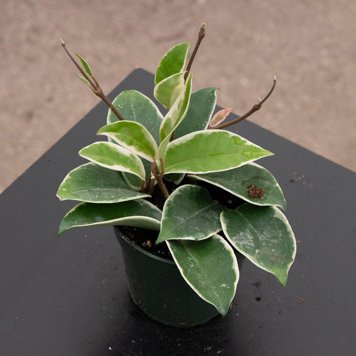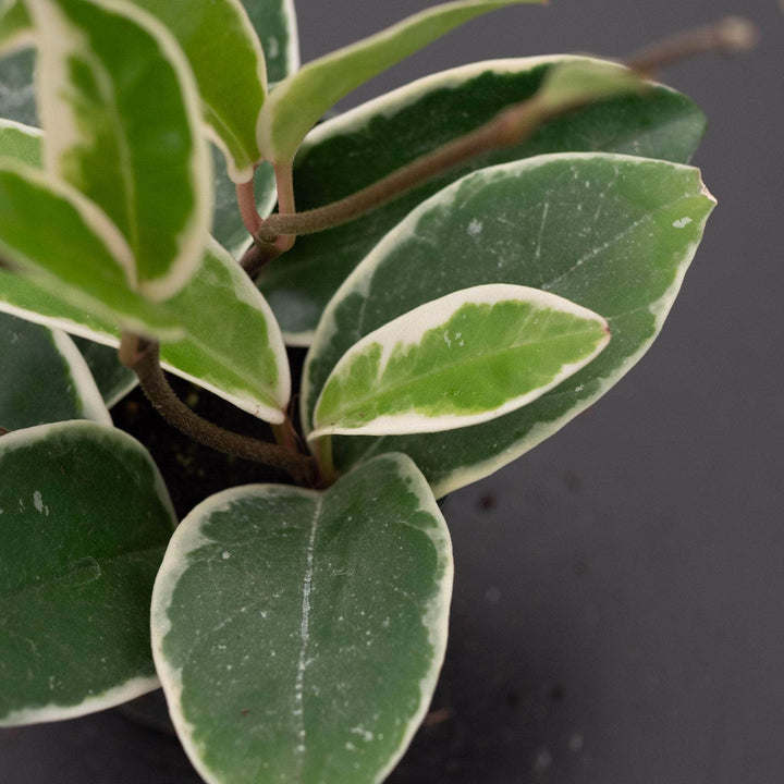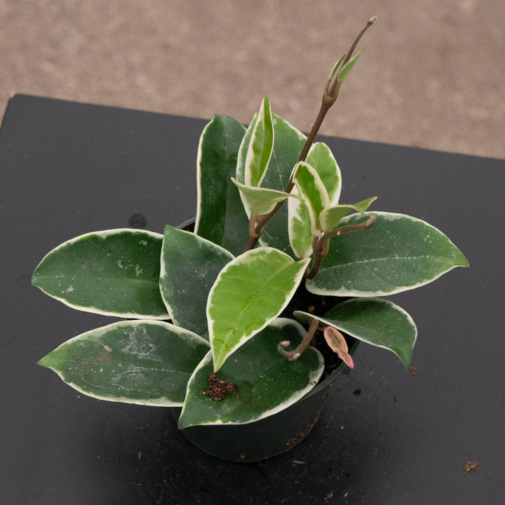 These beautiful Hoyas are a variegated sport of the Hoya carnosa family with bold white on the edges of the leaves and the flowers that come with this family are incredibly sweet in fragrance. Its thick succulent foliage has dark blue green centers edged in pink or white. New leaves are often a very bright pink and some leaves can be entirely white. Blooms in small round clusters consisting of up to 30 waxy flowers that are white to pink with redcenters. Flowers are very fragrant and smell like chocolate, vanillaand honey. Hoya carnosa are tolerant of light frost, but are happiest when kept above 40F.