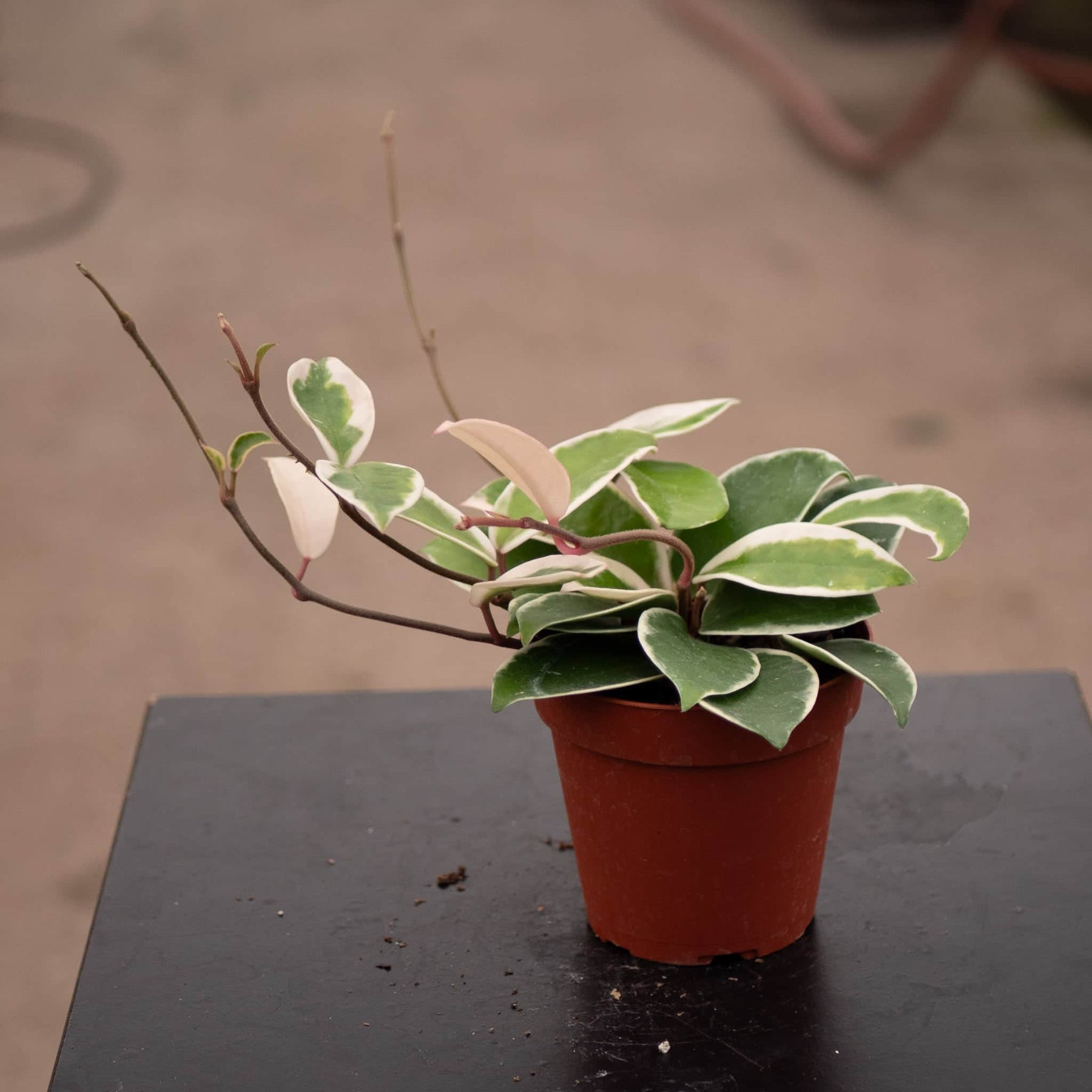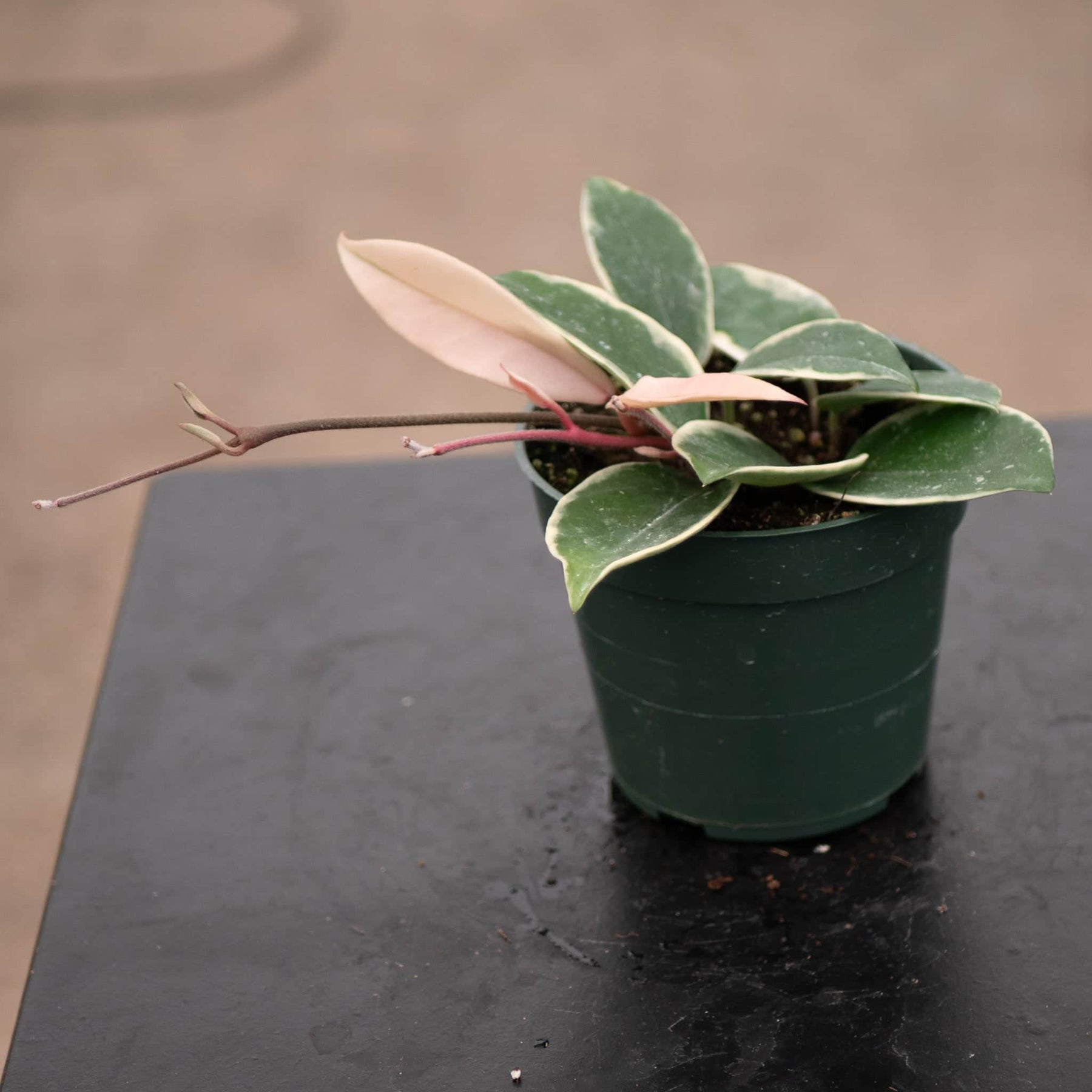These beautiful Hoyas are a variegated sport of the Hoya carnosa family with bold white on the edges of the leaves and the flowers that come with this family are incredibly sweet in fragrance. Its thick succulent foliage has dark blue green centers edged in pink or white. New leaves are often a very bright pink and some leaves can be entirely white. Blooms in small round clusters consisting of up to 30 waxy flowers that are white to pink with redcenters. Flowers are very fragrant and smell like chocolate, vanillaand honey. Hoya carnosa are tolerant of light frost, but are happiest when kept above 40F.