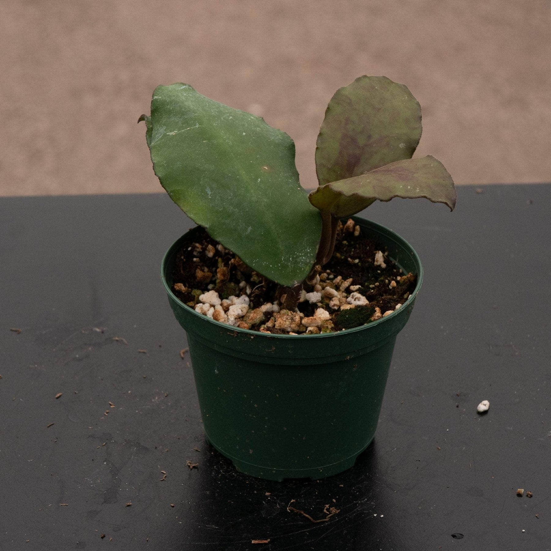 We are thrilled to introduce the latest Hoya in our collection! Our Hoya waymaniae did not come to us with an accession number nor a descriptive name indicating unique characteristics but this clone develops thick, succulent, round to oval, dark green leaves with a wavy margin. Foliage blushes in gorgeous shades of red in response to bright light while the veins remain green creating a beautiful contrast, has wavy margins too!  This has not bloomed for us yet, however all Hoya waymaniae flowers share similar characteristics - clusters of small orange or yellow flowers with red or purple centers, there might be slight variations in the exact shades or intensity of these colors amongst different clones. Some clones have been described as having slightly darker orange blooms than others, but this may also be affected by differences in their cultivation.