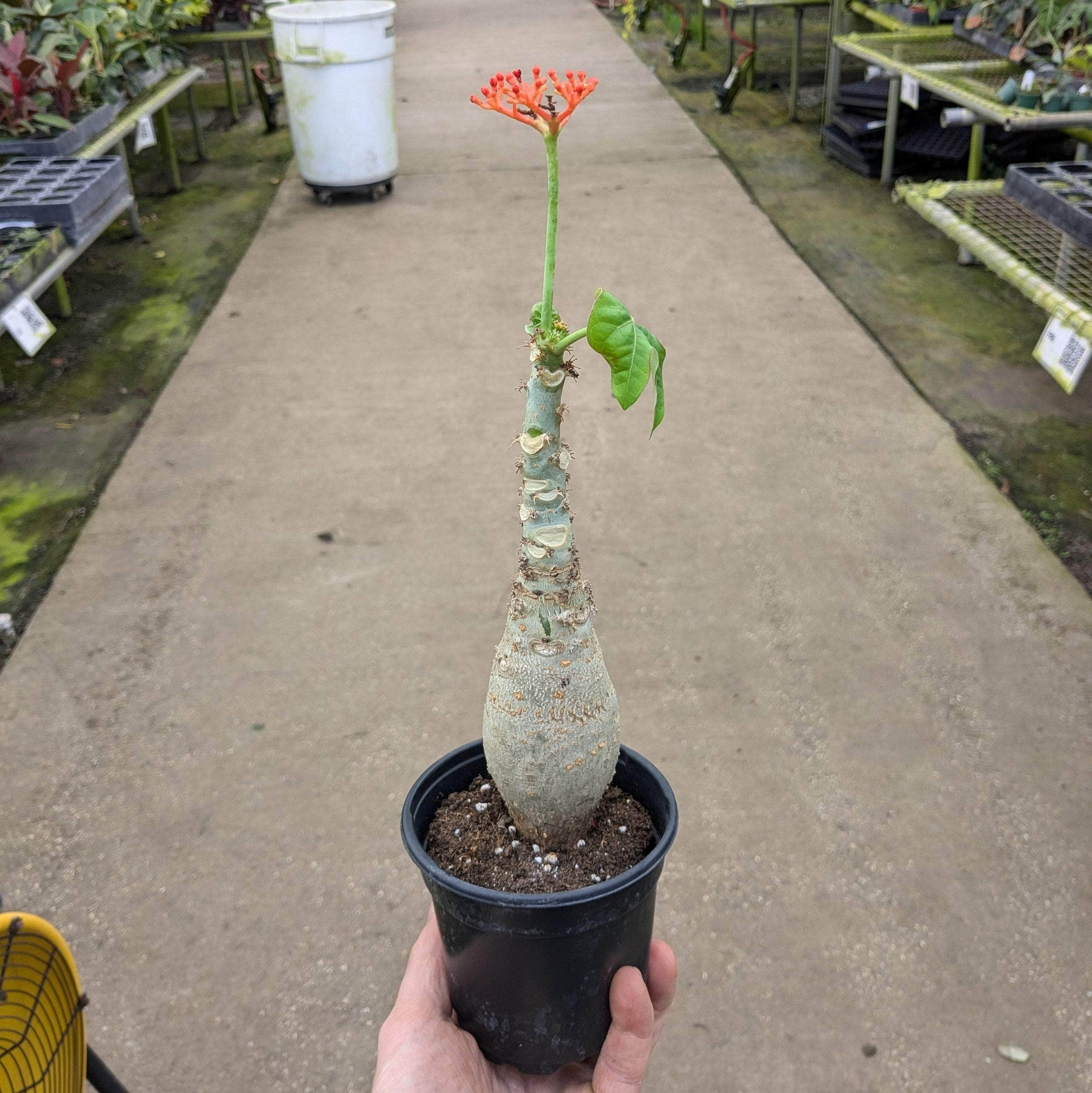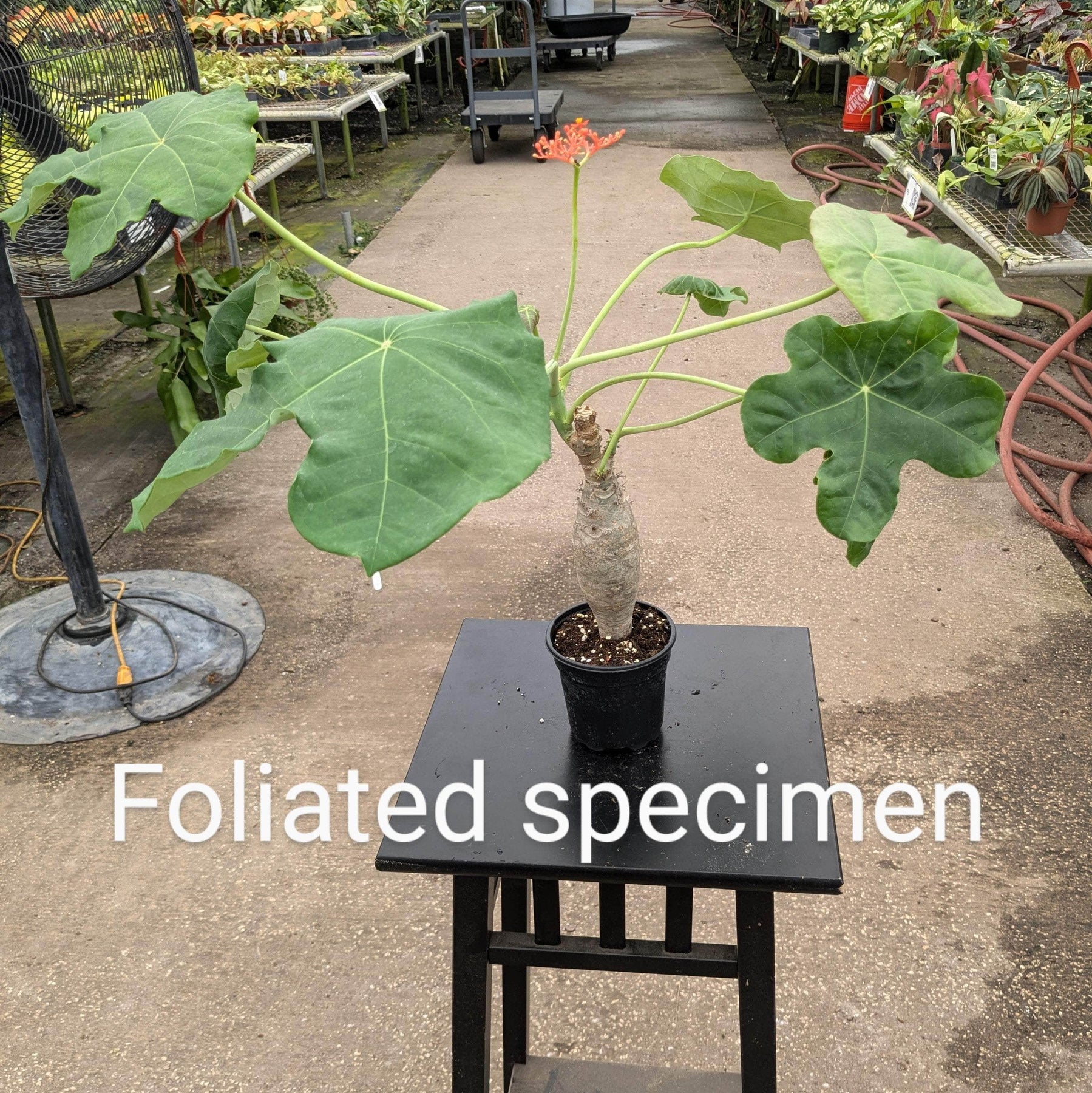 Jatropha podagrica 'Buddha Belly' forms a bottle shaped caudex that can reach an average of 1' wide. Its large, leathery, dark green leaves with prominent white veins begin to drop in the Fall and starts to grow again in Spring. Bright red flowers attract pollinators. Due to their size, these plants have been pruned back in order to ship, Currently not in flower.