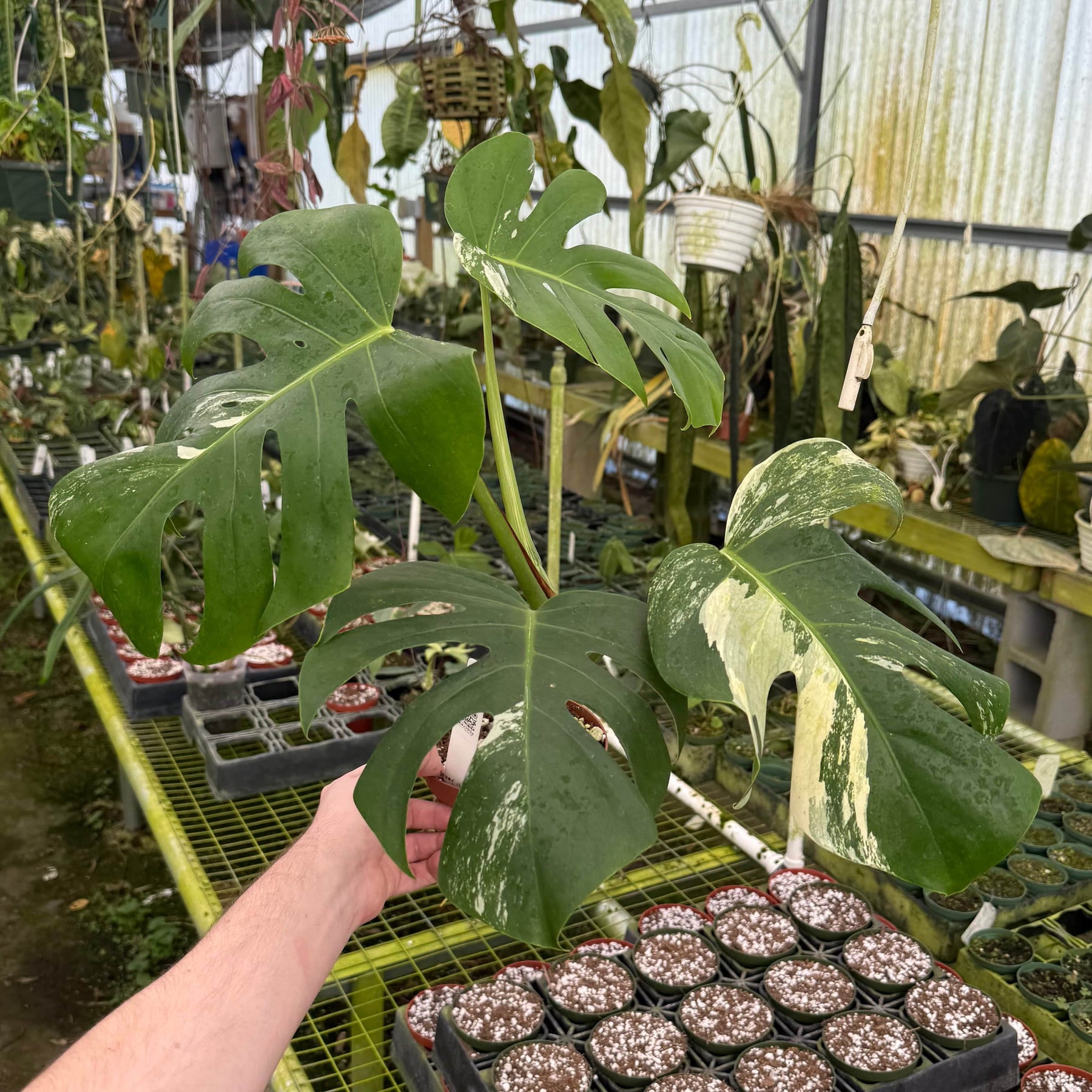 These Monstera Albos were the first collector plant Shane (our owner) ever purchased to start his rare plant collection, which was purchased as a single node cutting in 2019. After what he feared was a slow death of the cutting over the following winter, it eventually blossomed and was even featured in a 24 hour live stream event on Twitch in 2020 when it was developing a variegated inflorescence. Shane began chopping a few select offspring in late 2021 and began slowly building up a few parent plants and now has just a handful he's ready to share.