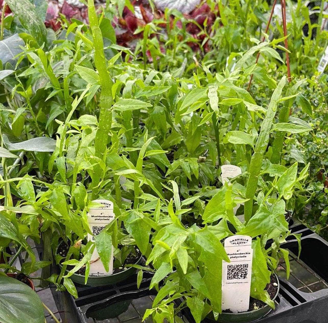 This bizarre-looking plant [which used to be called Homalocladium platycladum] hails from New Guinea & the Solomon Islands & is known as "Tapeworm Plant" or "Ribbonbush" due to the completely flattened, 2-D shape of it's phylloclades {=Modified stems that act as leaves!} As this plant grows it will keep surprising you as it sporadically grows new flattened stems in a sprawling habit from all sides of the plant. It may also sprout leaves from time-to-time but these leaves are meant to be deciduous and will fall off eventually-- this is normal for this plant! If kept happy, Muehlenbeckia will form short-lived, TINY flowers on each of the joints of it's flattened stem. This is a must-have for any true plant collector!