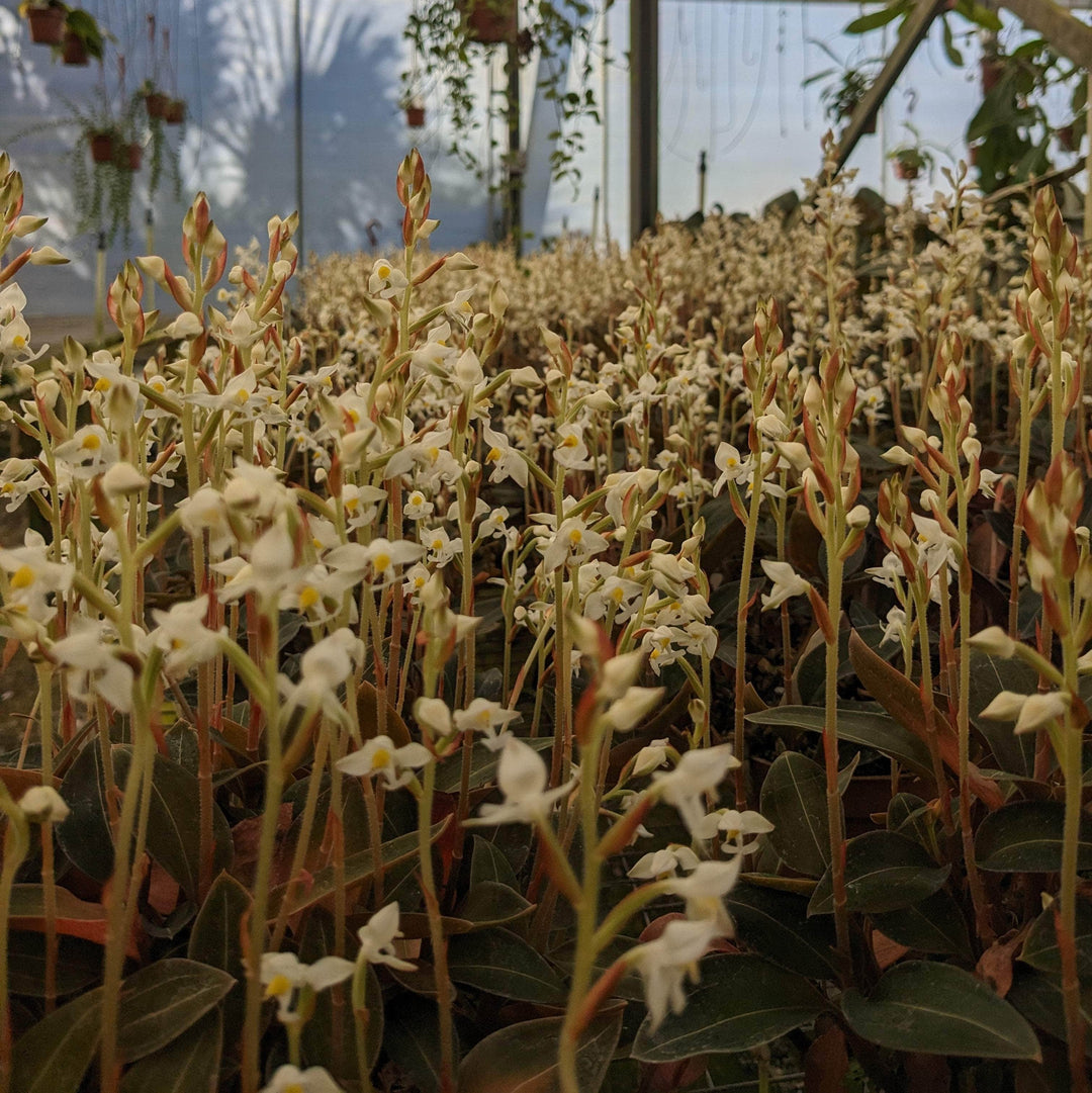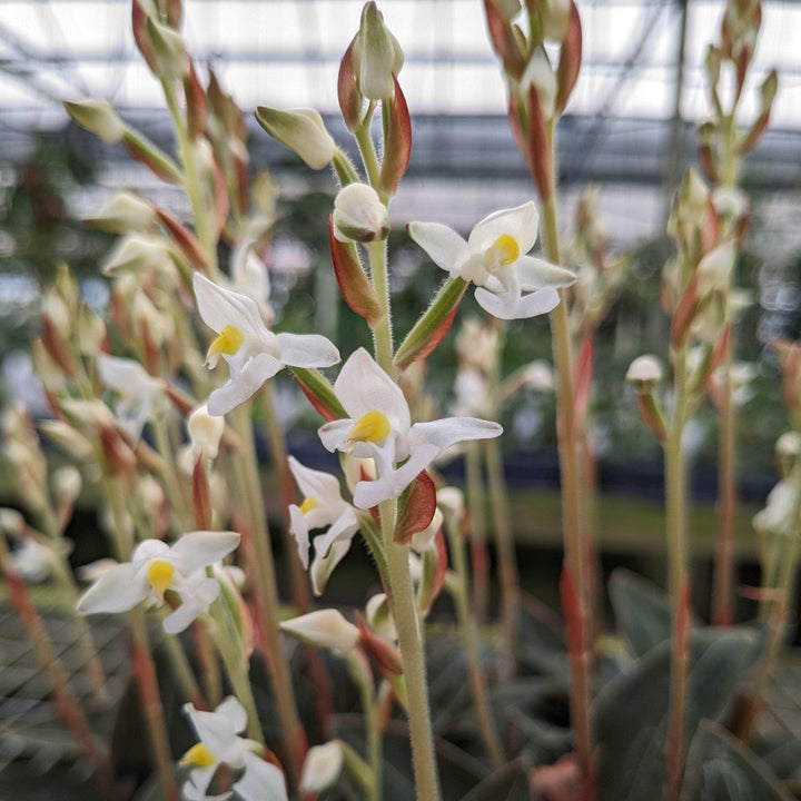 Bright, indirect light is ideal, avoid direct sun, which will scorch the leaves. Water thoroughly when the top inch of soil is dry, avoid overwatering which can lead to root rot.  Feed your jewel orchid a diluted balanced orchid fertilizer every 2 weeks during the growing season, be careful not to over fertilize which will damage roots. Pinch tips to encourage a bushier growth habit. Jewel orchids need high humidity, they are perfect for terrariums!