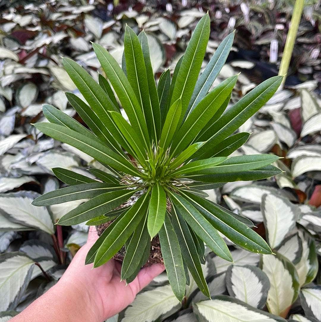 Easy to care for indoors, best growth when exposed to at least 2-3 hours of either morning or evening sun a day. Can tolerate full sun, but must be gradually acclimated to avoid scorching the leaves. Allow to dry between watering, as it is prone to root rot. overwatering and insufficient light are the most common problems in cultivation. Fertilize every 2 months during spring and summer, then every 3 months during autumn and winter with a fertilizer formulated for cactus. Madagascar Palms are better potbound for several years. Repot every 3-4 years if absolutely necessary in a well draining mix labeled for cactus and succulents. Only repot in the next sized pot, as too much extra soil holds a lot of moisture and increases the risk of root rot. While it is not as toxic as other plants in the Apocynaceae family, being punctured by the spines can cause pain, swelling and numbness. We recommend wearing gloves and wrapping the trunk in several layers of newspaper when repotting to avoid injury or any potential allergic reaction some people may have to the sap.