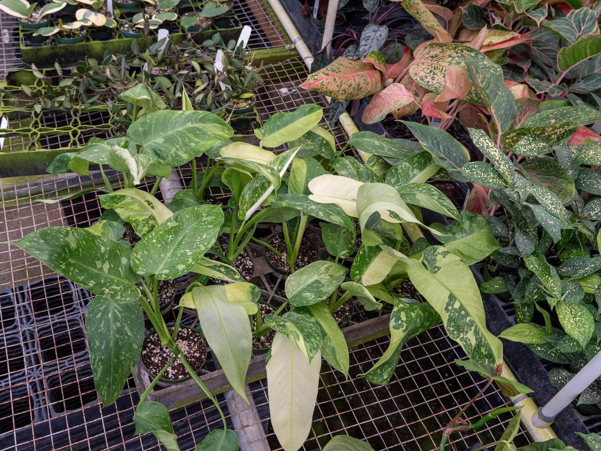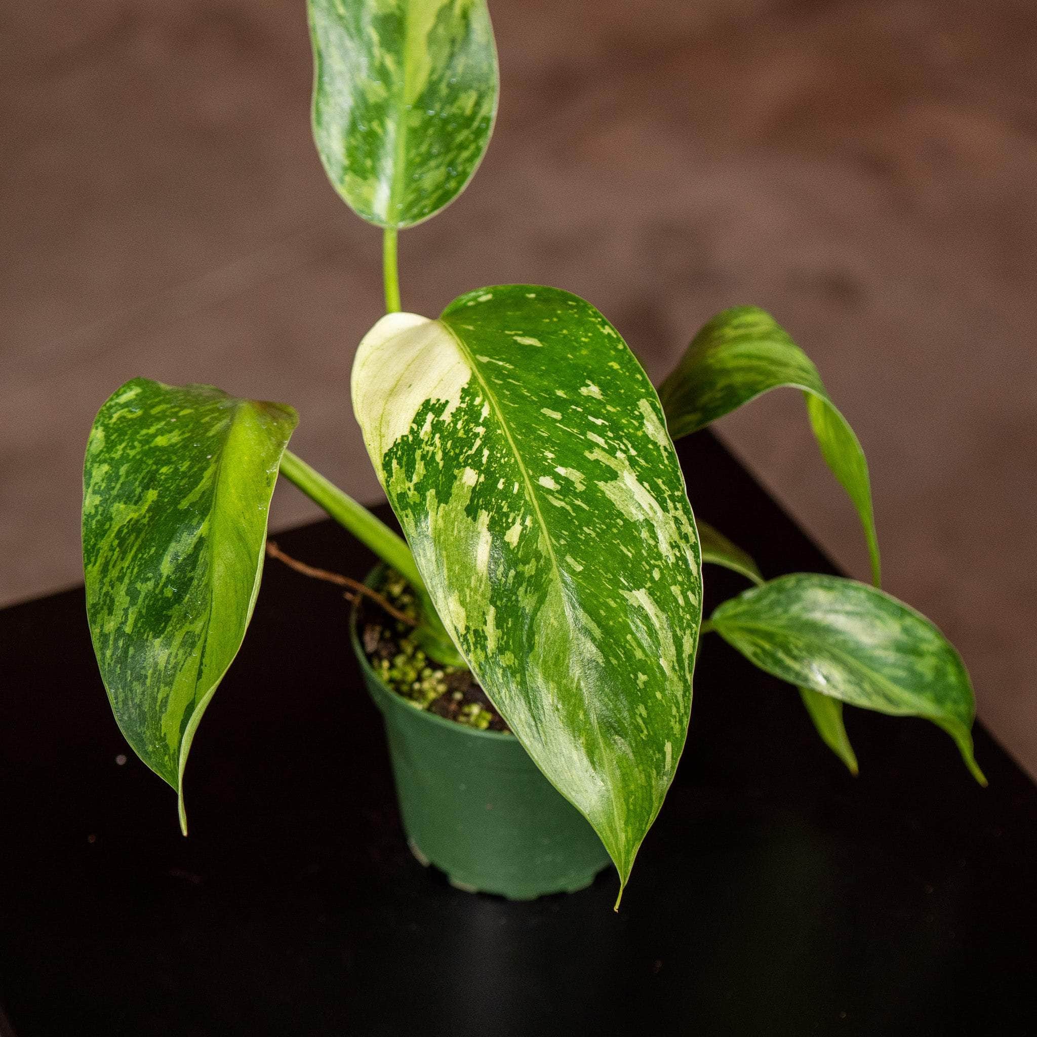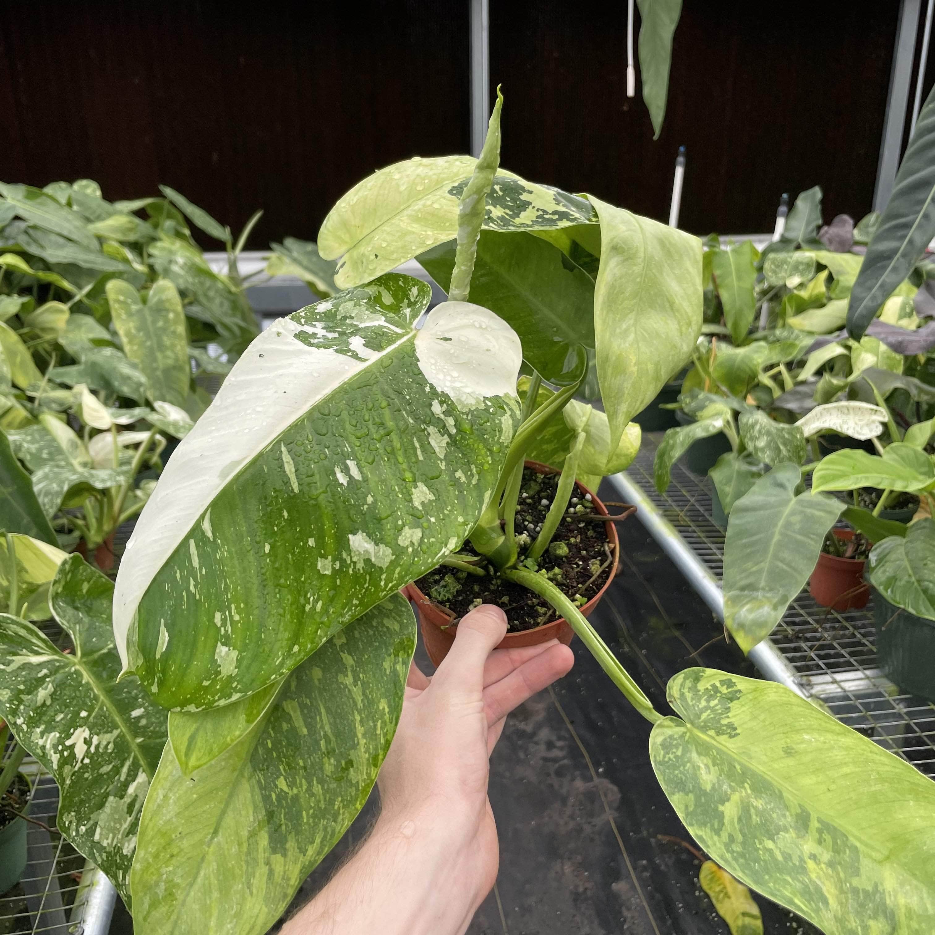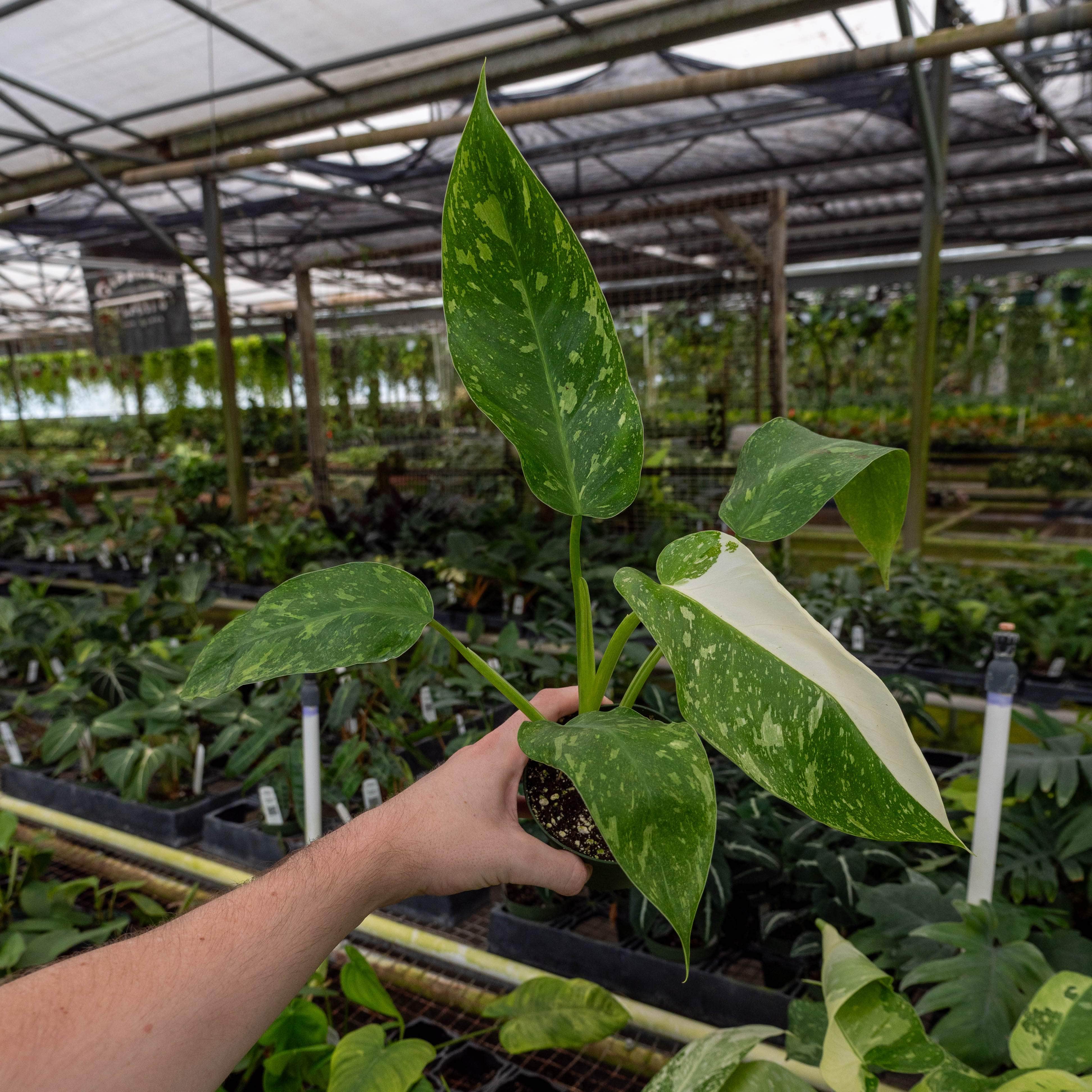 A rare variegated form of this large leaf species, with bold splashy white variegation in patches and spots across the leaf. It is a climbing species, the leaves grow to 24" long and about 5" across. Best in bright shade. Popular as a house plant, they tolerate low light and dry air. GROWN FROM CUTTINGS!