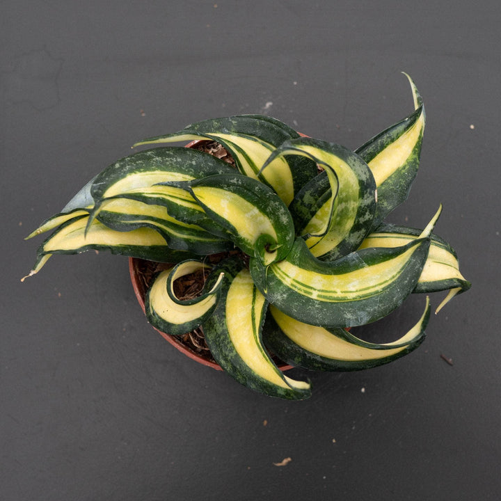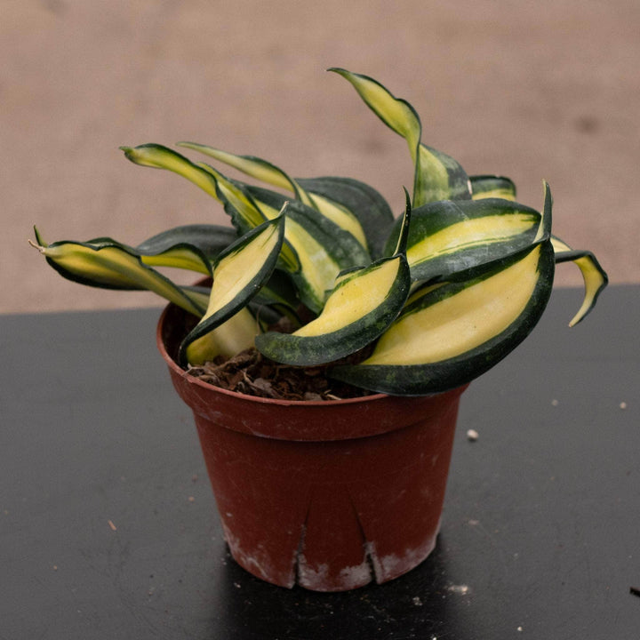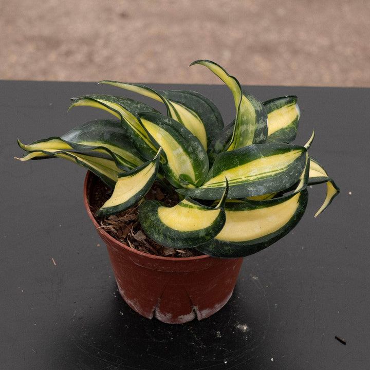 Sansevieria 'Golden Wendy' features striking yellow and green variegated leaves arranged in a rosette with a compact growth habit.