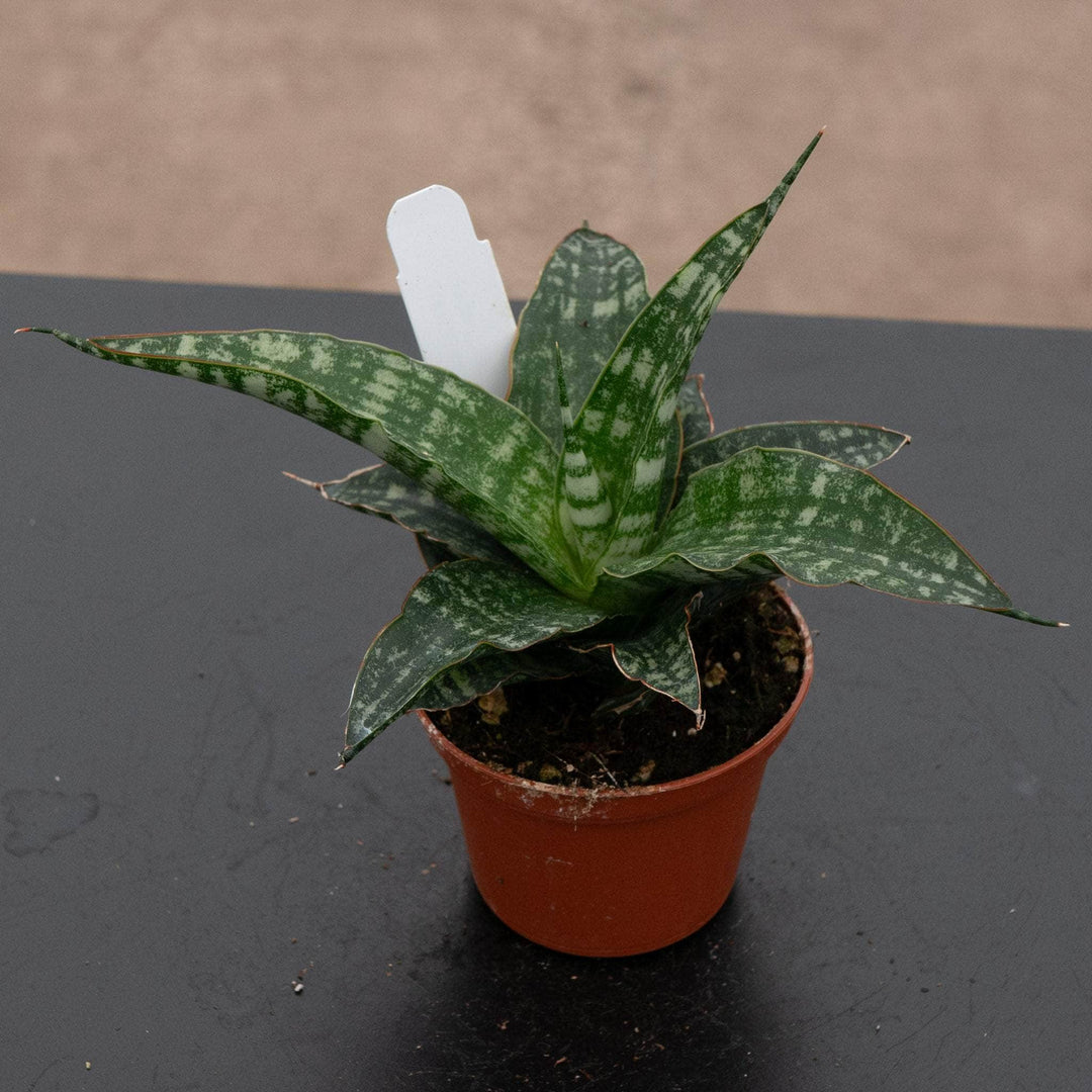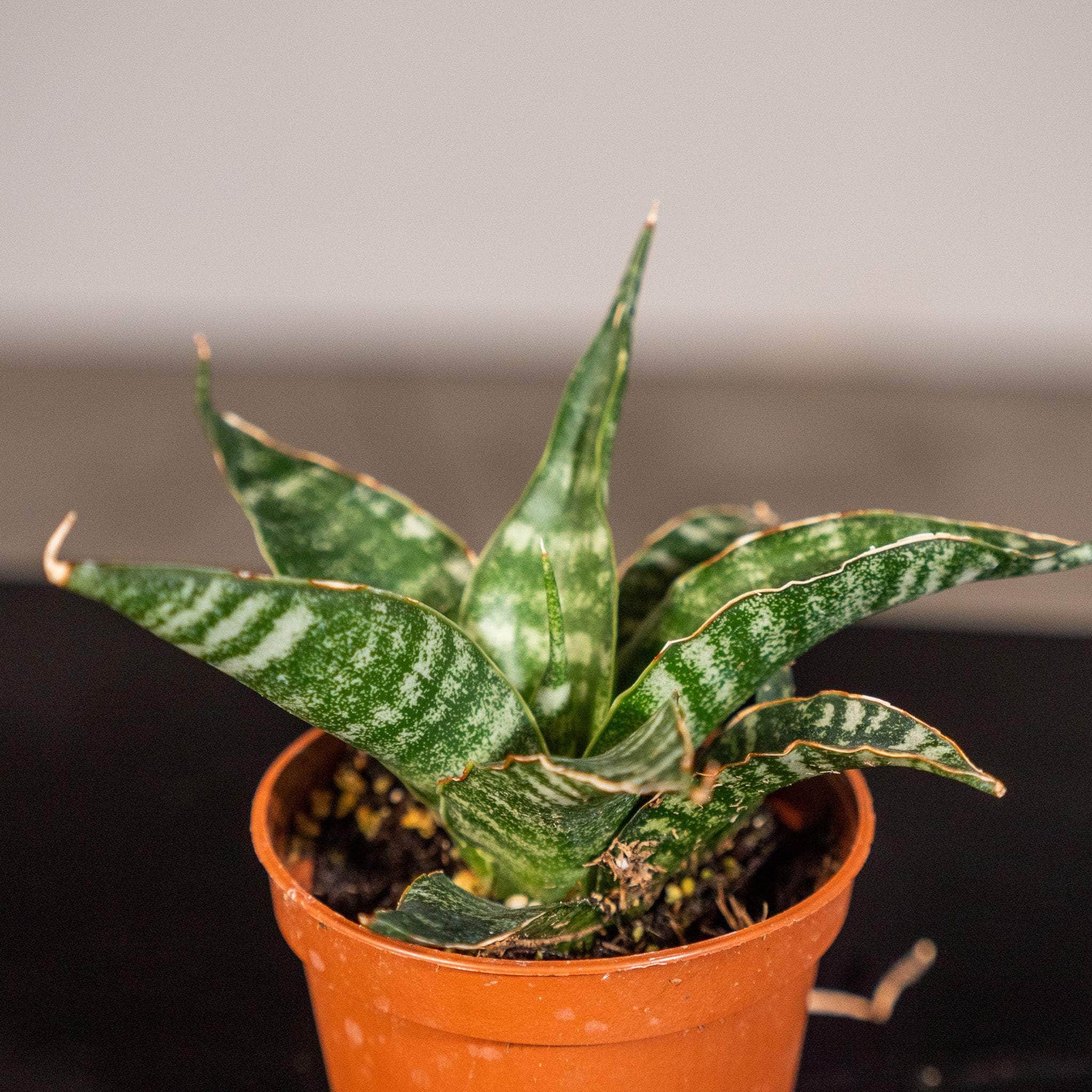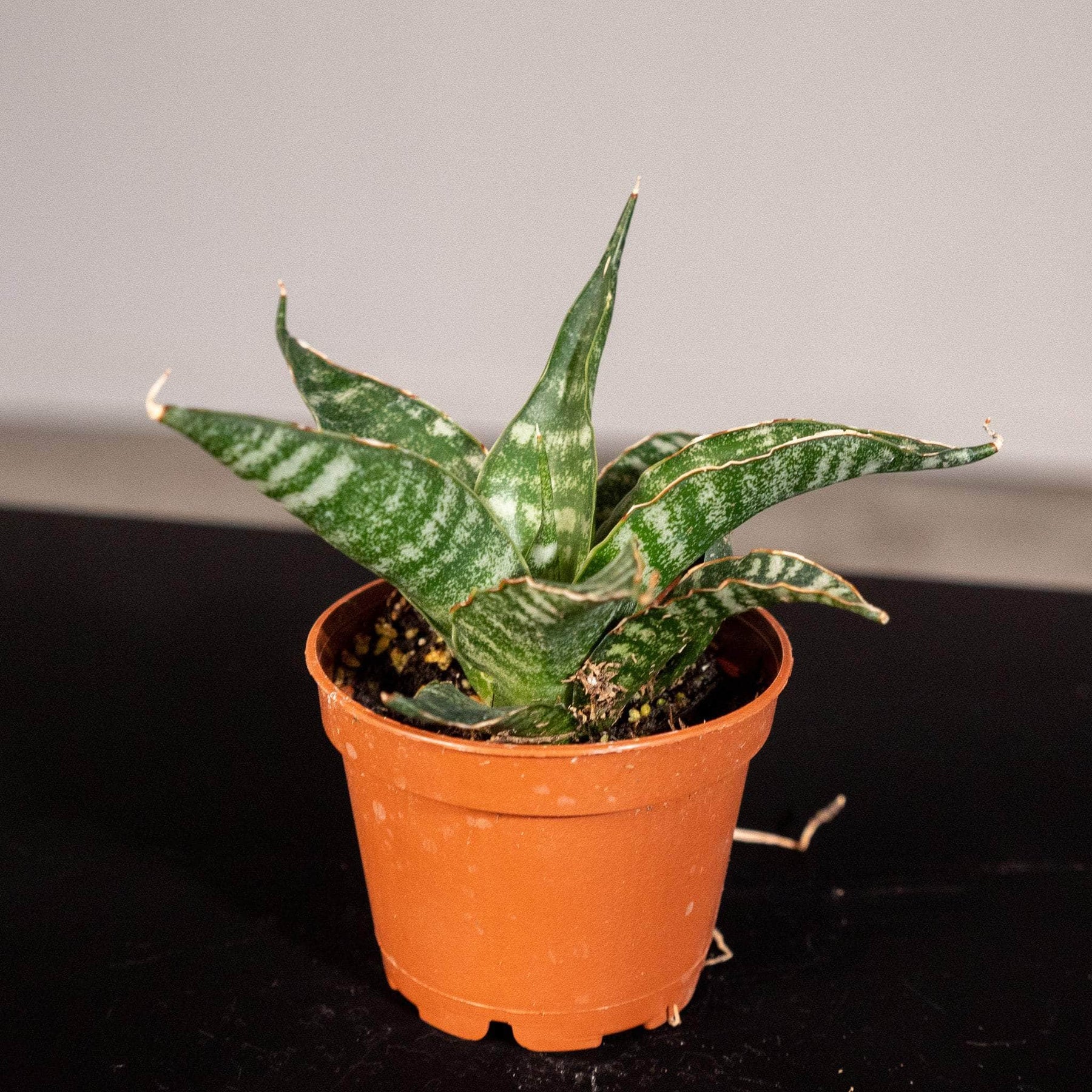 New adorable dwarf sansevieria has horizontal tiger stripes on its foliage! Sansevieria are known for being a GREAT house plant. Commonly referred to as Snake Plant. They do well with light watering. Within the average house environment, Sansevieria only need to be watered every other week or so. Be sure the soil is almost entirely dry before fully watering the plant again. They don't mind stagnant air, which lends to their ease in home environments. They do well in a moderately wide range of lighting conditions but they enjoy moderate lighting the most.