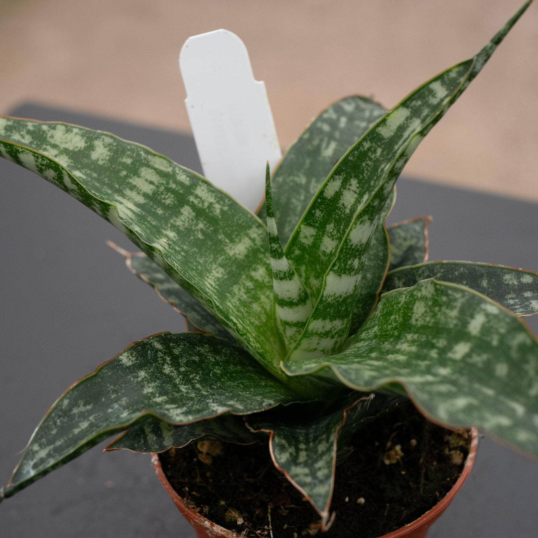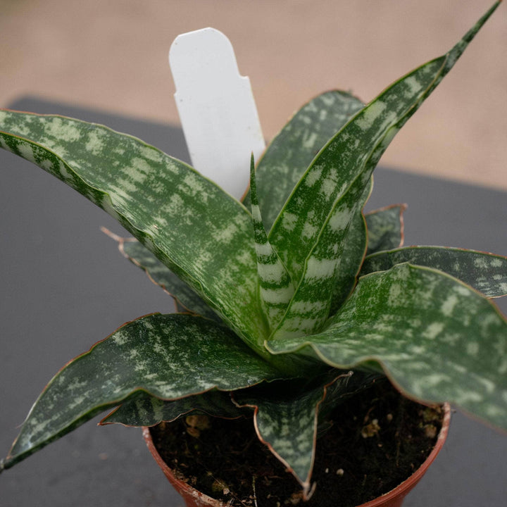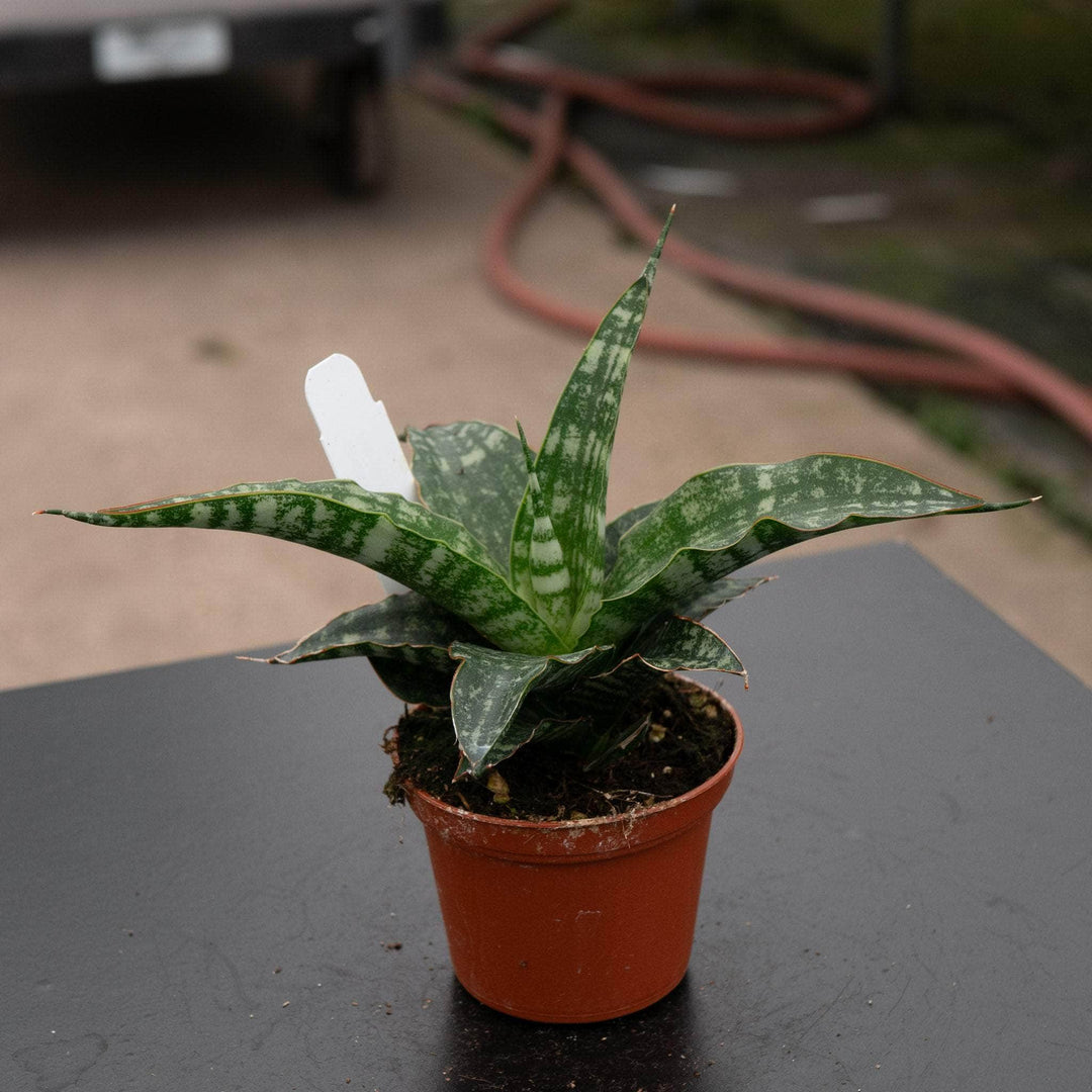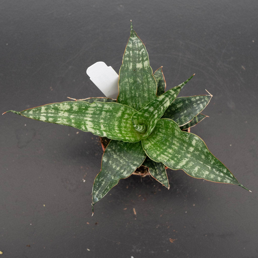 New adorable dwarf sansevieria has horizontal tiger stripes on its foliage! Sansevieria are known for being a GREAT house plant. Commonly referred to as Snake Plant. They do well with light watering. Within the average house environment, Sansevieria only need to be watered every other week or so. Be sure the soil is almost entirely dry before fully watering the plant again. They don't mind stagnant air, which lends to their ease in home environments. They do well in a moderately wide range of lighting conditions but they enjoy moderate lighting the most.