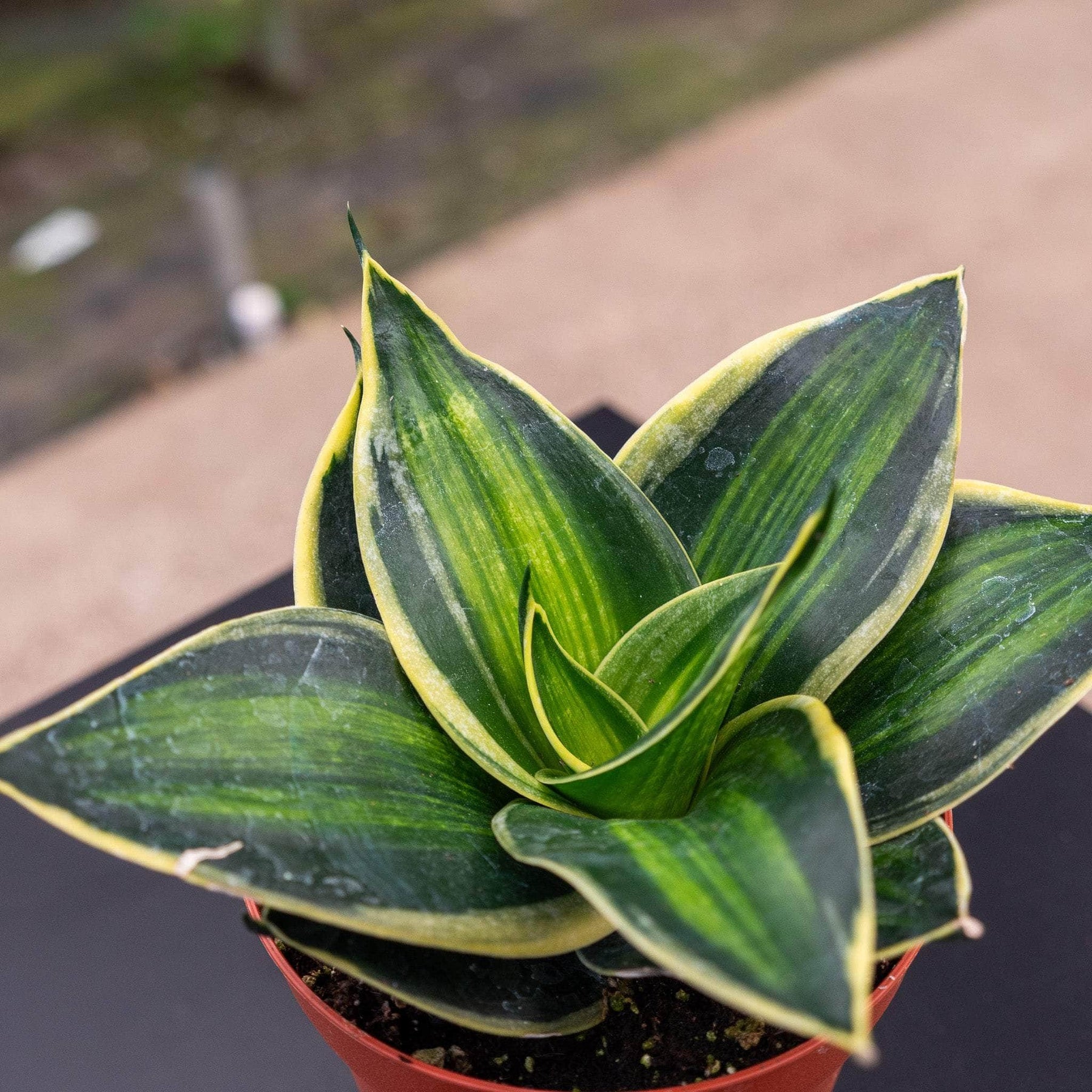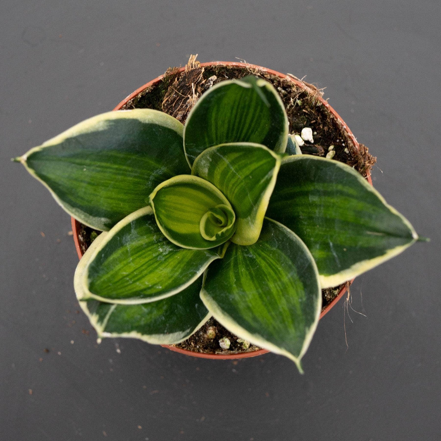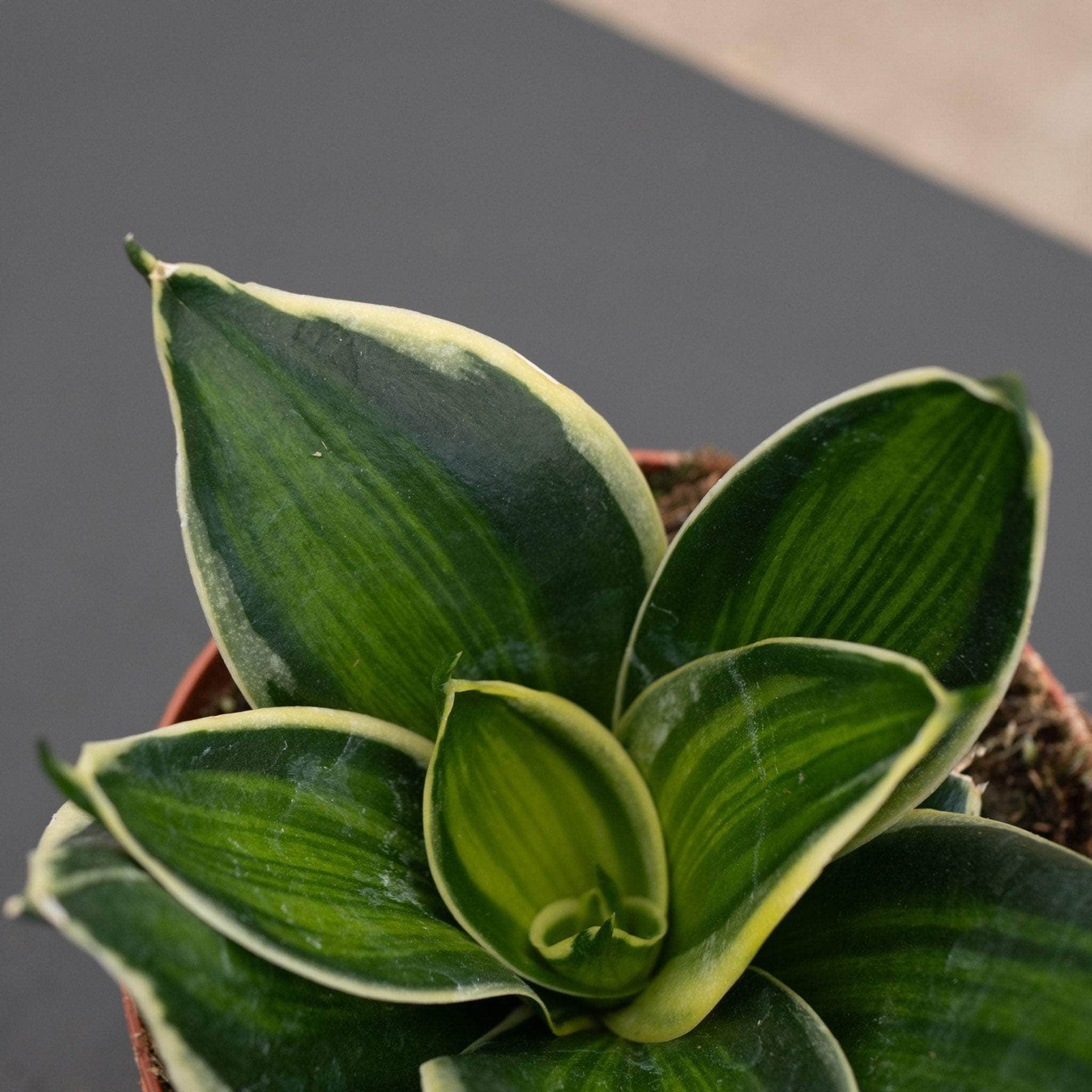 Sansevieria are known for being a GREAT house plant. Commonly referred to as Snake Plant. They do well with light watering. Within the average house environment, Sansevieria only need to be watered every other week or so. Be sure the soil is almost entirely dry before fully watering the plant again. They don't mind stagnant air, which lends to their ease in home environments. They do well in a moderately wide range of lighting conditions but they enjoy moderate lighting the most.