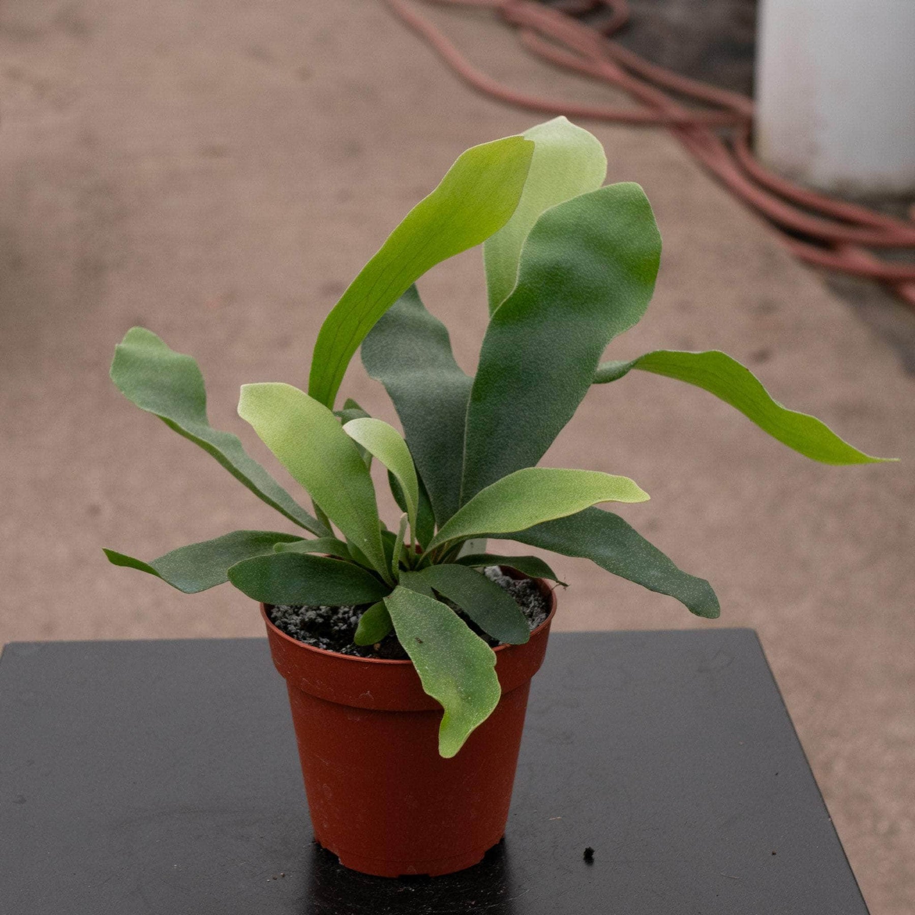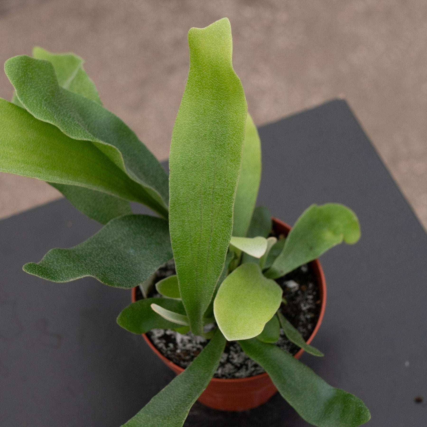 Platycerium is a genus of epiphytic ferns known for their uniquely shaped fronds. They have tufted roots growing from a short rhizome that produces two types of fronds - basal fronds, which act as a shield and protect the roots, and fertile fronds arching out from the rhizome, which are antler shaped and bear spores on the undersides. These plants enjoy bright, indirect light. This plant does not like to dry out, so water it often but make sure the soil does not become soggy either