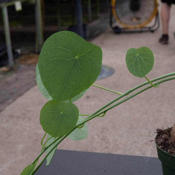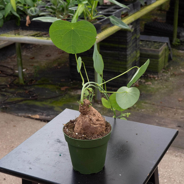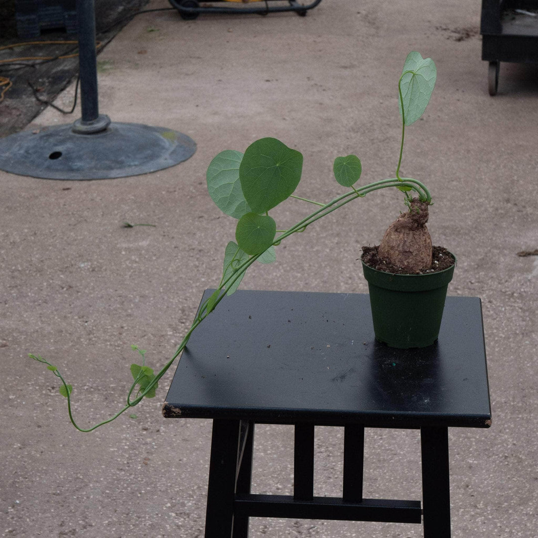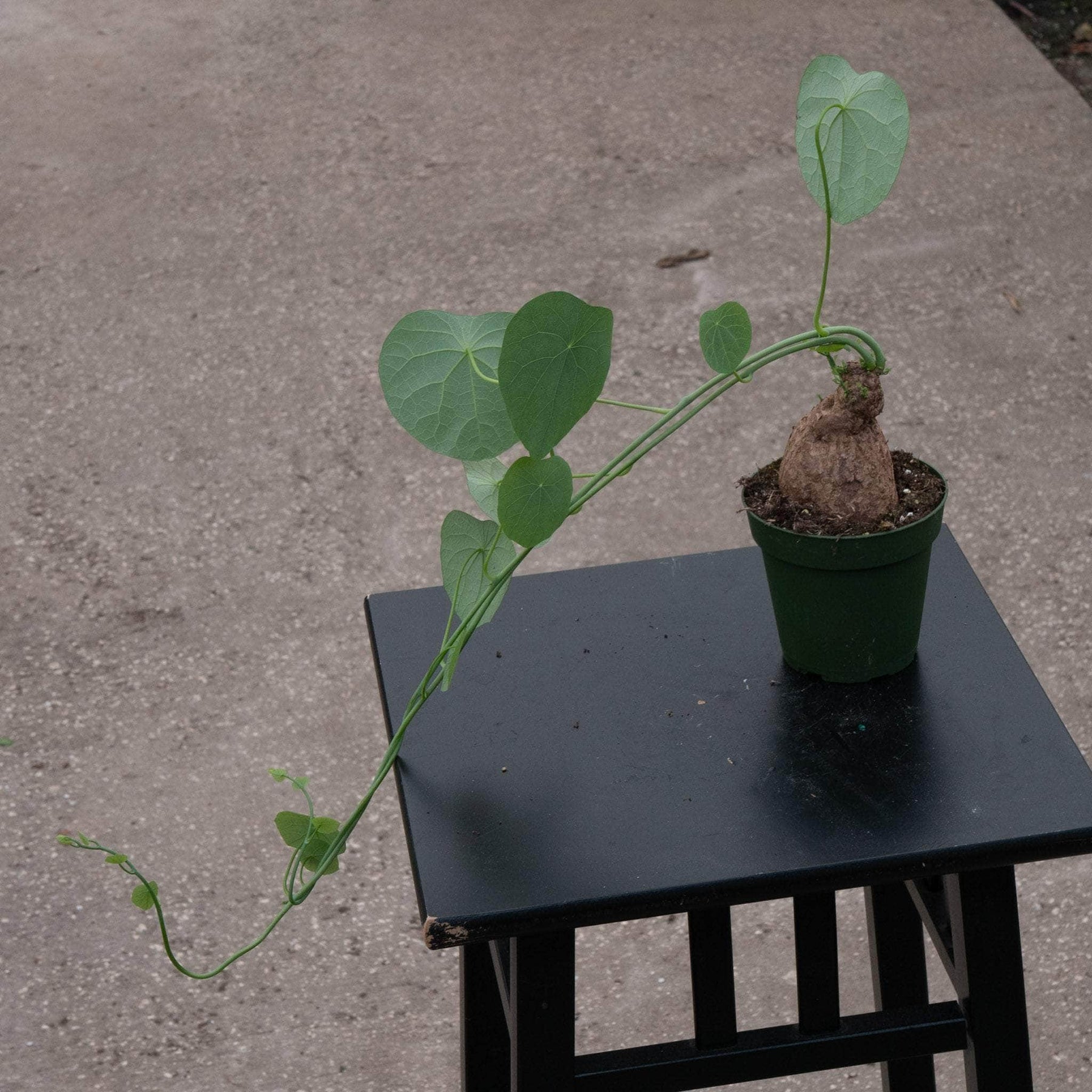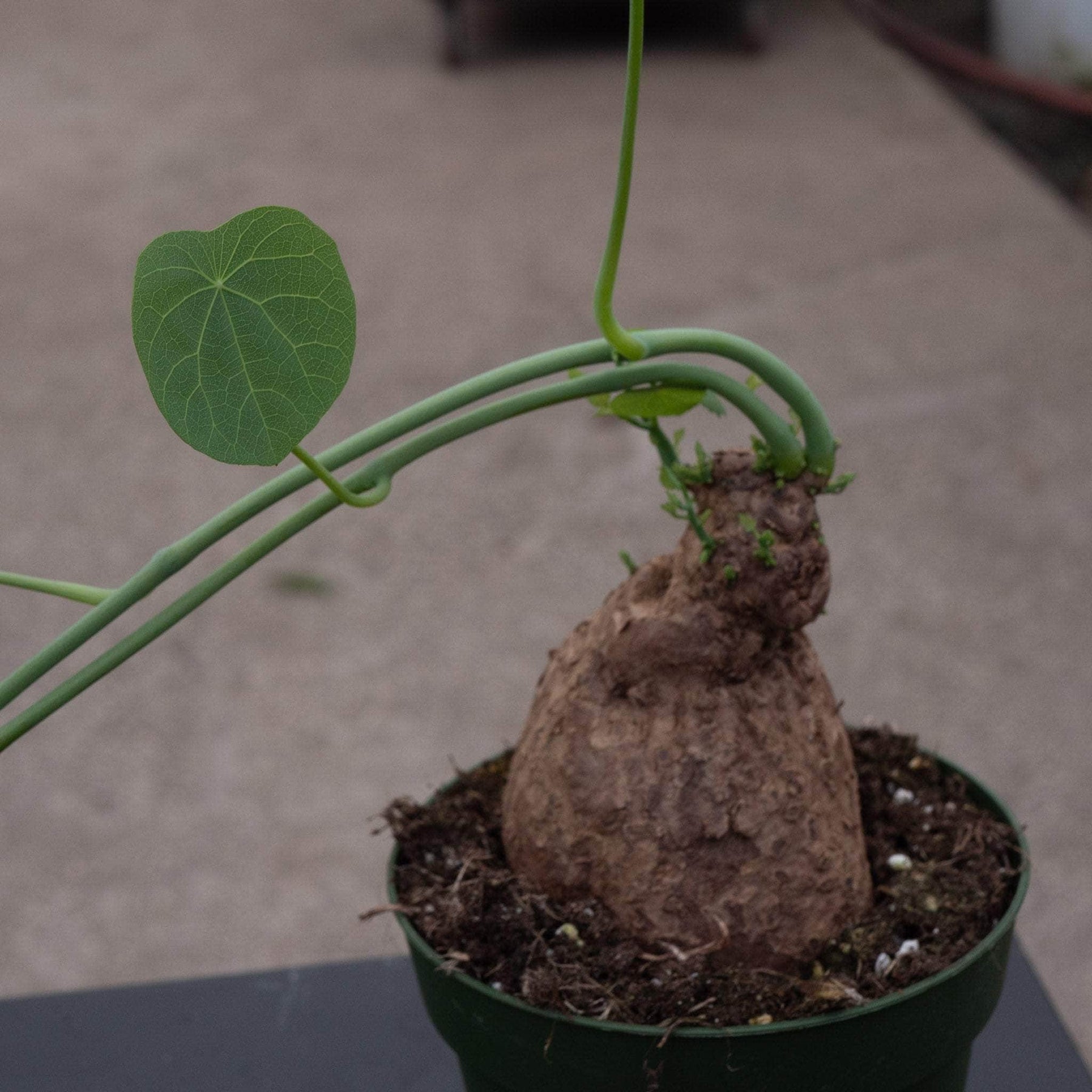 Stephania erecta is found primarily in the dry forests of Cambodia and Thailand, growing in well drained soil with some direct sun. The vines can reach up to 12' long! The genera is named in honor of Stephan Ladislaus Endlicher, 1804-1849, an Austrian botanist who formulated a major system of plant classification. The species name means 'cork bark' after the textured caudex.
