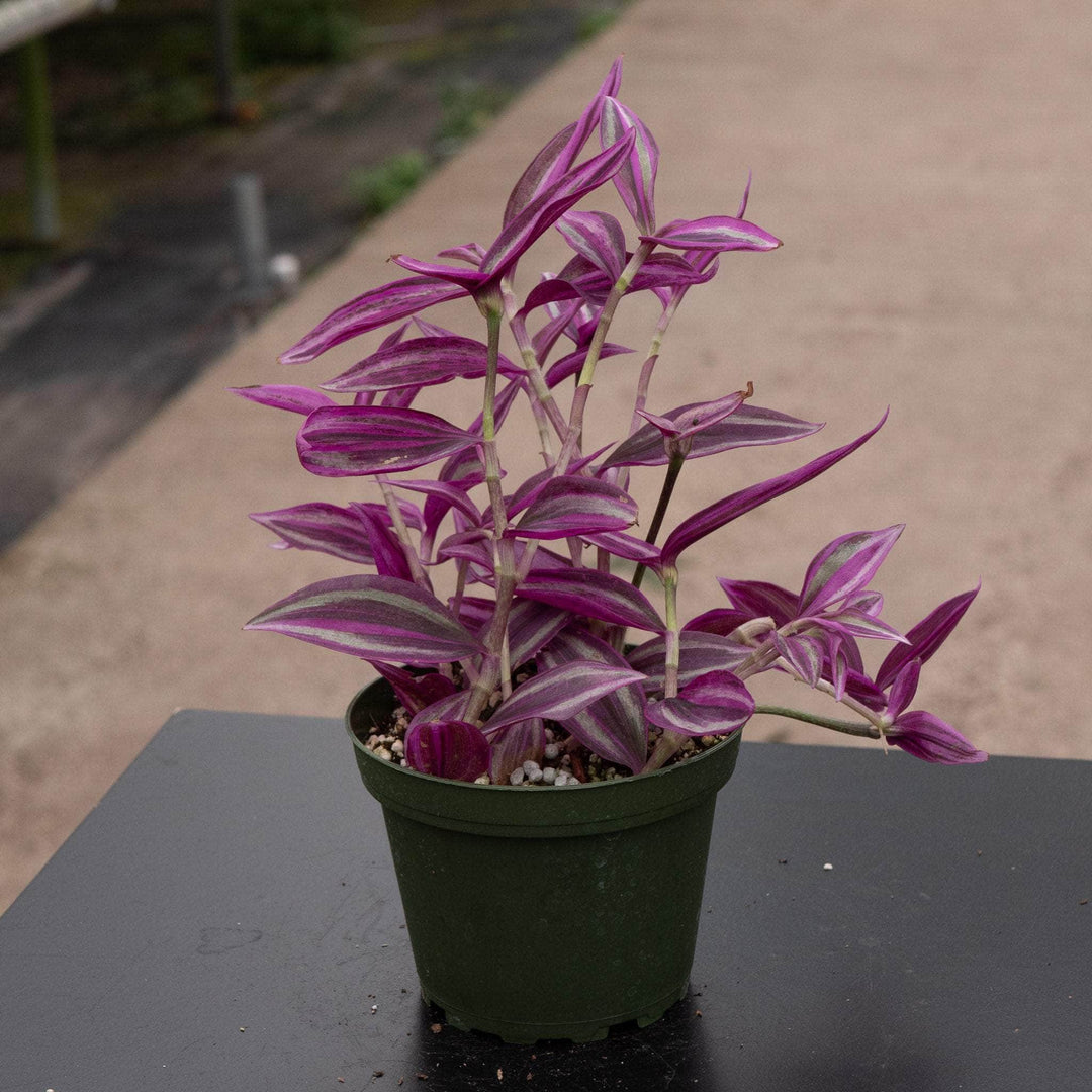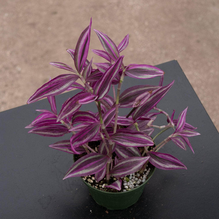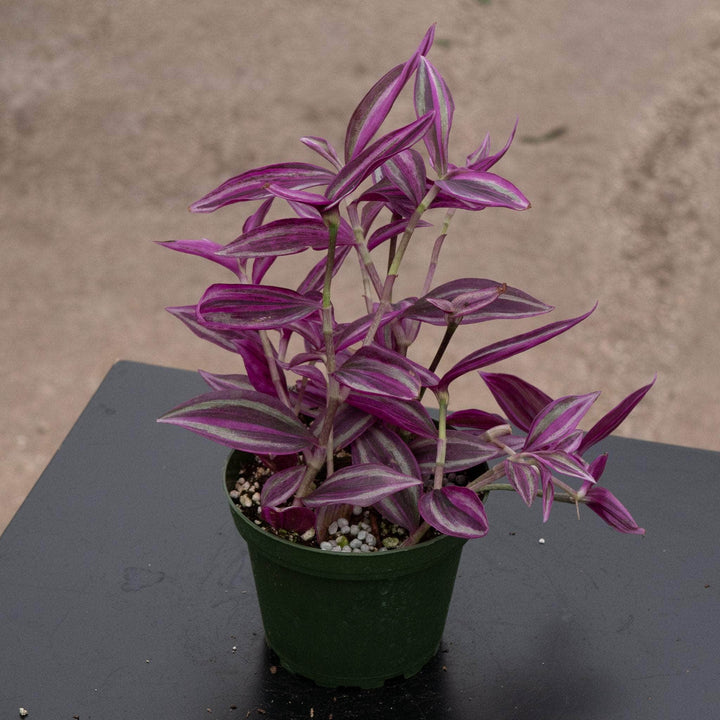 Tradescantia zebrina 'Pink Paradise' foliage is striped with hot pink, purple and silver-gray with purple undersides. Popular as a houseplant in a hanging basket or cascading over the edge as the spiller in a combination planter. Tolerates a wide range of growing conditions and lighting, from a few hours of direct early morning or late afternoon sun where its colors will be the most vibrant, to filtered light where its color contrast will be a bit more subdued. Water lightly when top 1" feels dry to the touch. Appreciates evenly moist soil during the growing season, but does not like soggy soil where it is prone to rot.